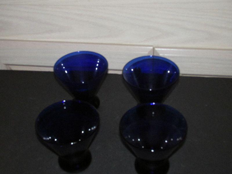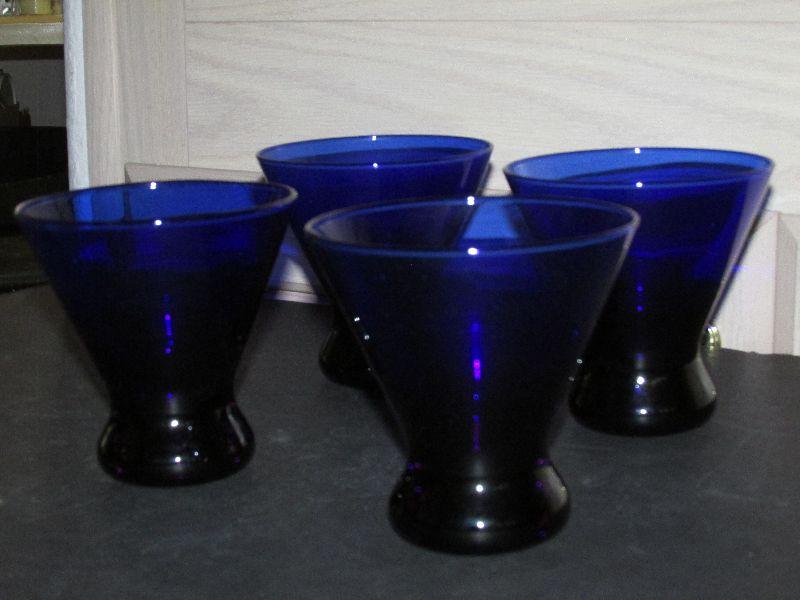 Depression Glass cobalt blue stemless martini glasses. Collection of four. No chips or cracks.