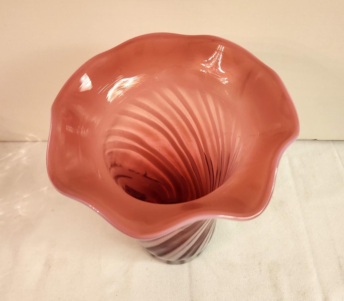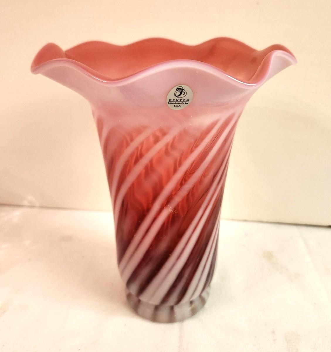 Fenton Art Glass Cranberry Swirl vase, has label, 7.75" tall - ruffled edge. Good condition.