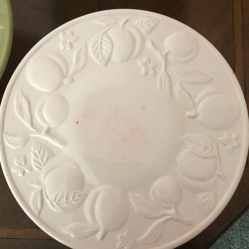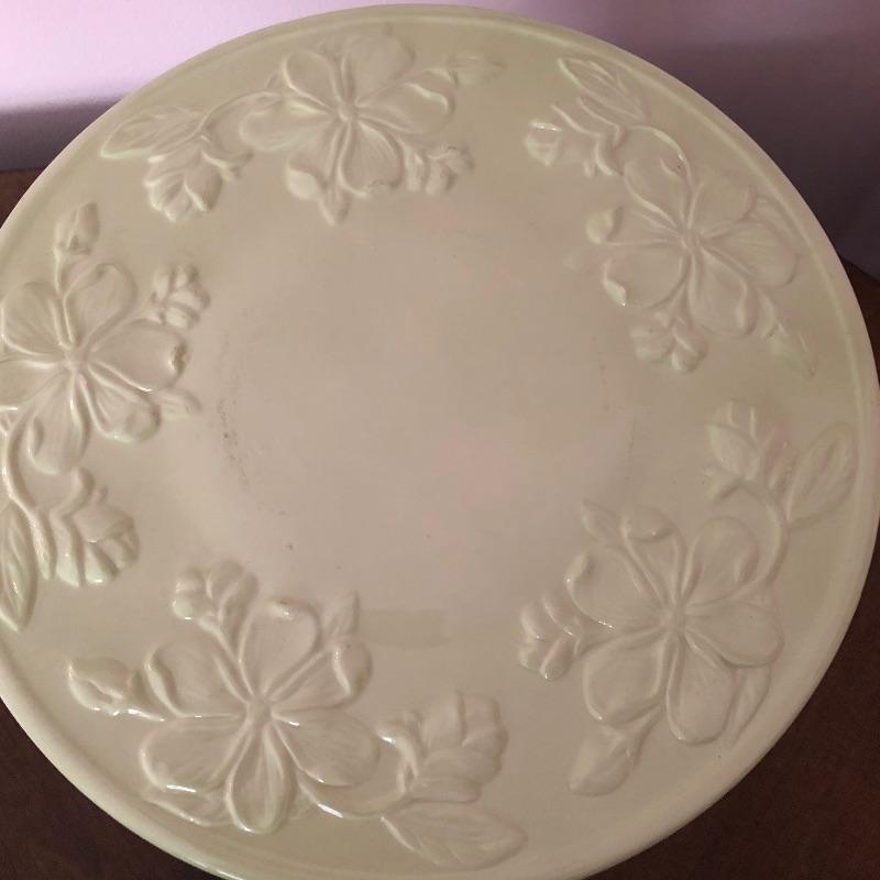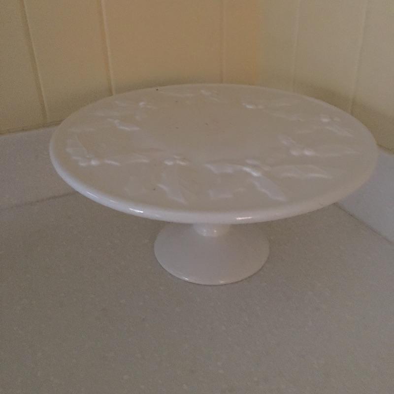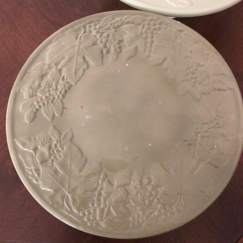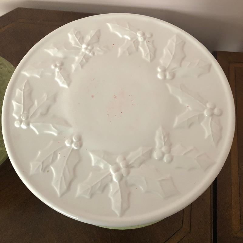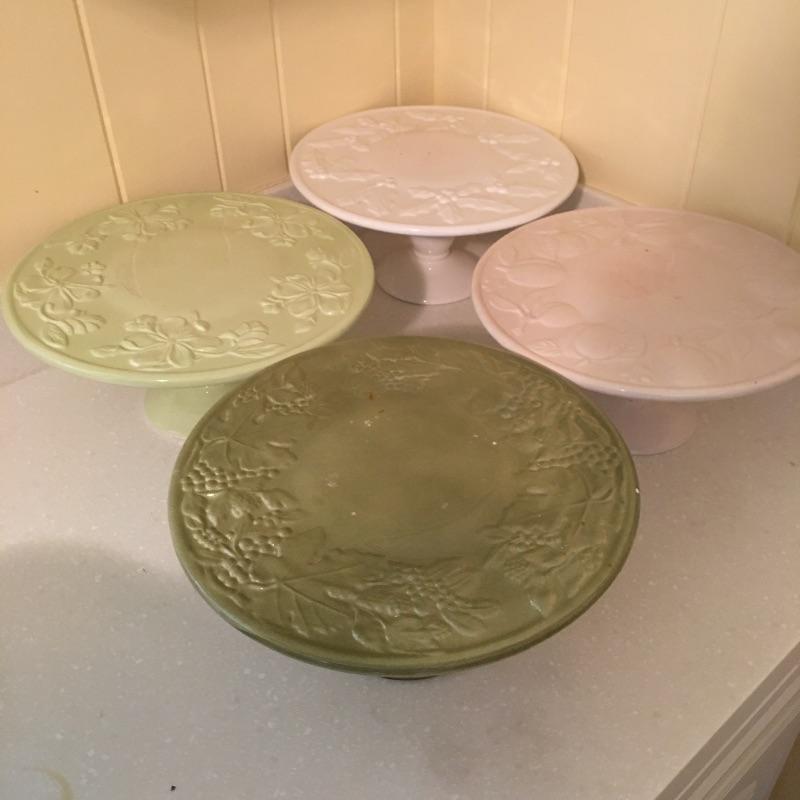 Four cake platters include two cream colored and two shades of green platters. Be ready for the holidays with this collection of cake platters. Cake platters measure 11”D x 5” tall.