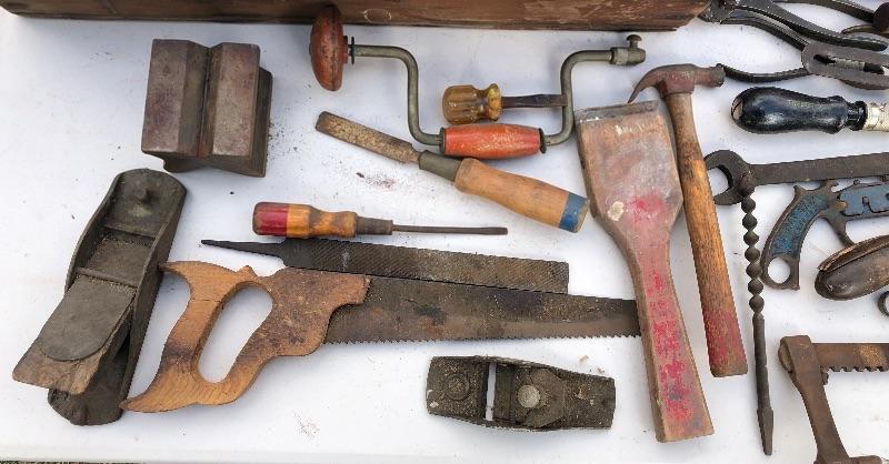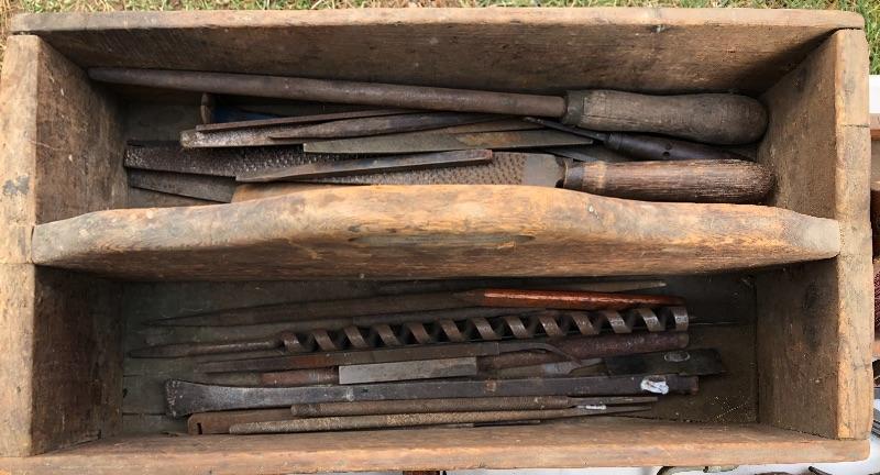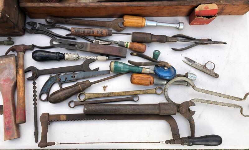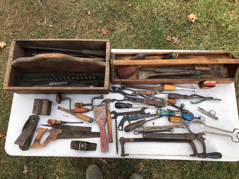 Two vintage wooden tool boxes and assorted tools. Craftsman, Millers Falls, Bonney, Ultra, K&F, Nicholson, Herbrand, Eberly, Red Devil, etc. MM Please see all pictures for content of the lot, condition of the lot, and measurements if taken. Pictures are the best representation of the items listed and items are untested unless indicated in description. Thank you for looking and have fun bidding!