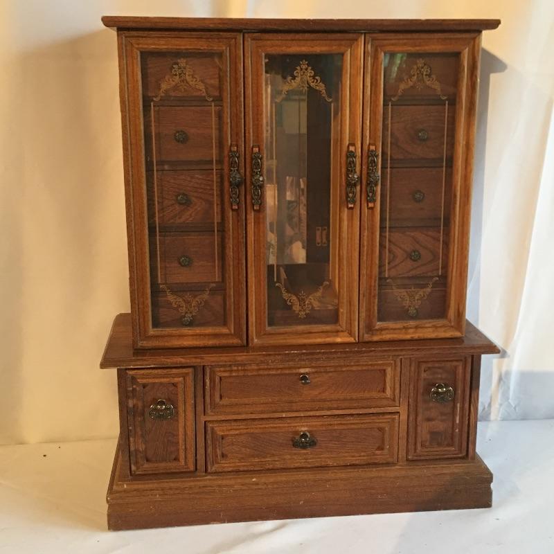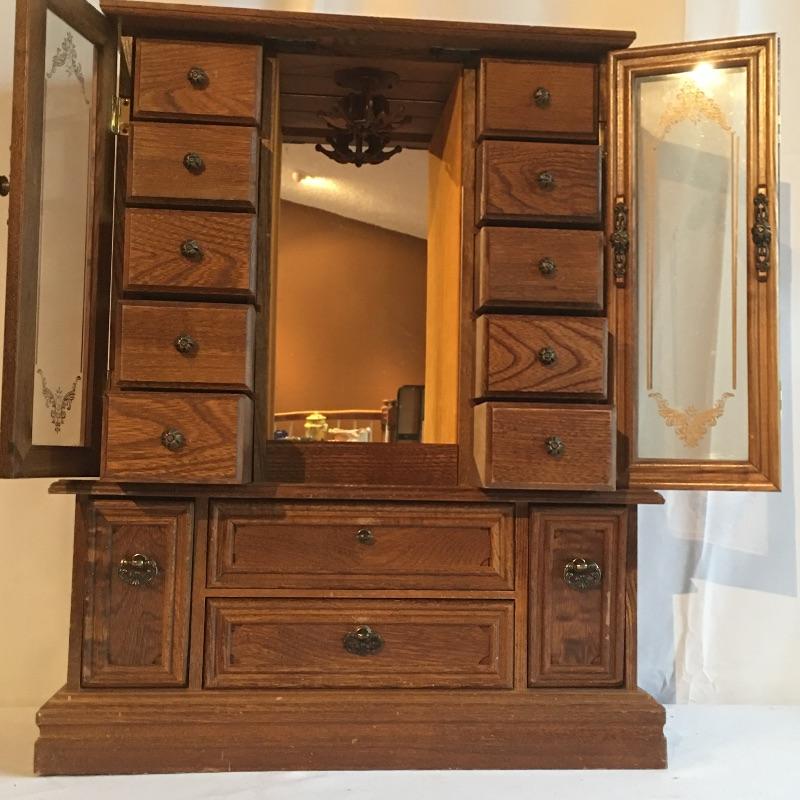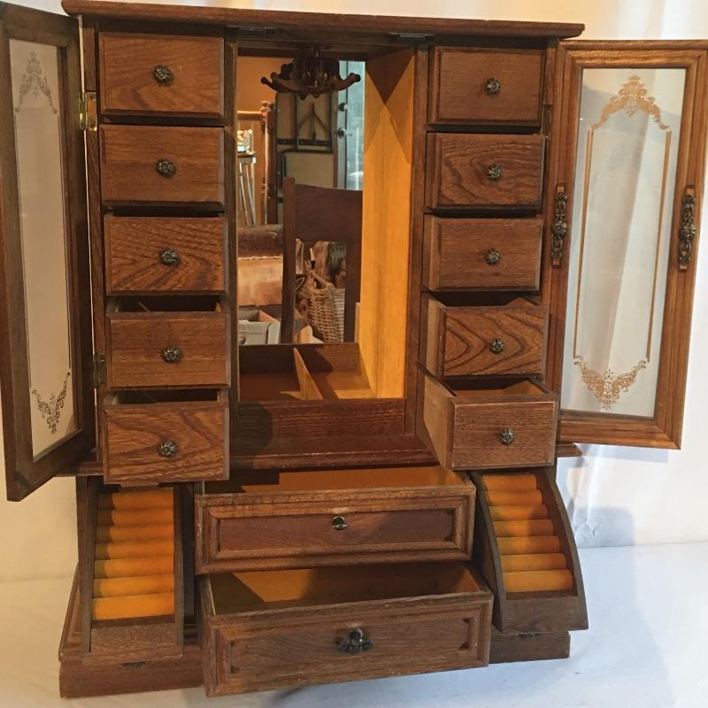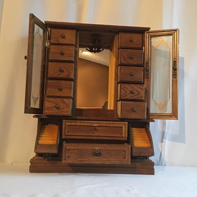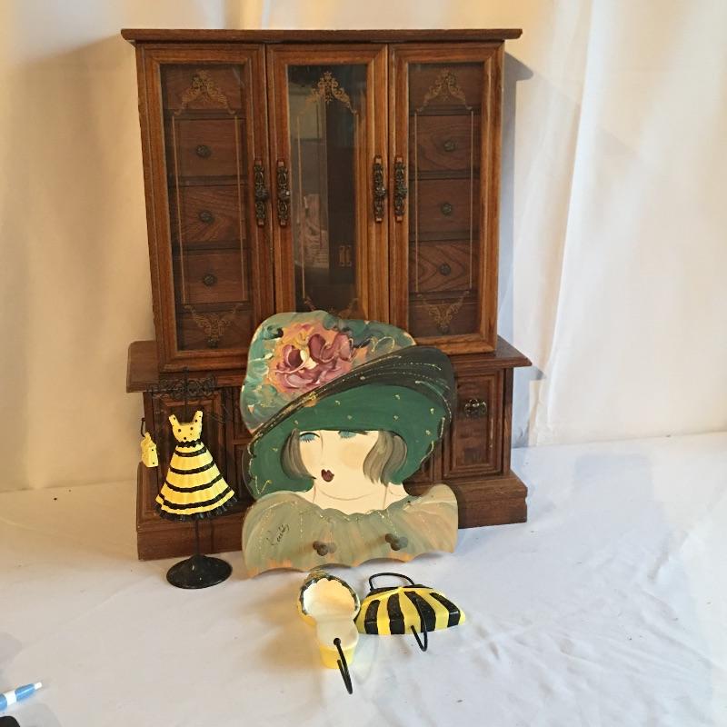 A jewelry box for the person with a large collection of jewelry. This box has ten small drawers on top with a necklace hanger, two larger drawers on the bottom and two pull down ring holders. Also includes wooden painted lady with two hooks, purse and shoe hook and a dress jewelry hanger.
