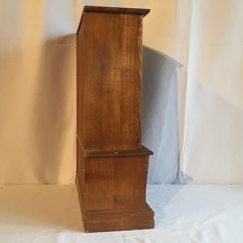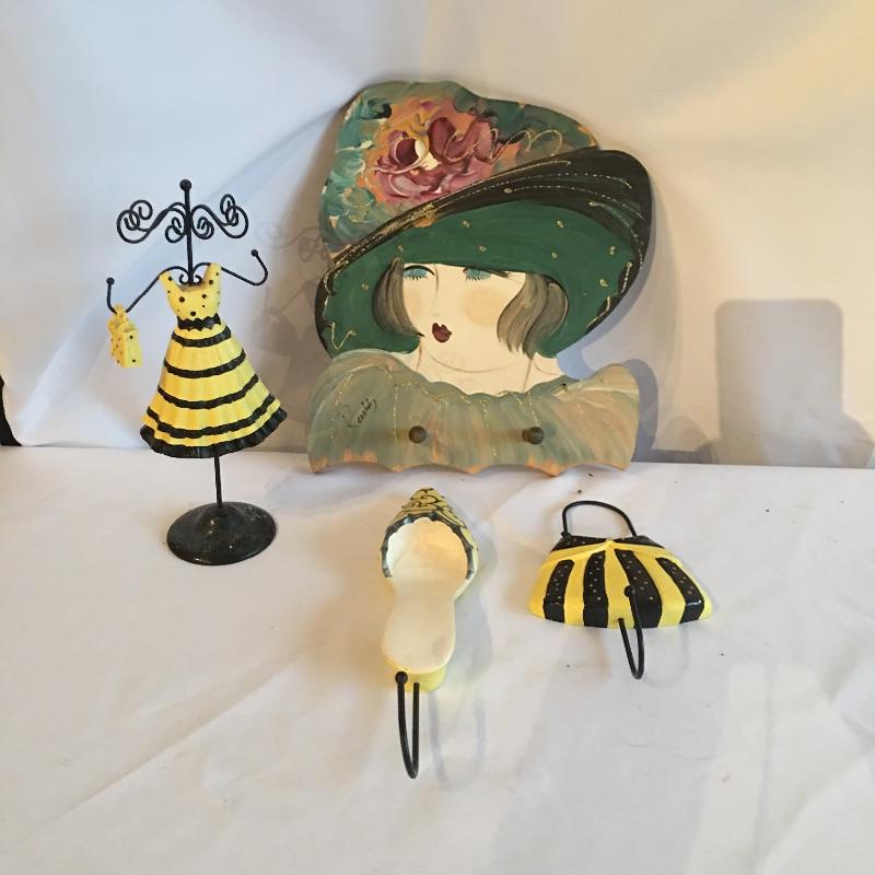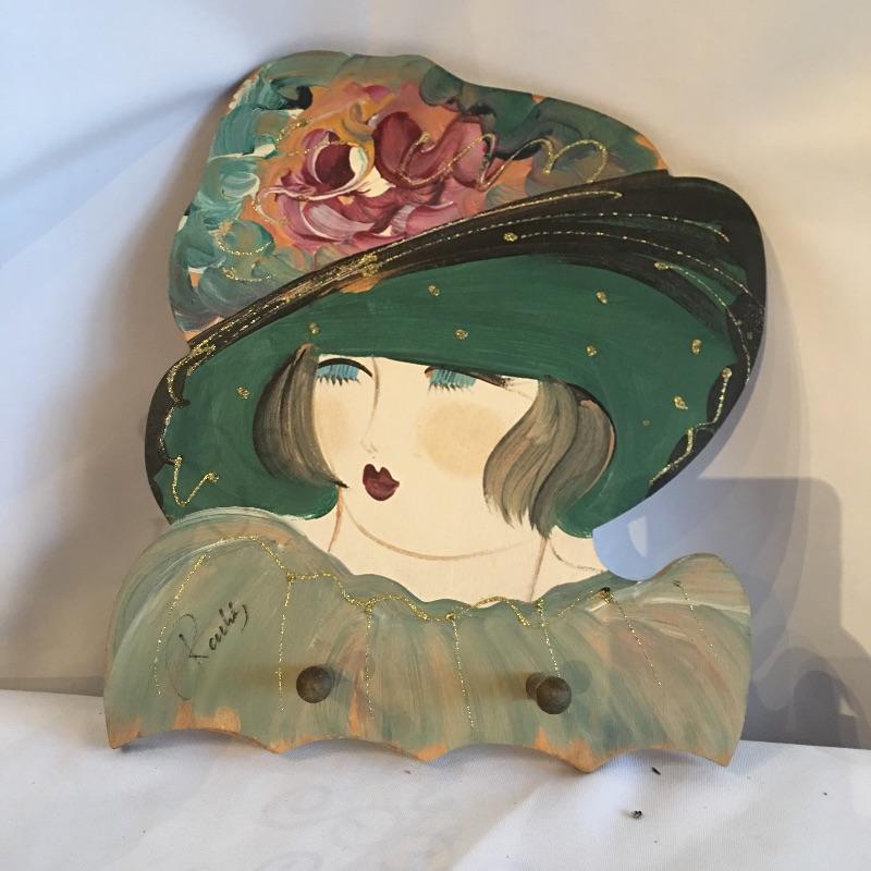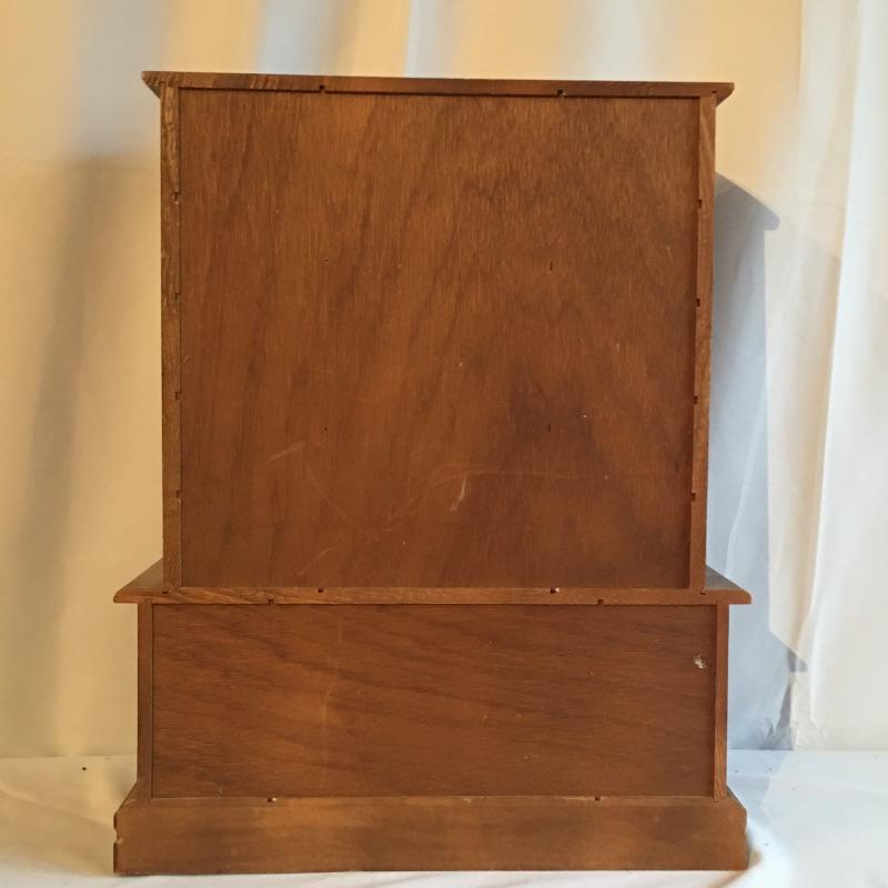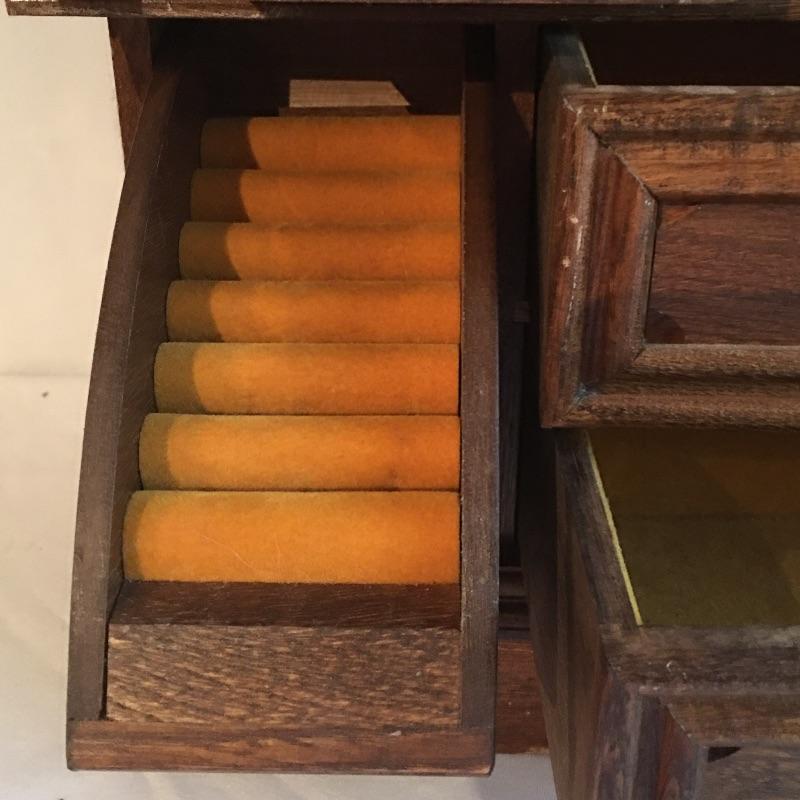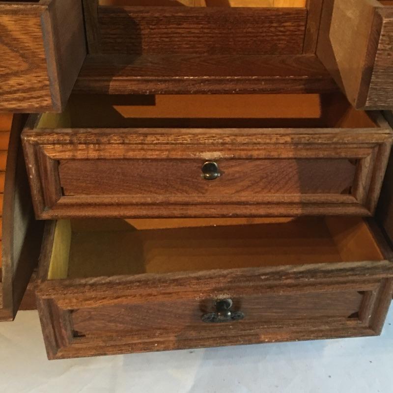 A jewelry box for the person with a large collection of jewelry. This box has ten small drawers on top with a necklace hanger, two larger drawers on the bottom and two pull down ring holders. Also includes wooden painted lady with two hooks, purse and shoe hook and a dress jewelry hanger.
