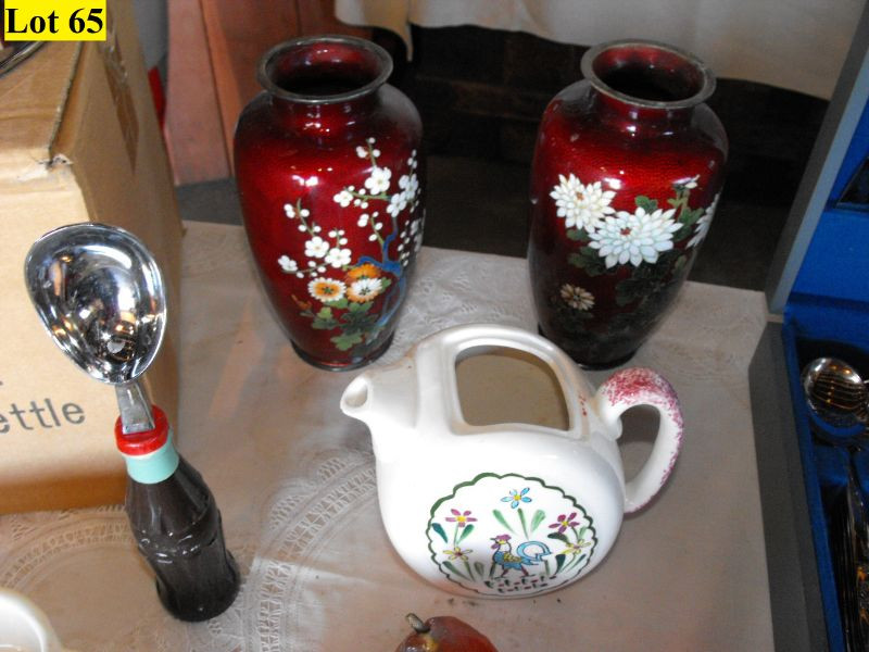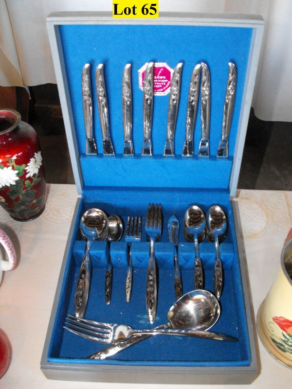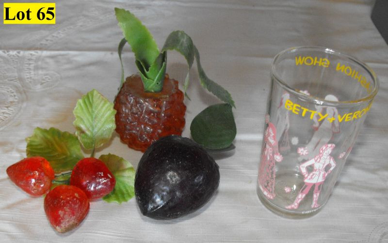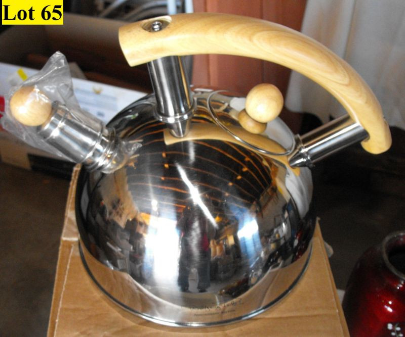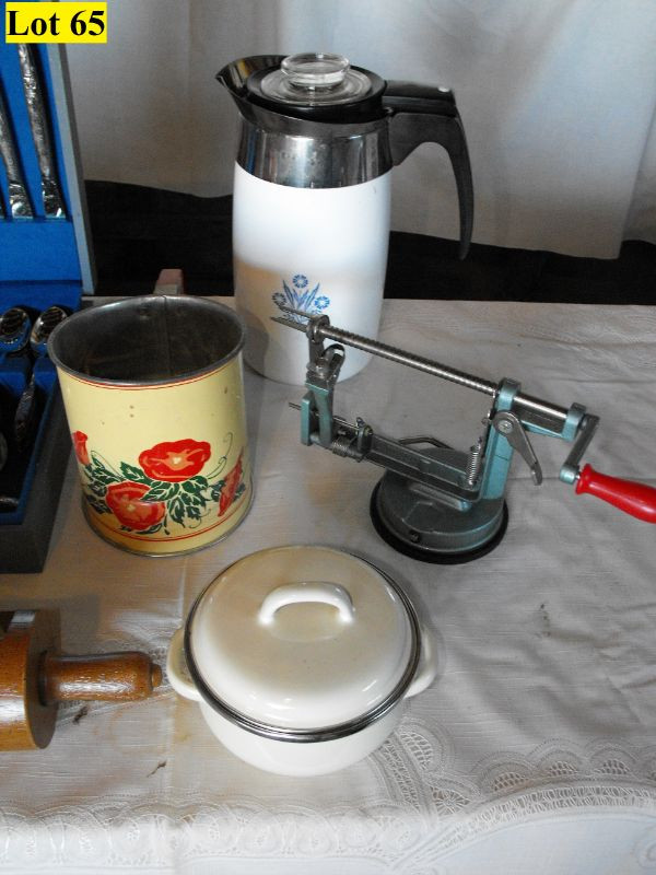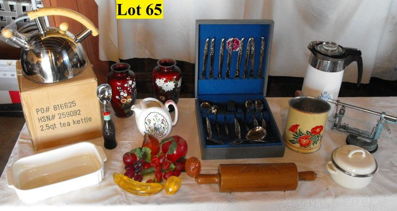 New Wooden Handle Tea Kettle, Plastic Fruit, Rooster Pitcher, Cola Ice Cream Scoop, Armack Stainless Steel Flatware in Chest (service for 8) Rolling Pen Wall Pocket, Corning Ware Electric Coffee Pot, Vintage Flour Sifter, Apple Peeler, Small Casserole Pan, and Sauce Pan