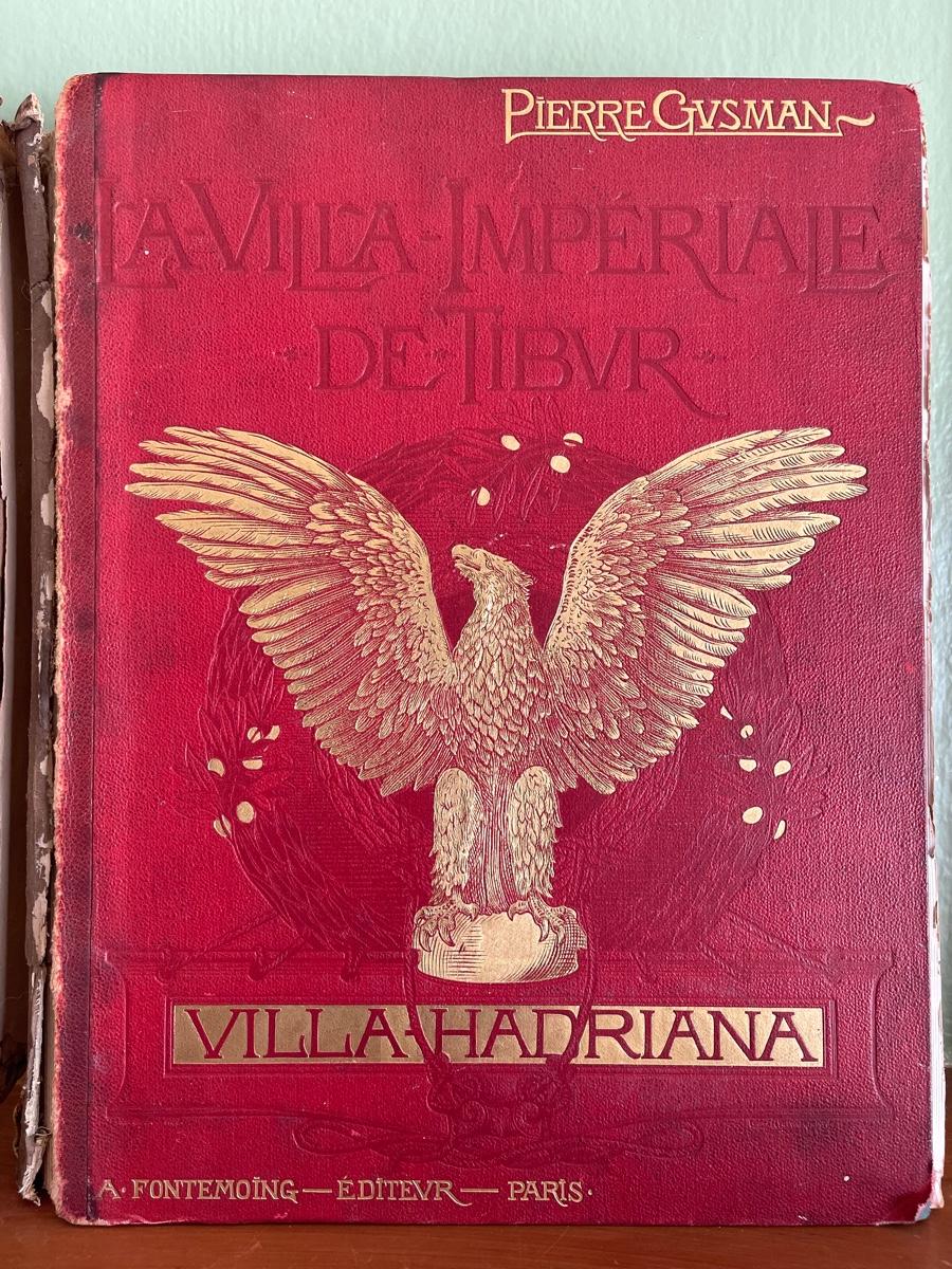 LOT 65 - La Villa Impériale de Tibur - Villa Hadriana by Pierre Gusman. 1904 published in Paris. This book is in French. The book is in acceptable condition due to much wear to the spine and covers. The page edges are gold gilt and are beautiful. This book was part of the David-Pleydell-Bouverie library at Bouverie Ranch in Glen Ellen. This item can be viewed at our Green + Cate Showroom in Sebastopol from July 15th - July 18th between the hours of 9am-5pm. For the benefit of the Bouverie Preserve of Audubon Canyon Ranch.