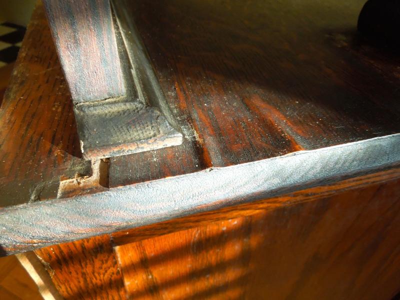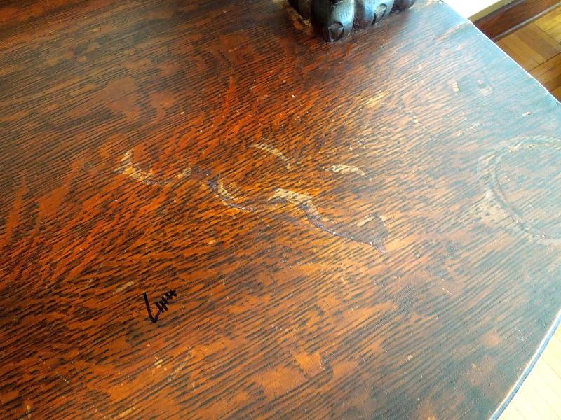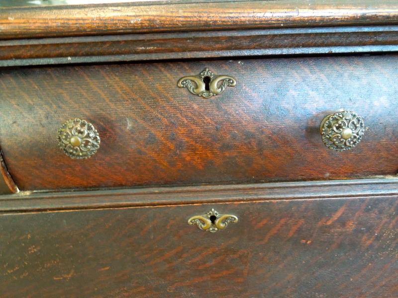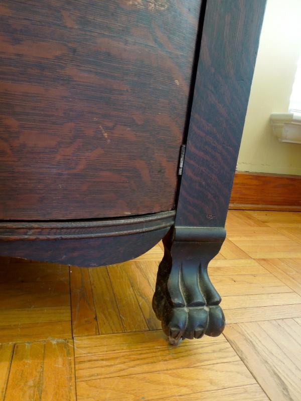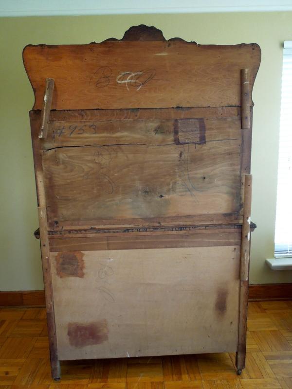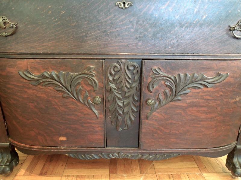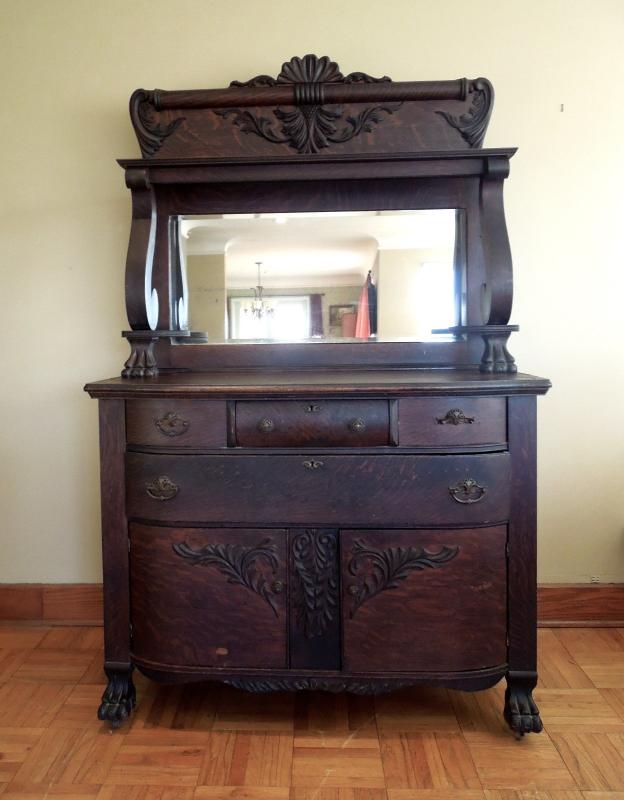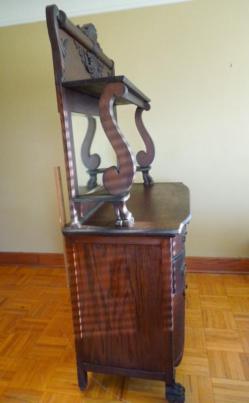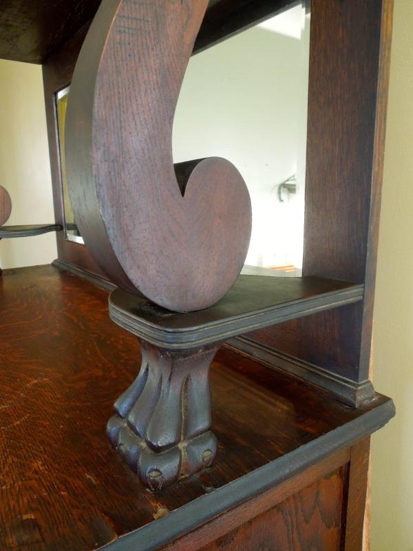 Beautiful carved crest top and doors. Original brass hardware. Posts and legs have griphon feet. Center top drawer is lined in tarnish proof cloth to store silver. Buffet top is scratched and stained. Side of top has 3" ripple near back along edge. All hinges work. Mirror is beveled and shows age in spots. 49" L x 24" W x 80" H. 38" H to top of counter. Three pieces.