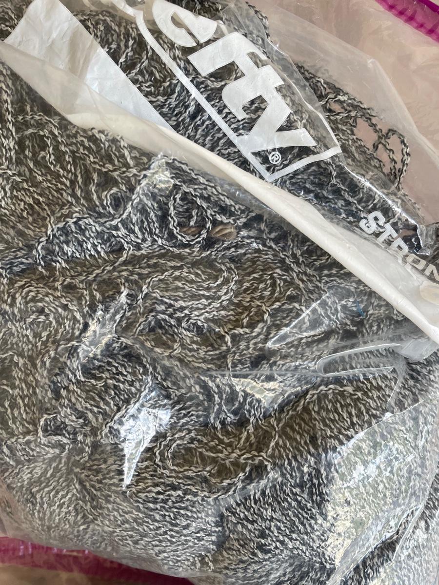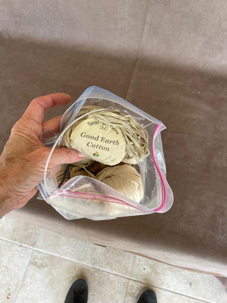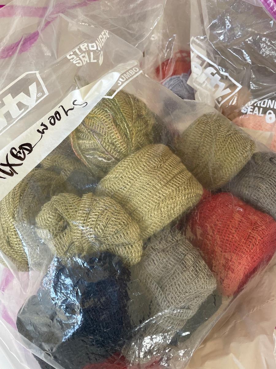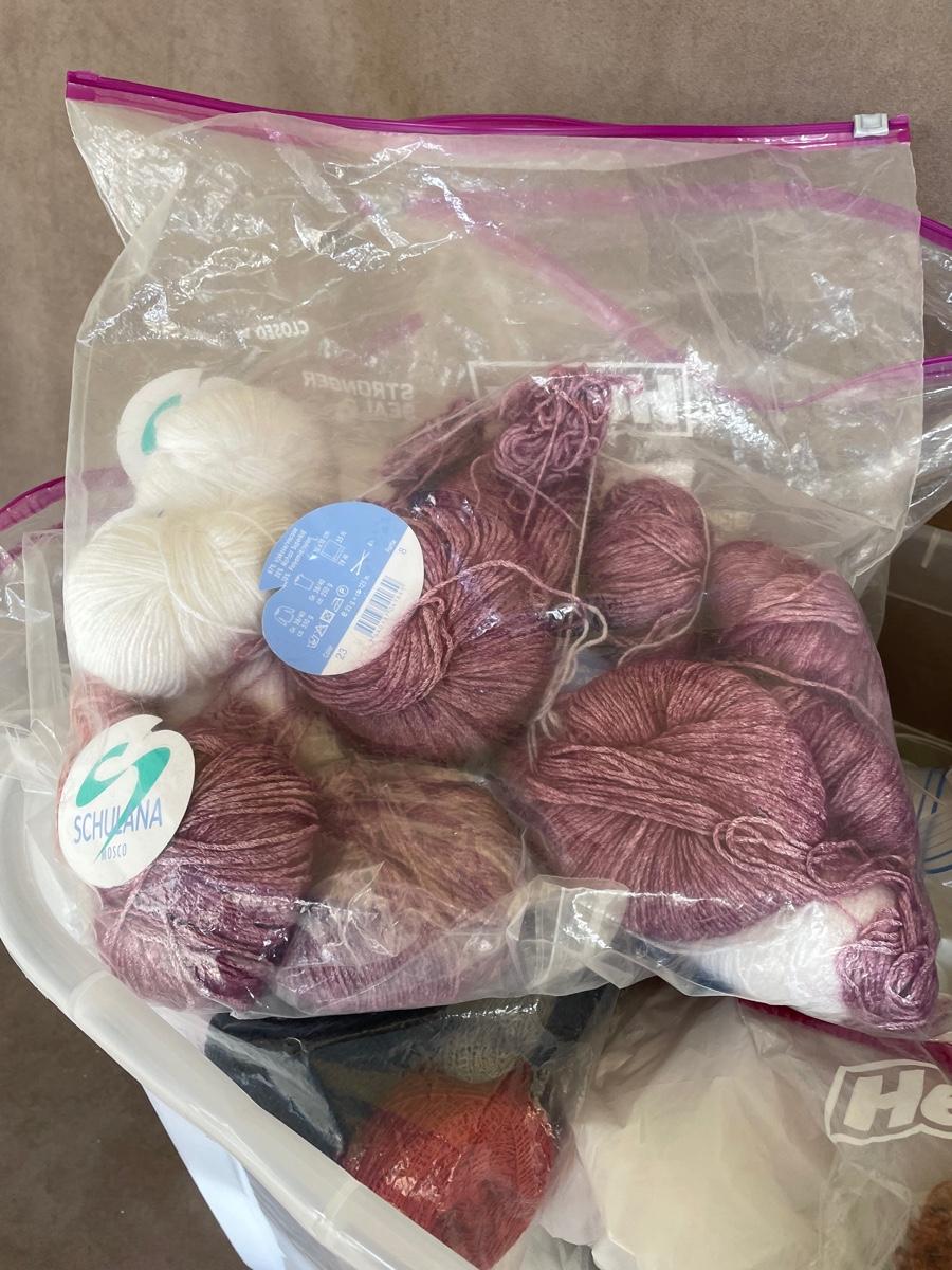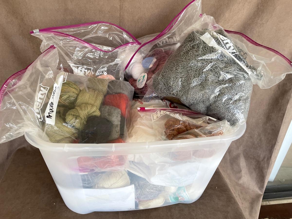 Big bin full of skeins of high-end interesting types of yarn for hand knitting