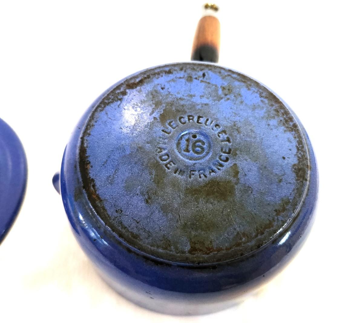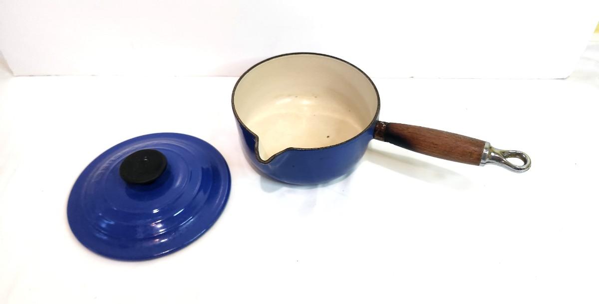 Blue Le Creuset #16 Saucepan with Pour Spout. Note: handle has a bit of a burn mark near connection point. 3" tall. Gently used.