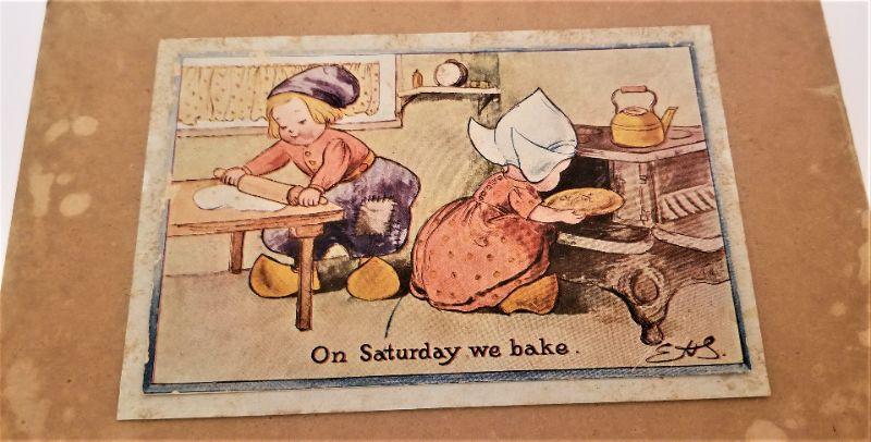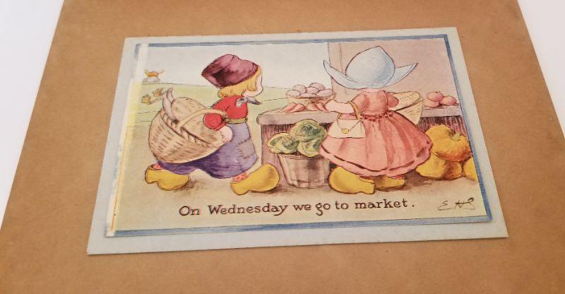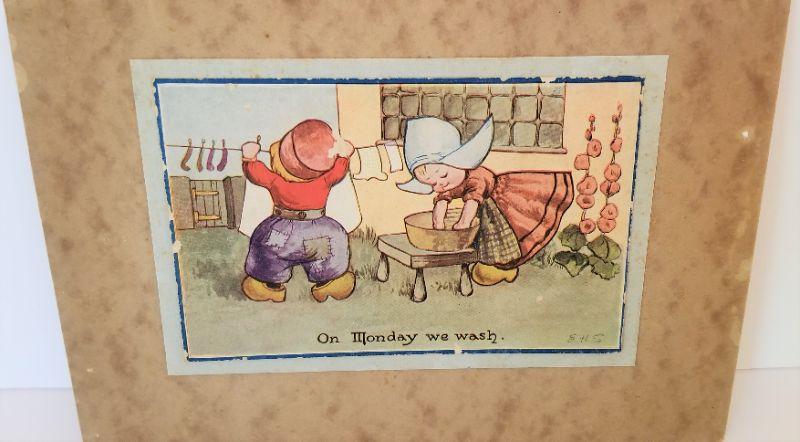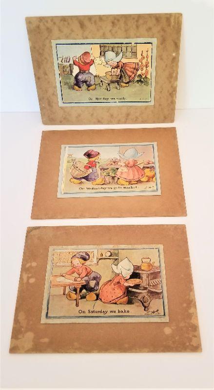 Three sweet little antique day of the week prints, mounted on cardboard. Monday is Wash day, Wednesday is Market day, and Saturday is Bake day. Each measures 6.5" x 8.5" Would look great framed.