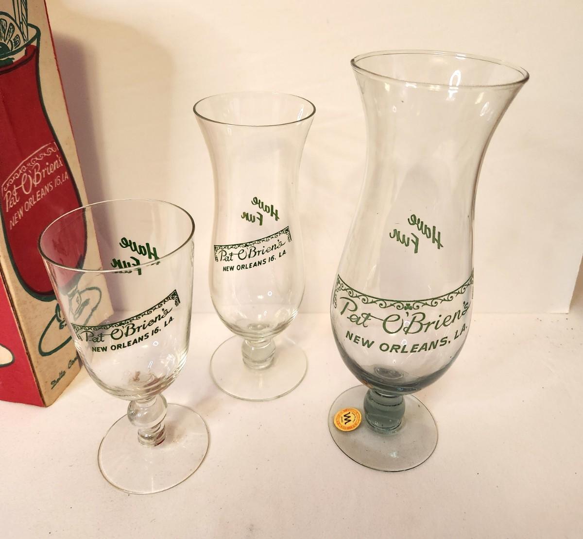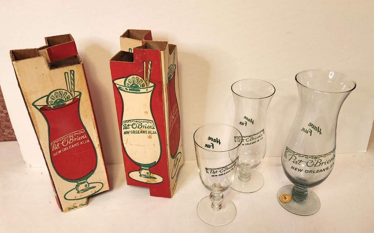 Lot of 5 vintage Pat O'Brien's glasses - One has old sticker - two are odd sizes that are not offered anymore. Good condition.