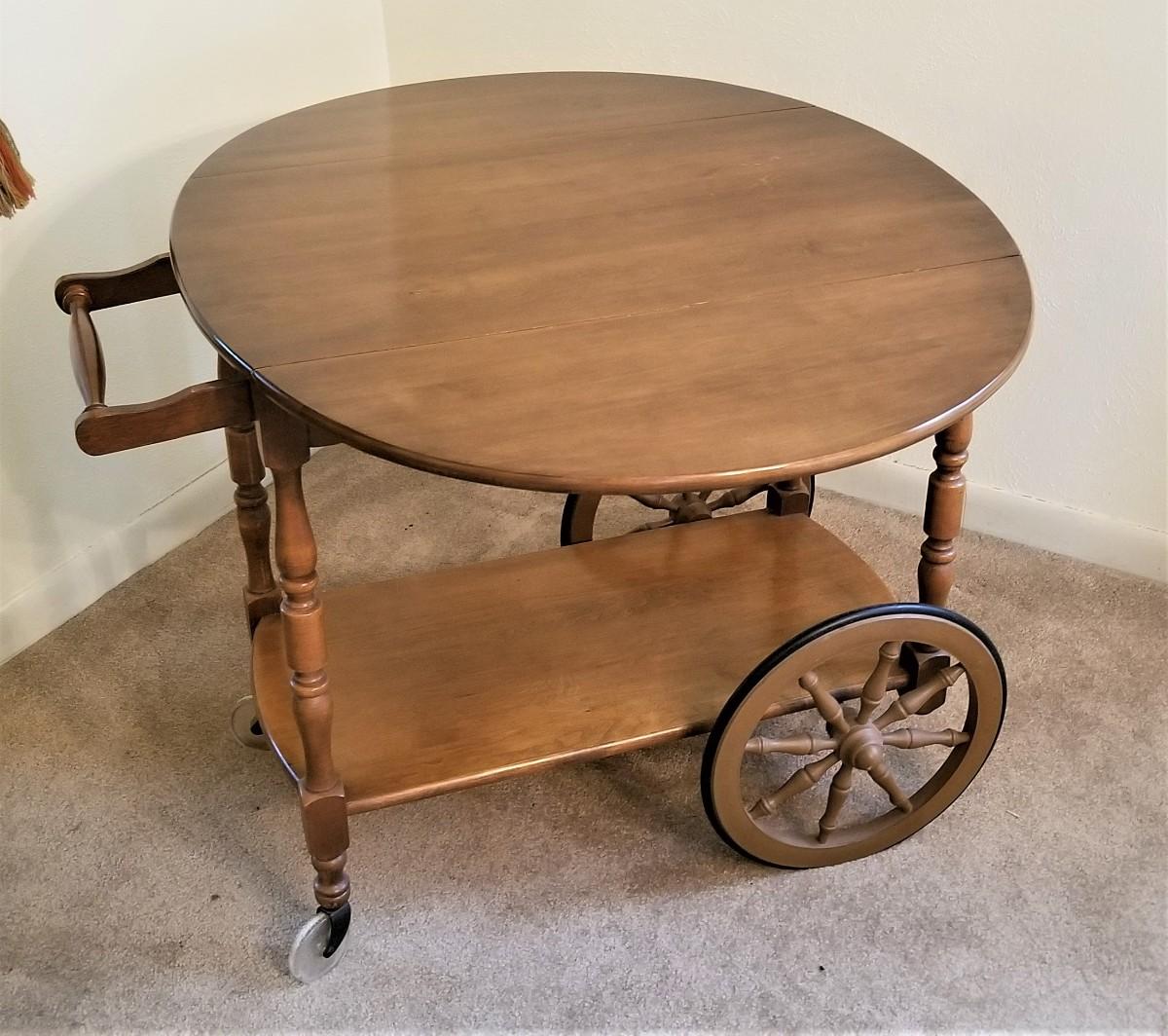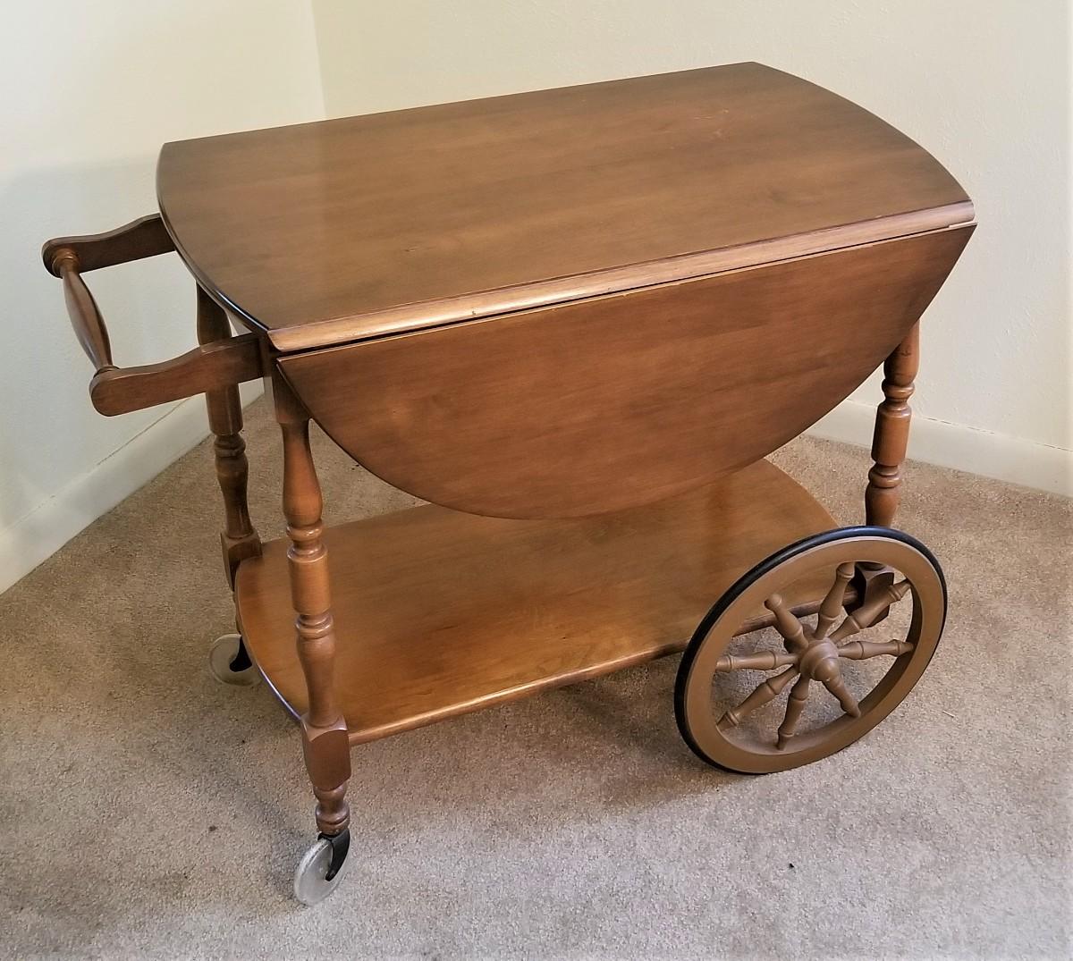 This Colonial mid-century tea cart is in great, gently used condition. Both sides fold out - handle can retract into the cart. Measures 27" tall, 27.5 long and 18" wide not extended.