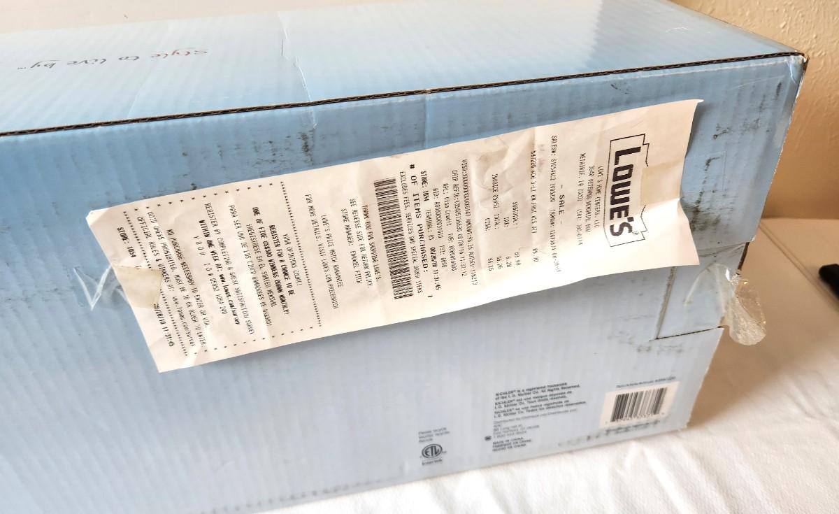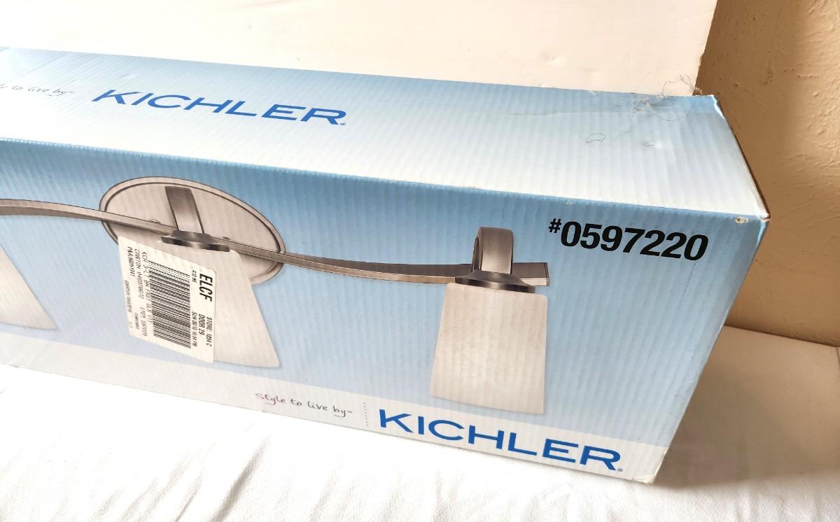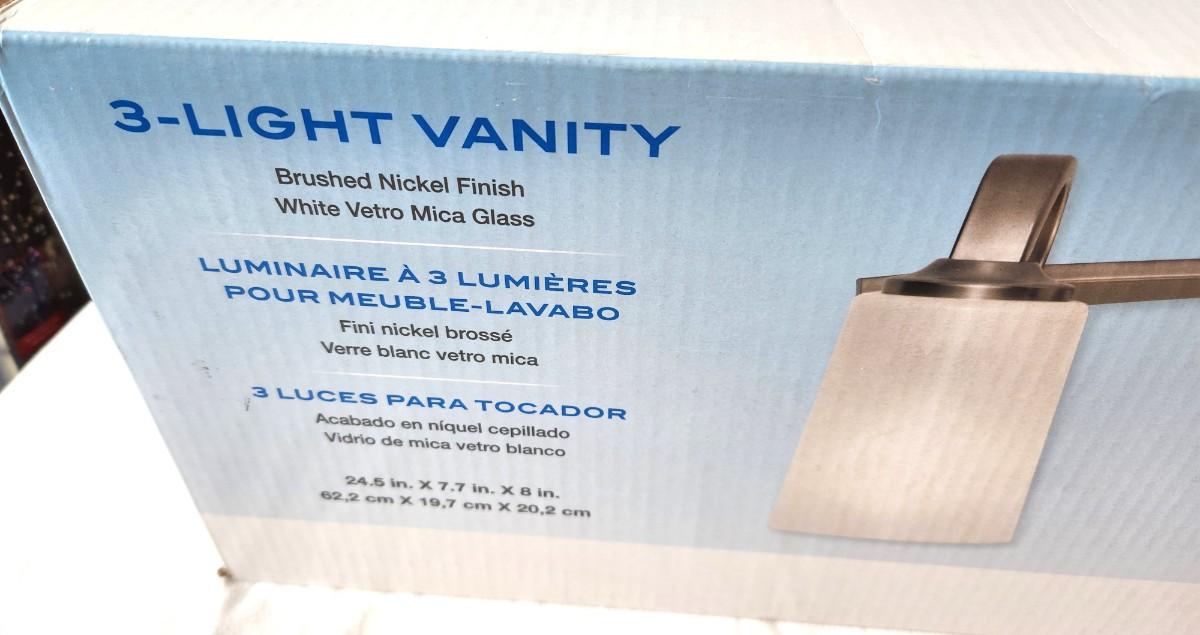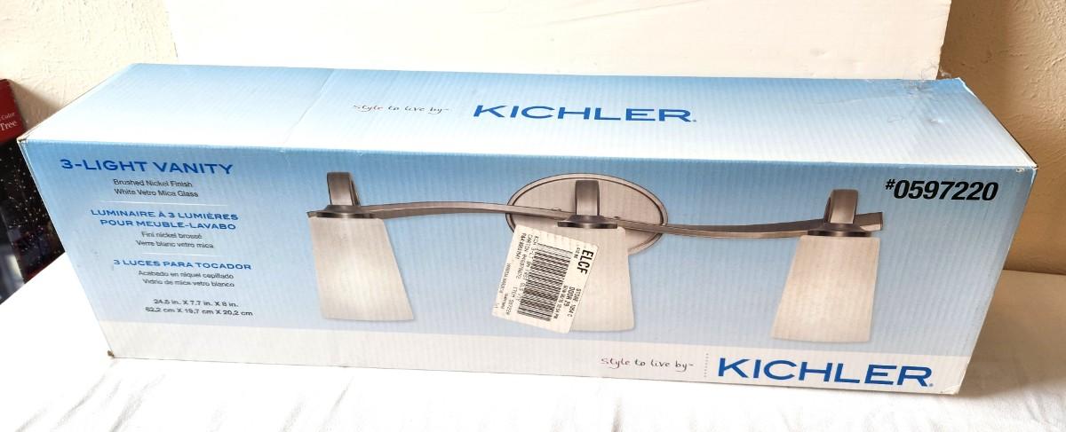 New in box with original receipt - Kichler 3 Light Vanity Light fixture, brushed Nickel- model #0598220. Measures 24.5" x 7.7" x 8".