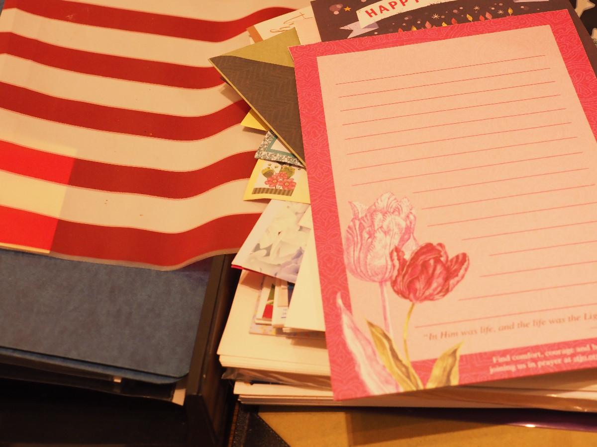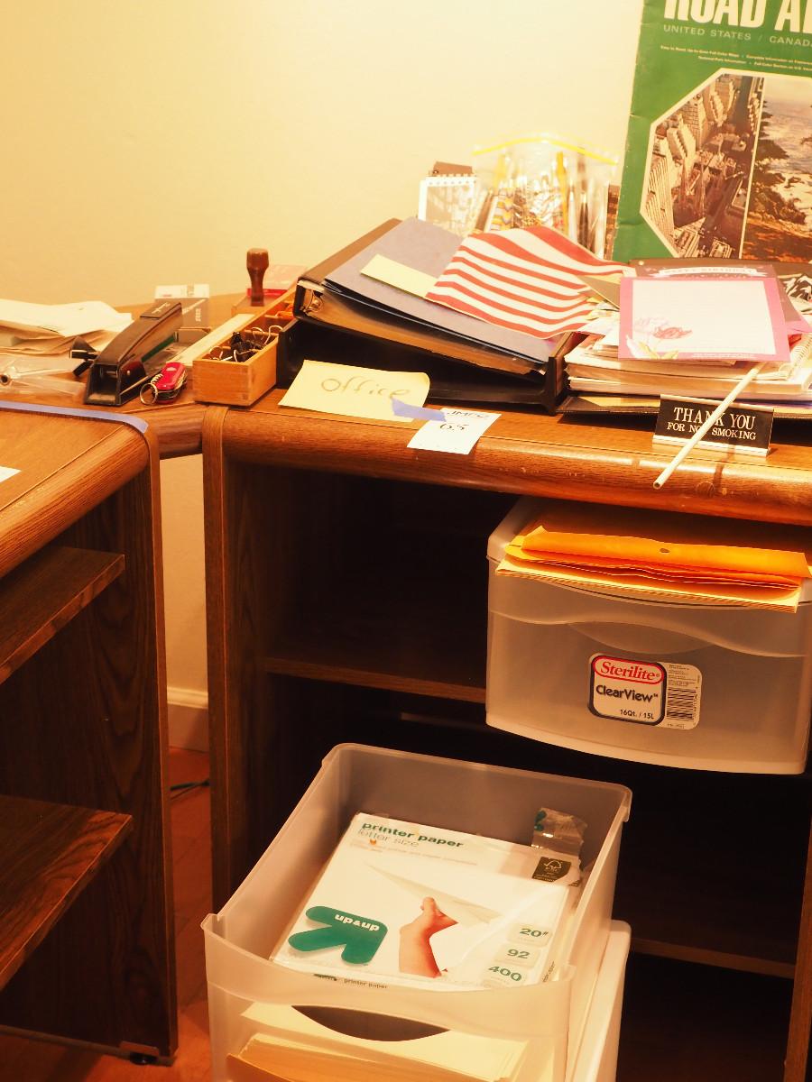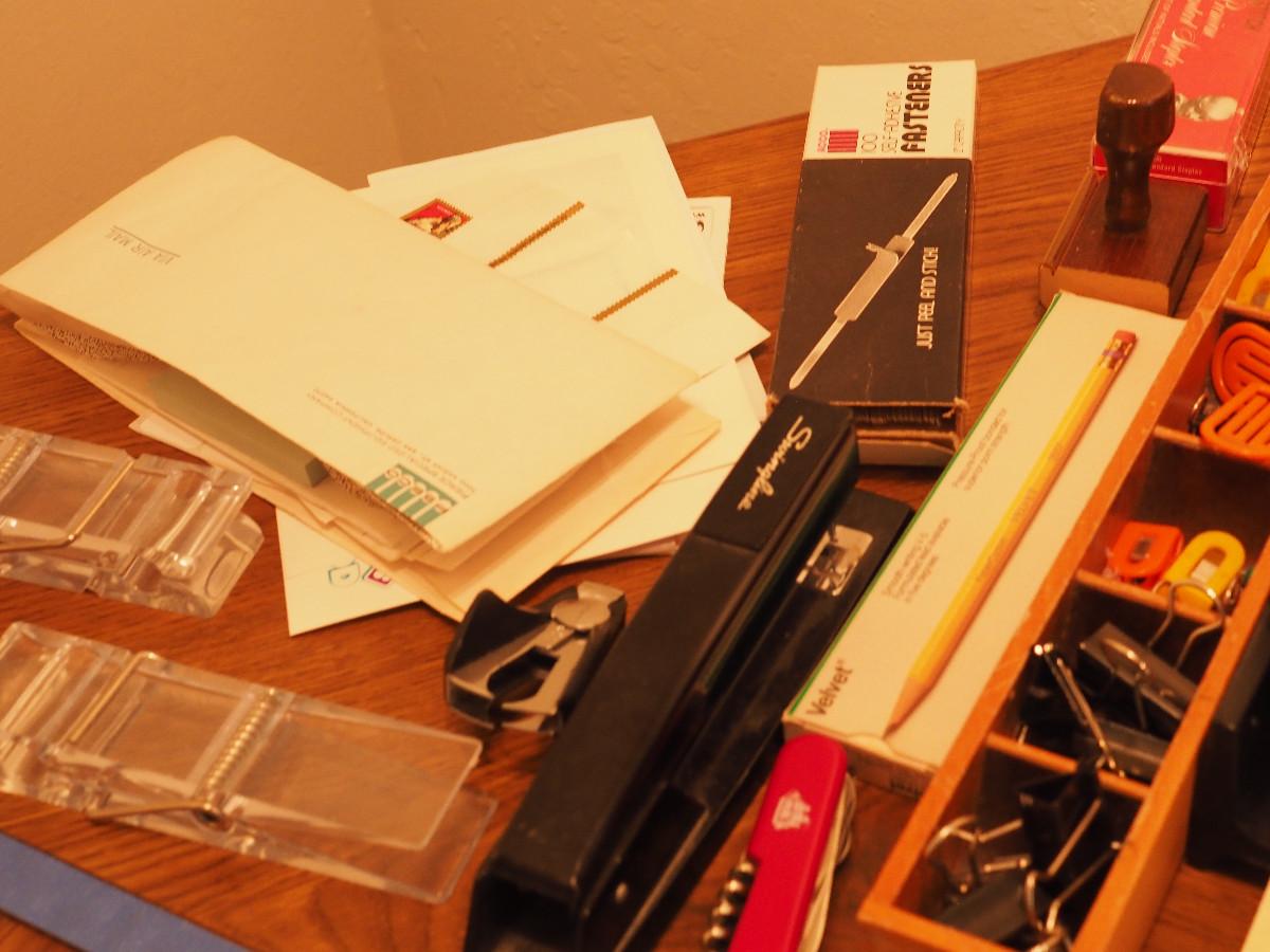 Lot 65 Office supplies and unused stamps: paper, plastic bin, envelopes, circulated and un-posted stamps. Does not include desk.