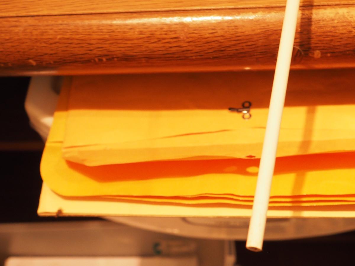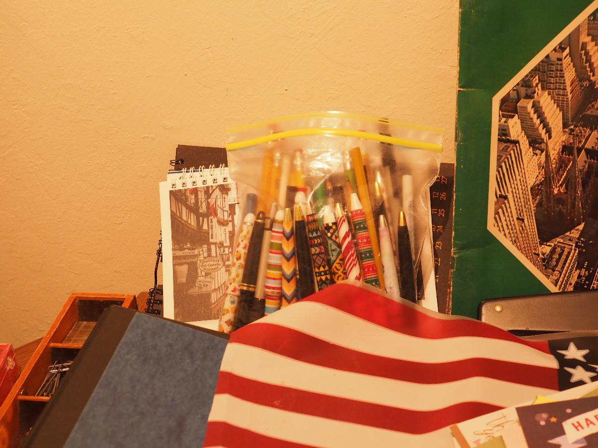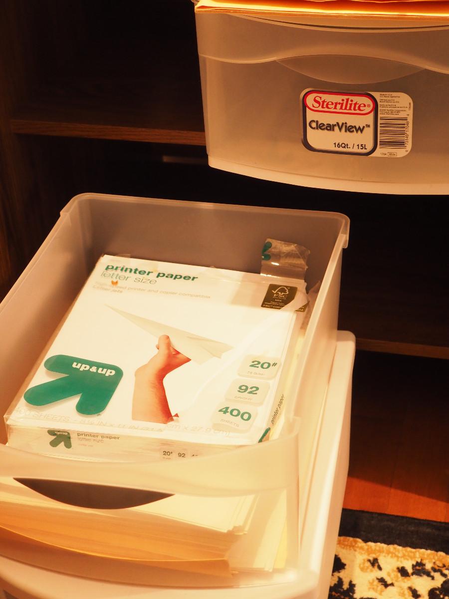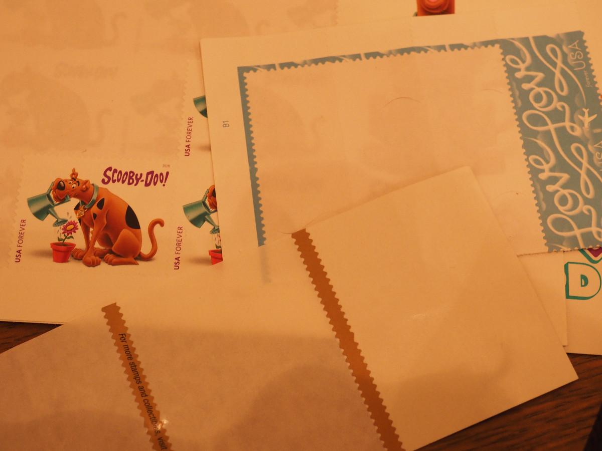 Lot 65 Office supplies and unused stamps: paper, plastic bin, envelopes, circulated and un-posted stamps. Does not include desk.
