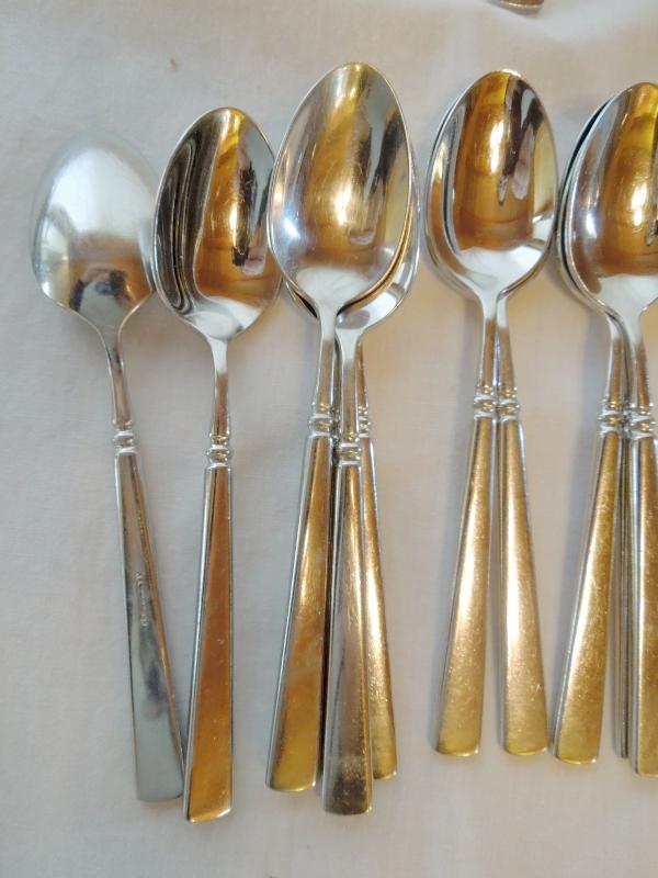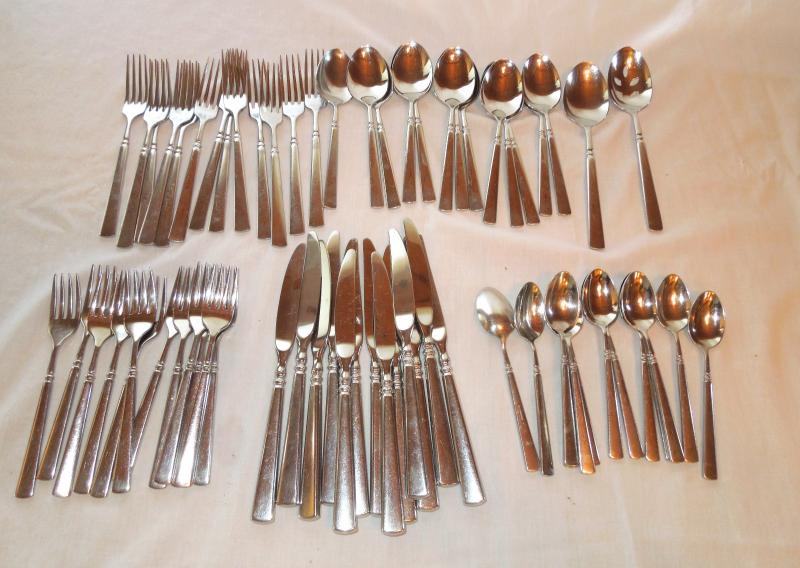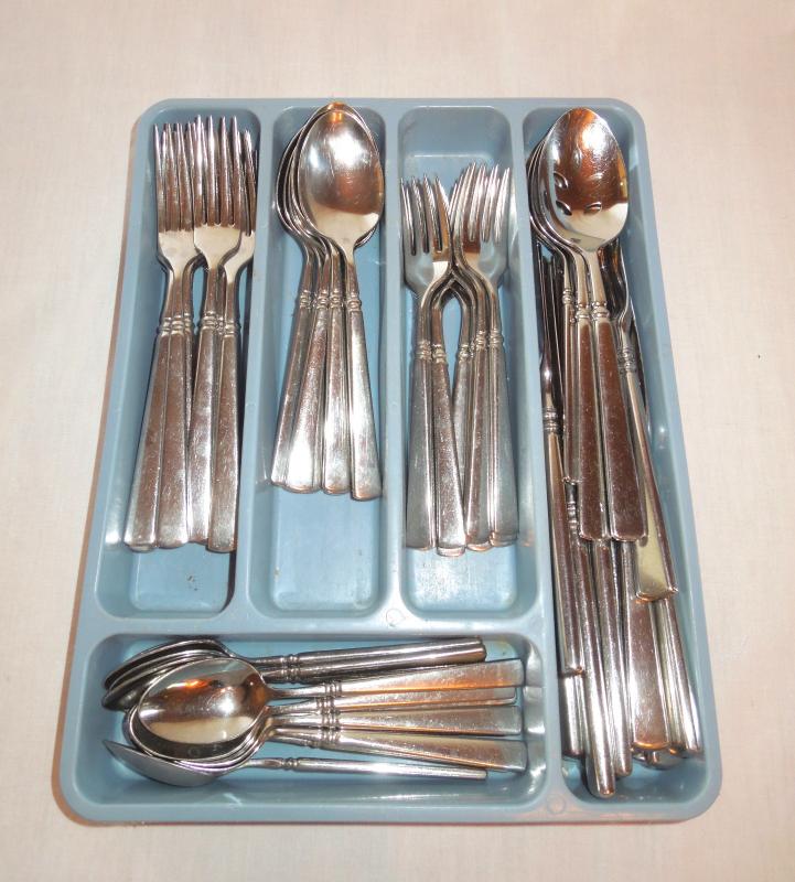 2 serving spoons; 13 dinner forks; 12 salad forks; 13 knives; 13 spoons; 13 soup spoons. Very nice used condition. Includes divider storage tray.