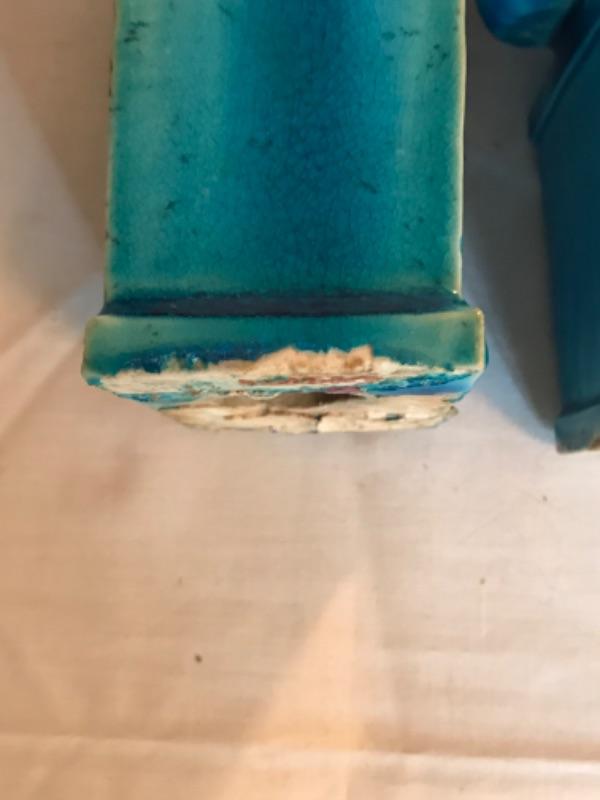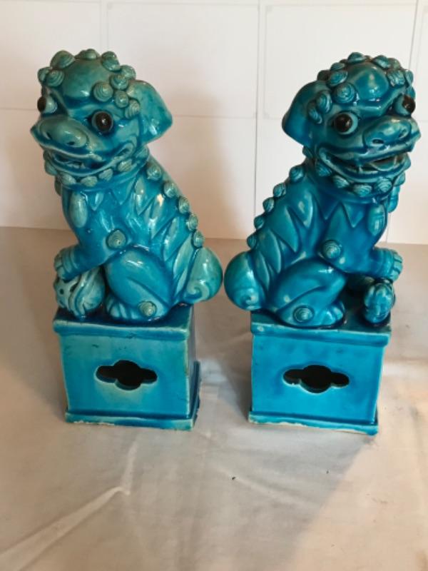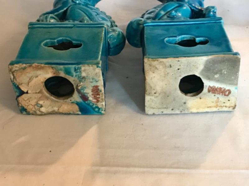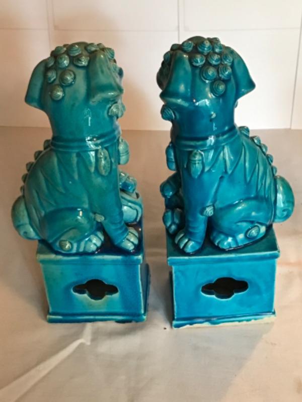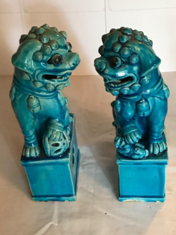 Pair of antique Chinese blue glazed foo dogs 10” tall. Some small chips in glaze (see pictures)