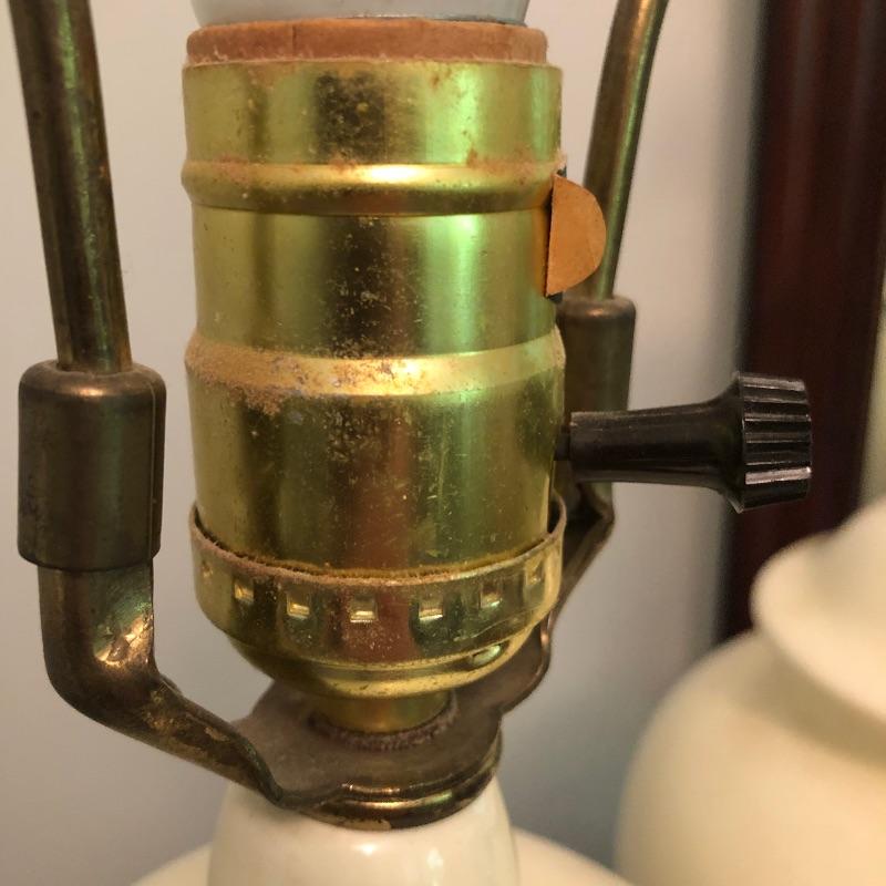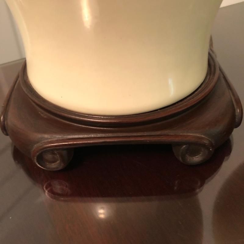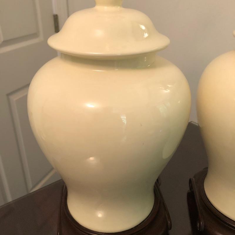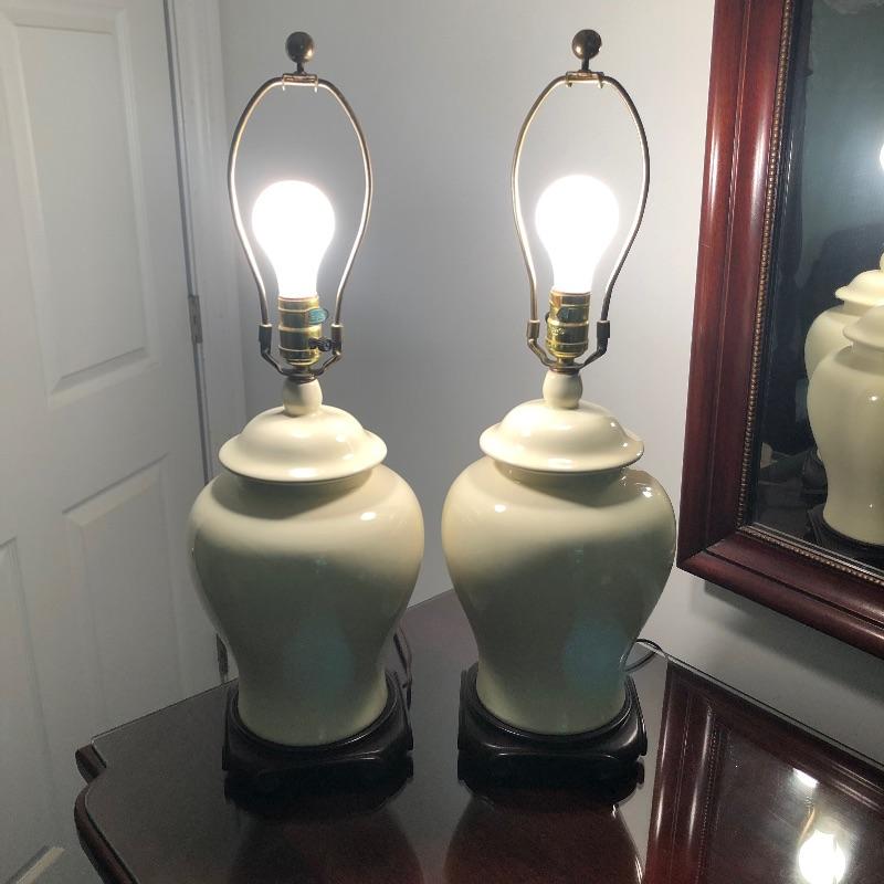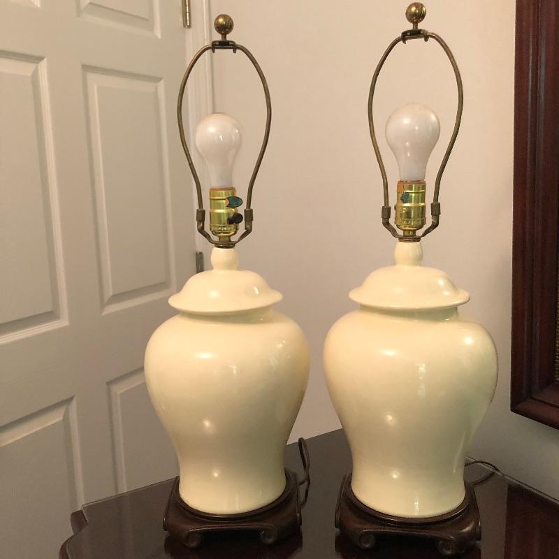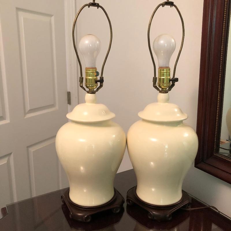 Attractive pair of lamps here that are a cream color set on a dark wood base. They are a match set and do work, just need a couple of nice lampshades and they are good to go!