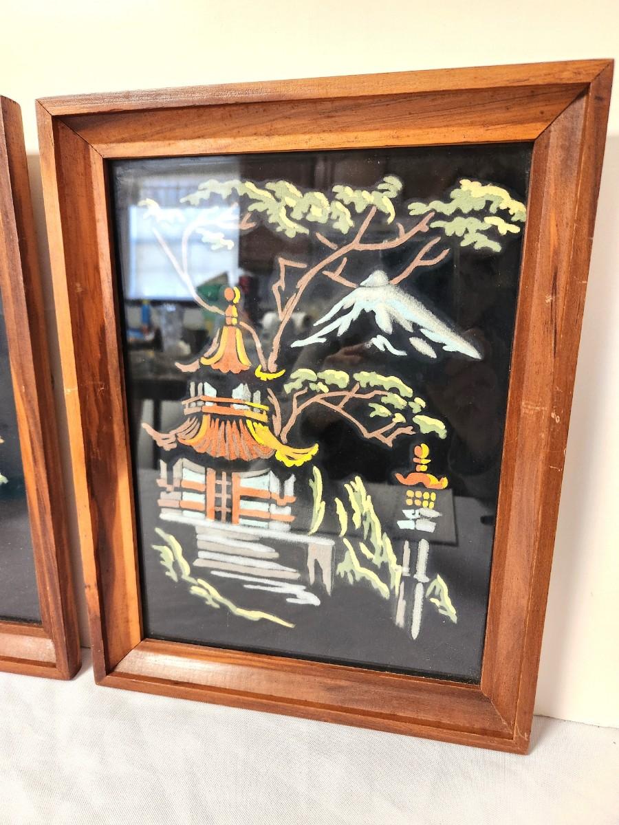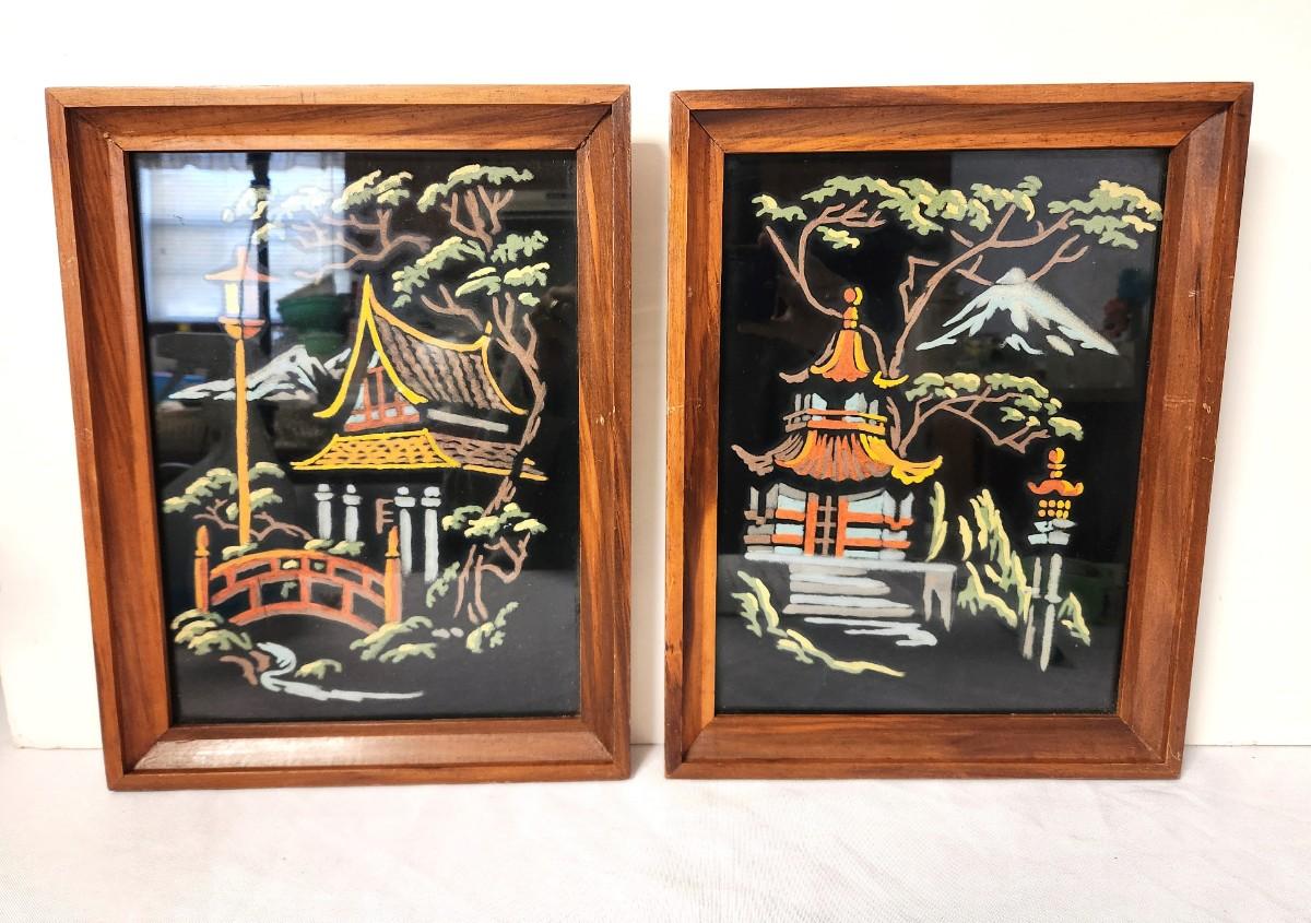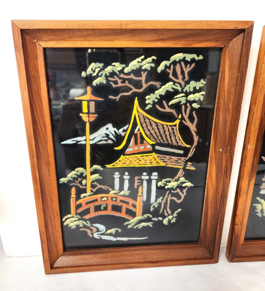 Cute pair of Mid Century paintings on black velvet - pagoda scenes. Each measures 10.5" x 14". Good condition.