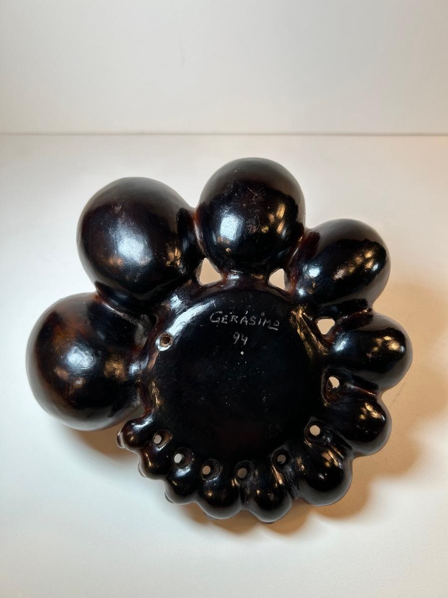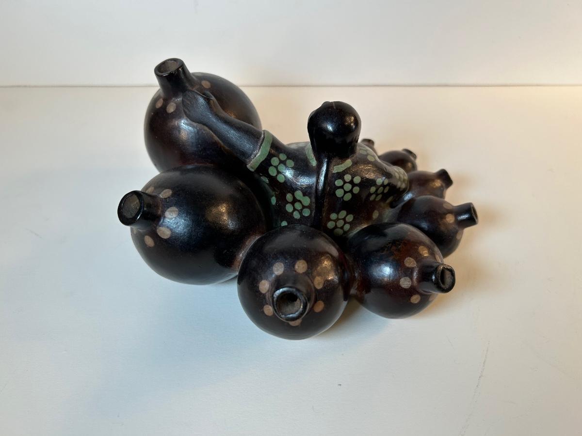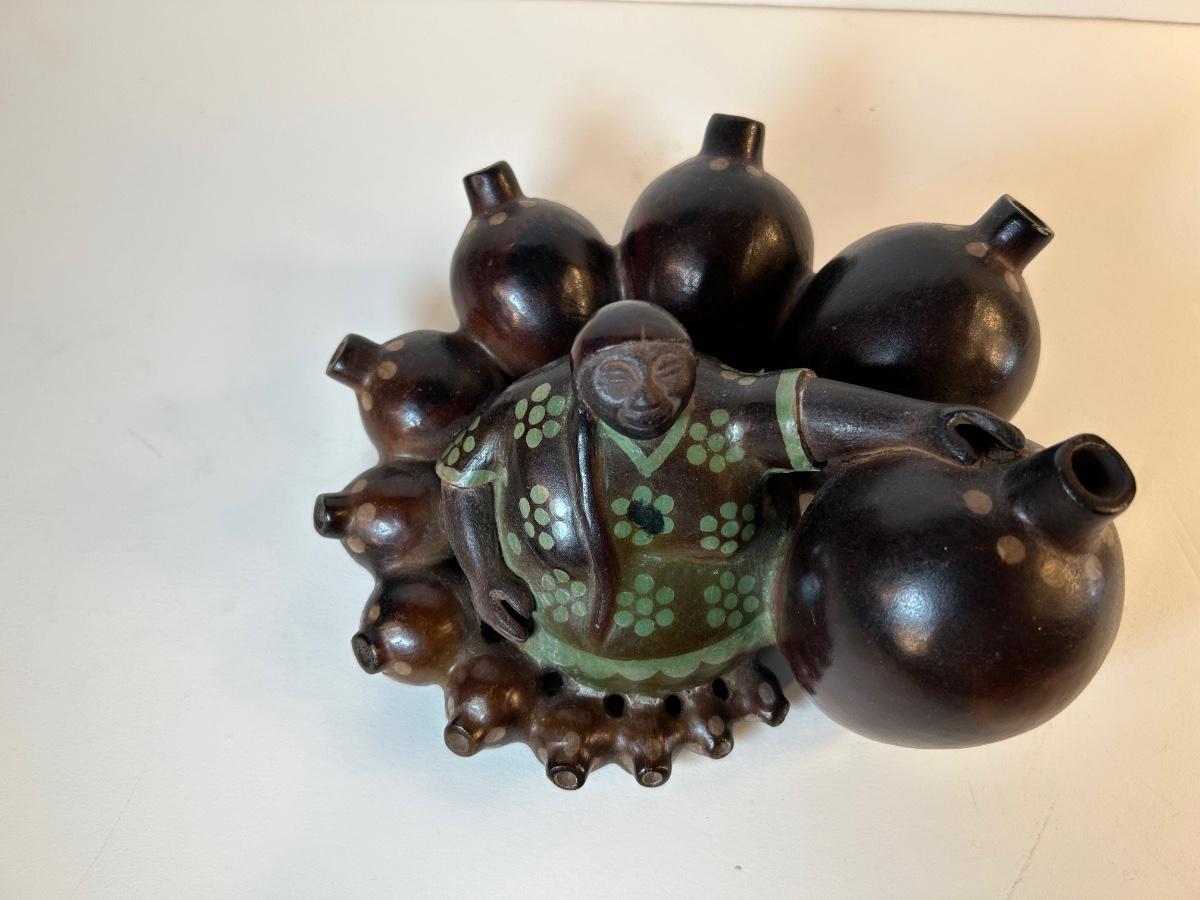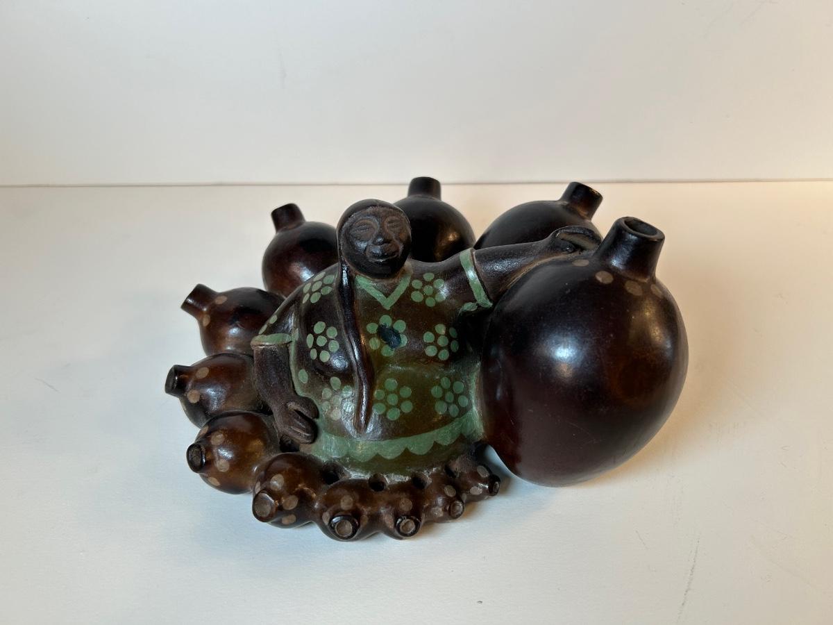 Made in Chulucanas Peru, dated 1995. Woman with 12 jugs pottery sculpture