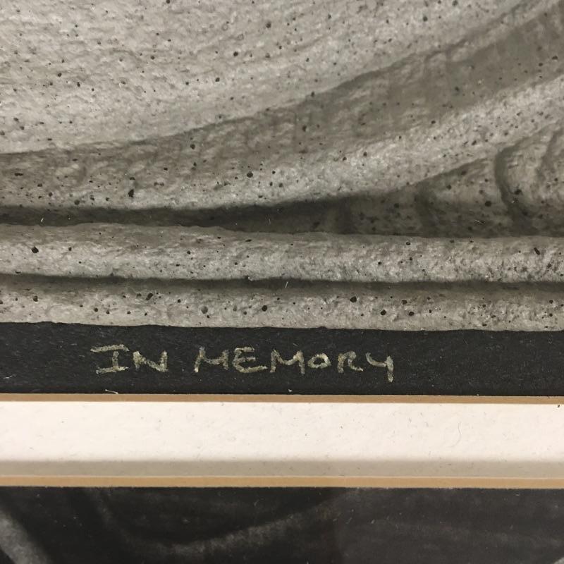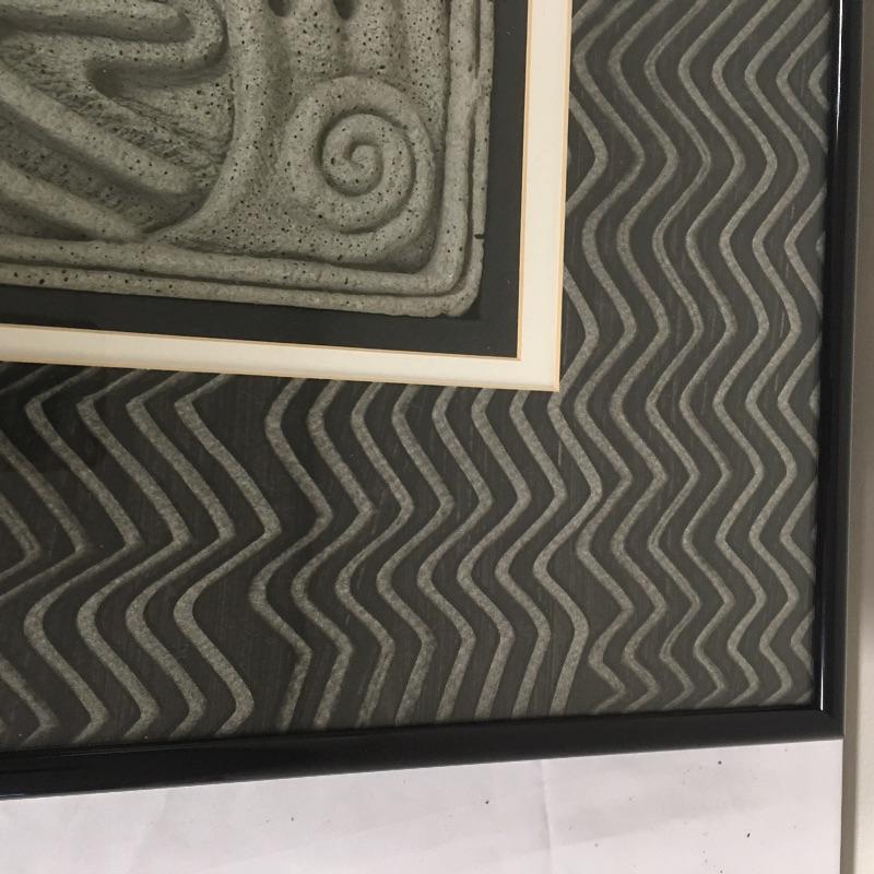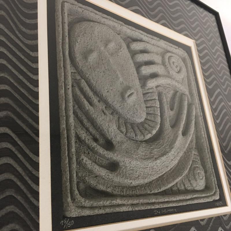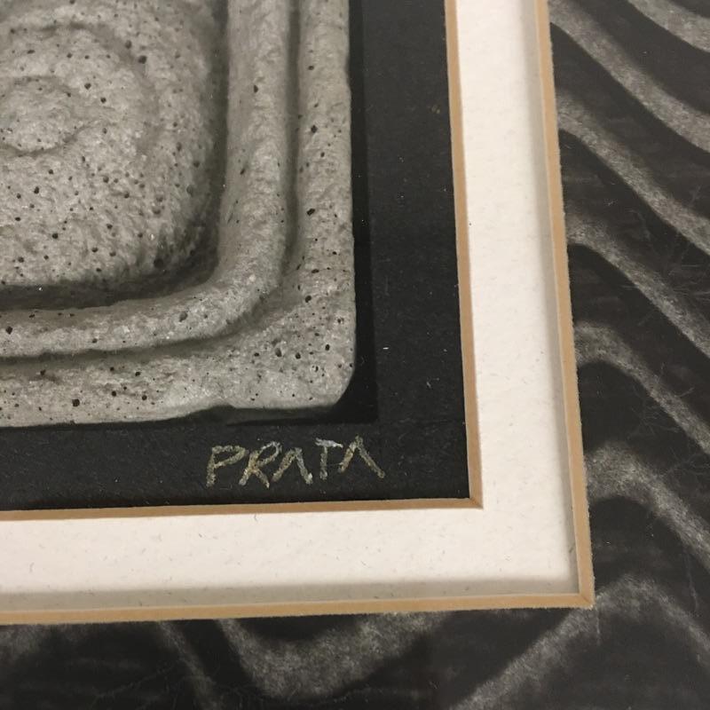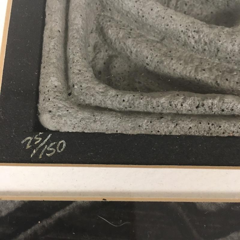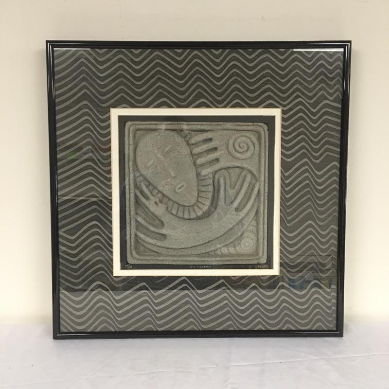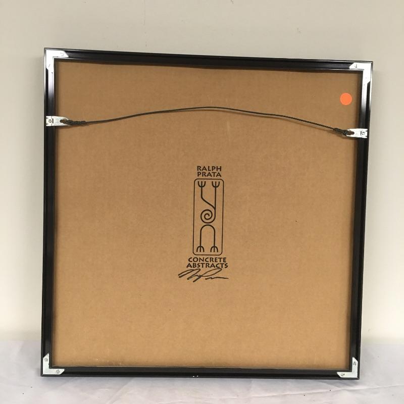 This Ralph Prata concrete abstract is title “ In Memory” and is numbered on the mat and signed on back of frame. Frame measures 20” x 20”.