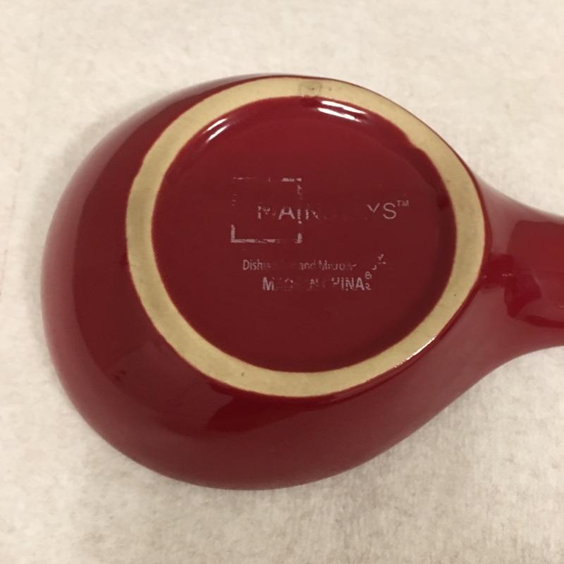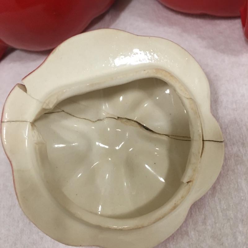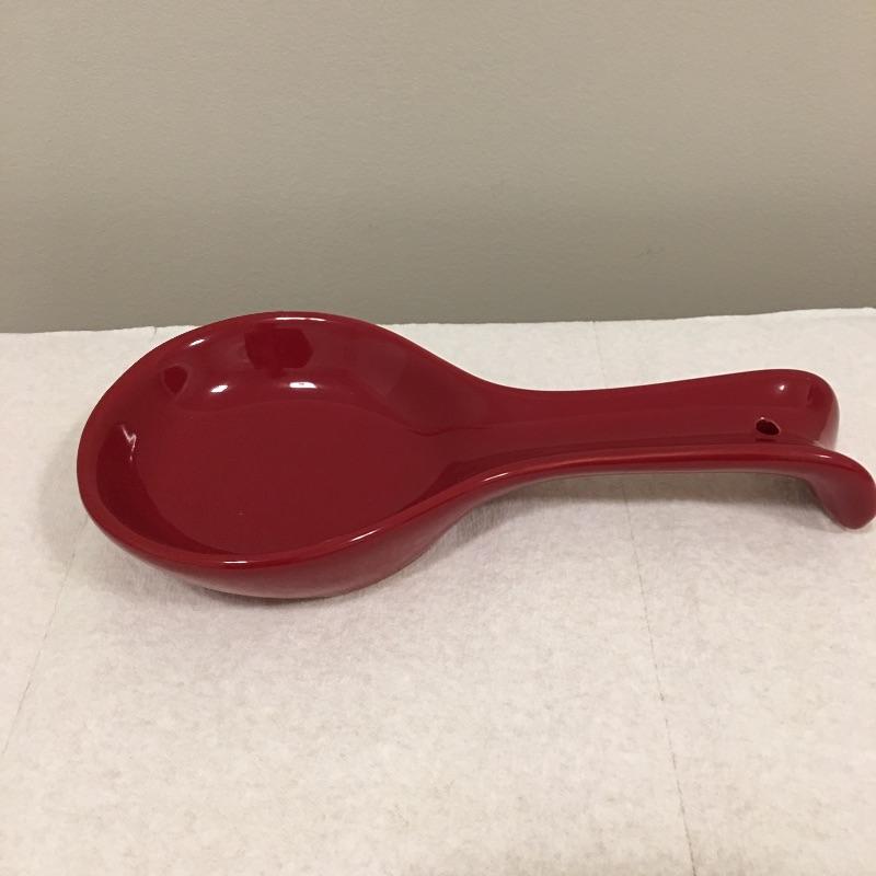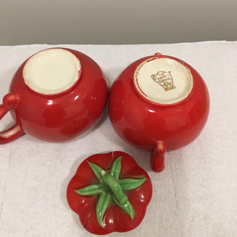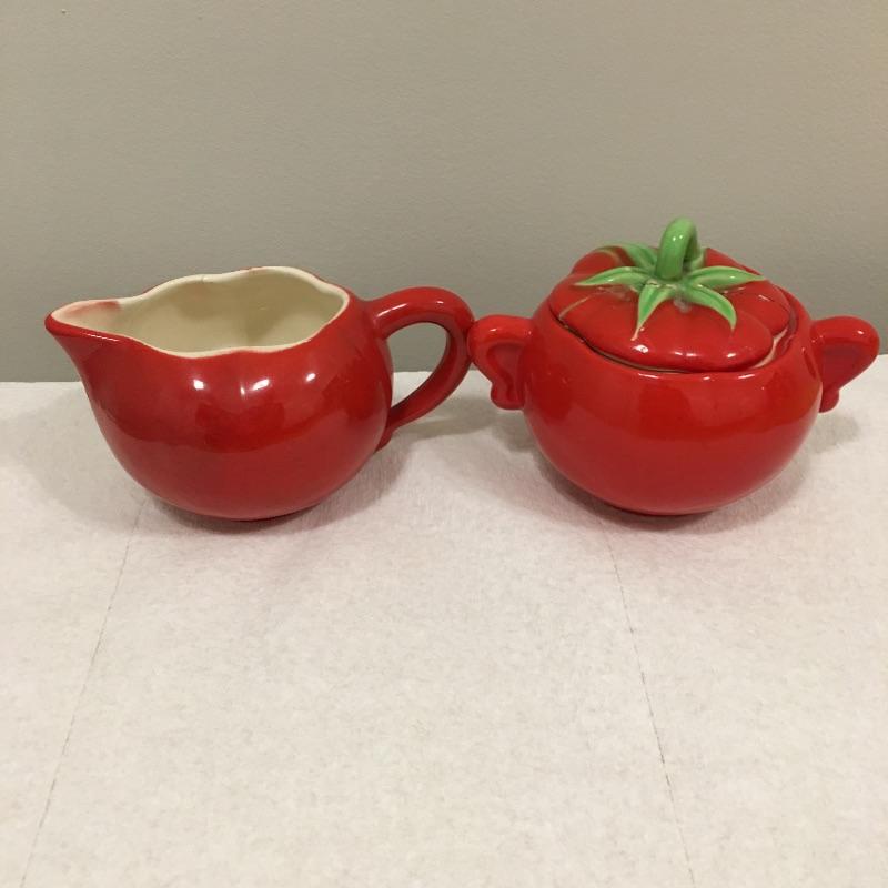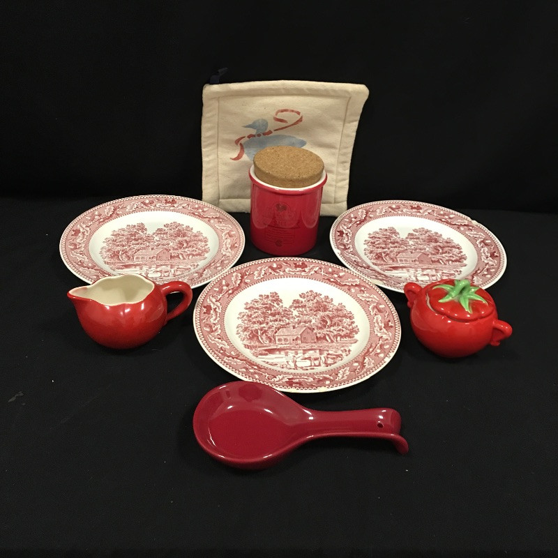 Add some color and zing to your dinner table with this nice collection of red themed items. Included are three plates, spoon rest, small canister and a creamer and sugar bowl. Two plates have chips, see pictures. Plates measure 10”D.