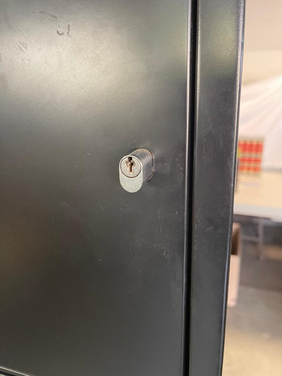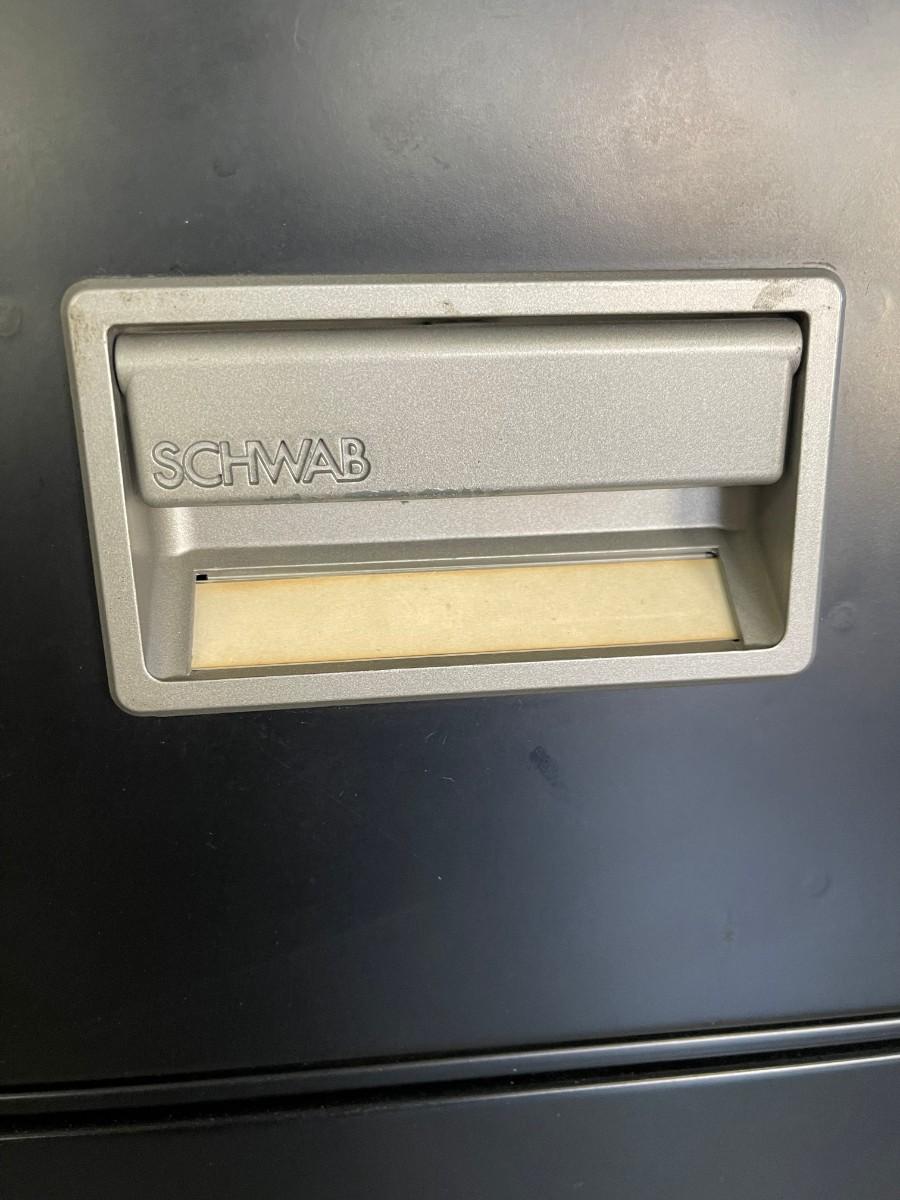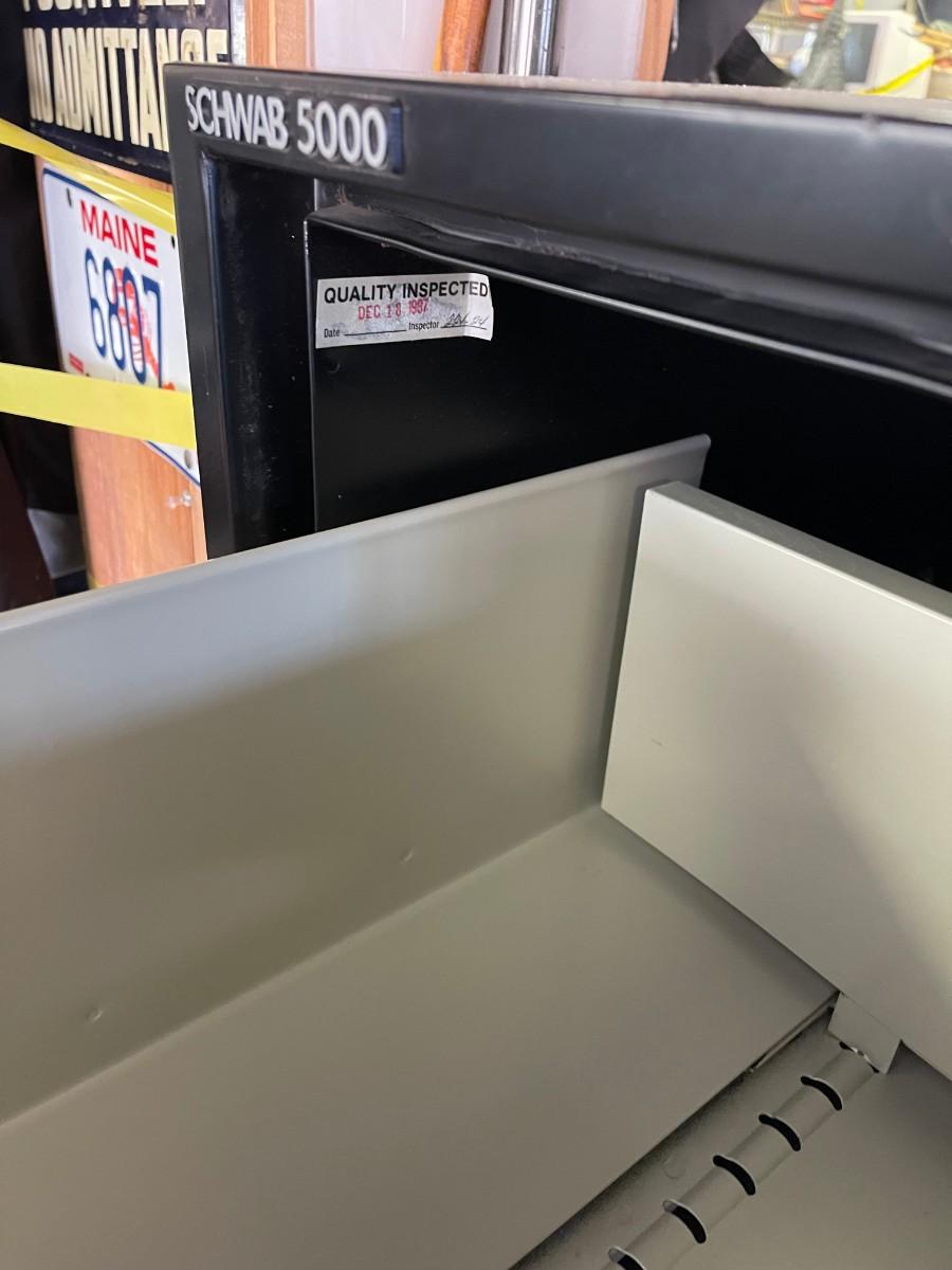 Fire proof, black, 4 drawers, file cabinet, by Schwab 5000.