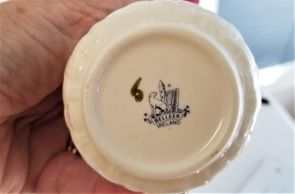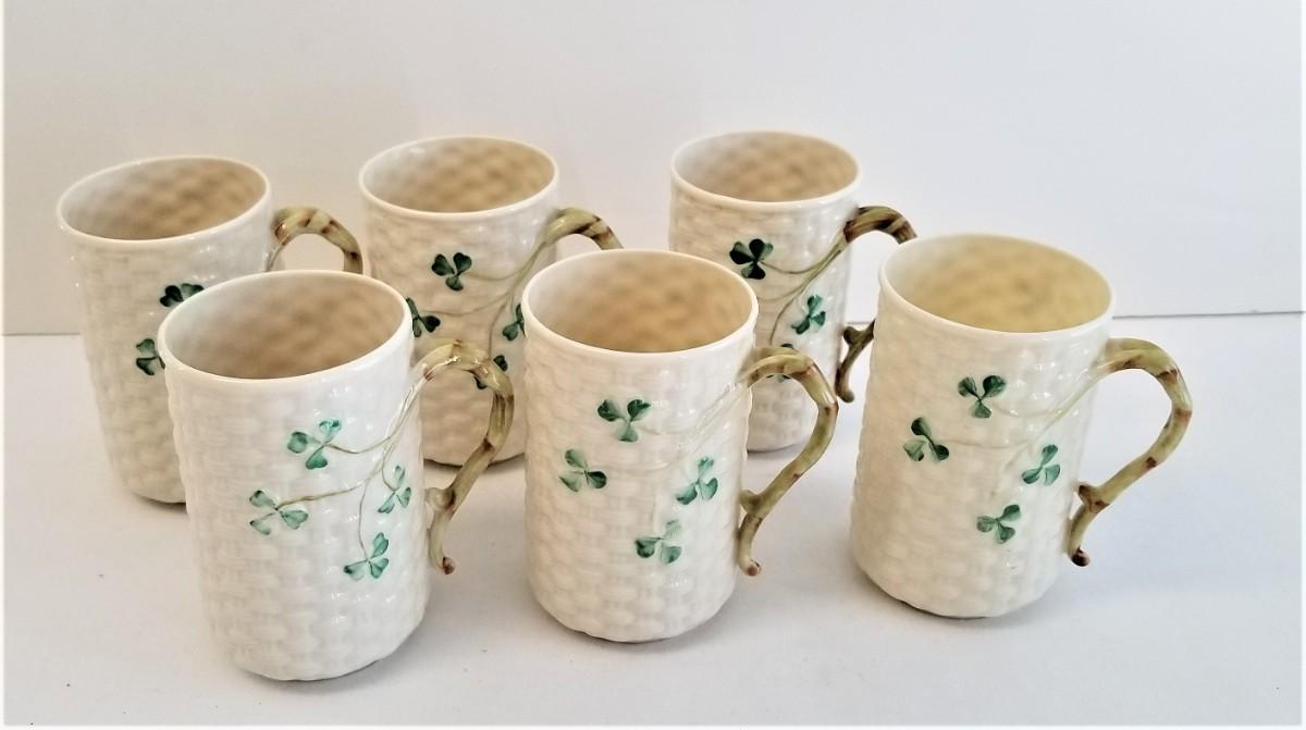 Set of six pretty Belleek mugs - shamrock motif. Each 4" tall. 3 have the Millenium mark, 1 blue mark, and 2 green marks. All in good condition.