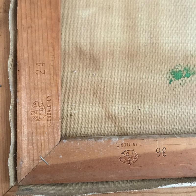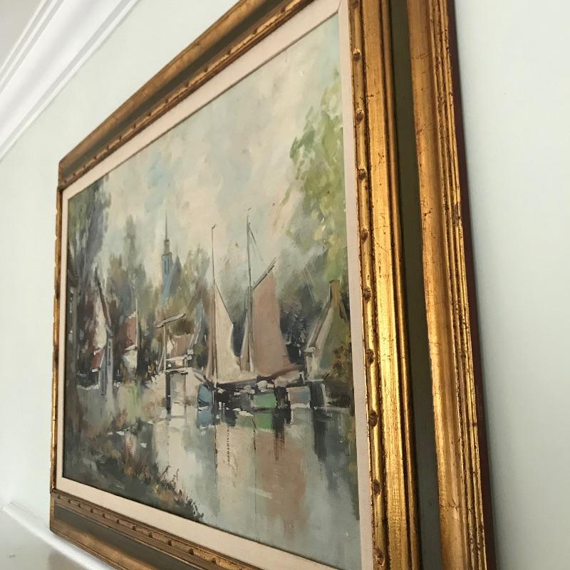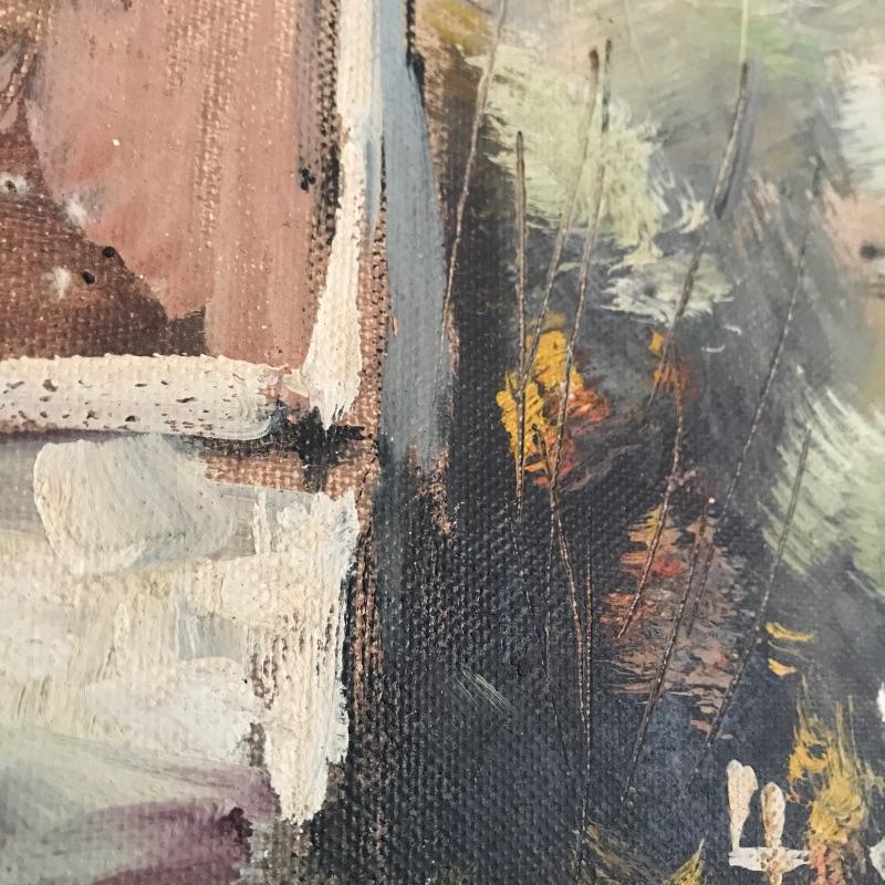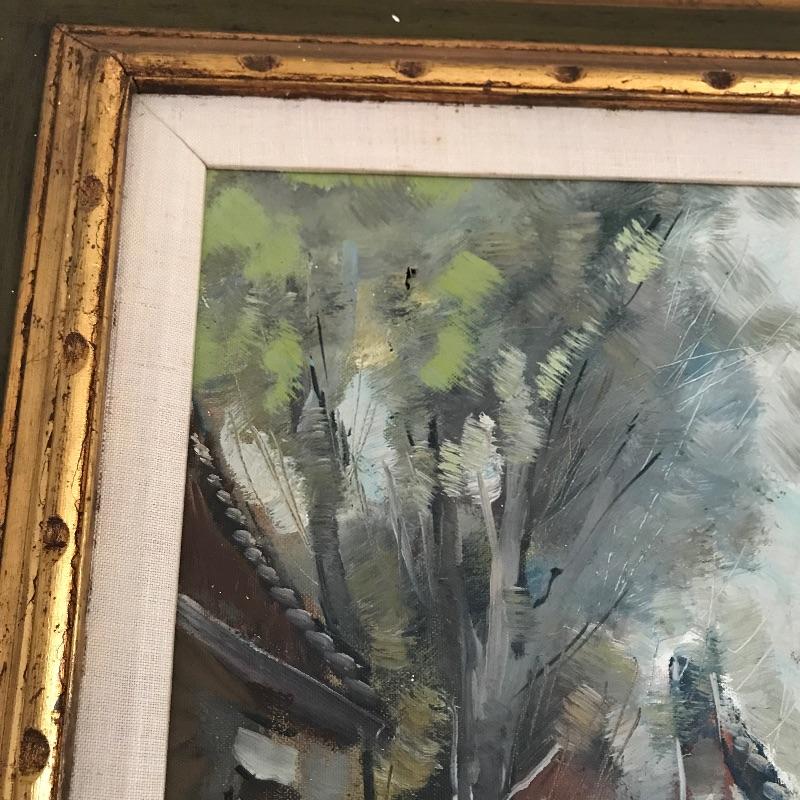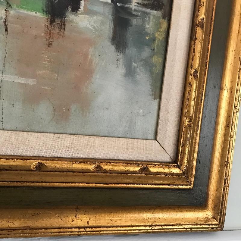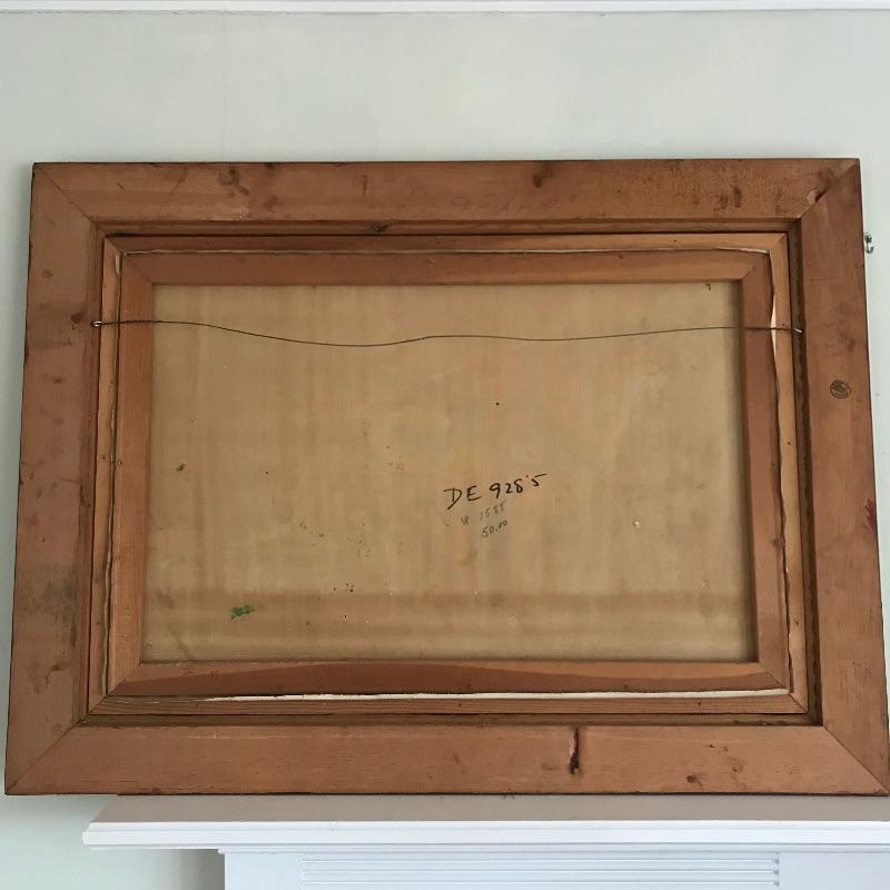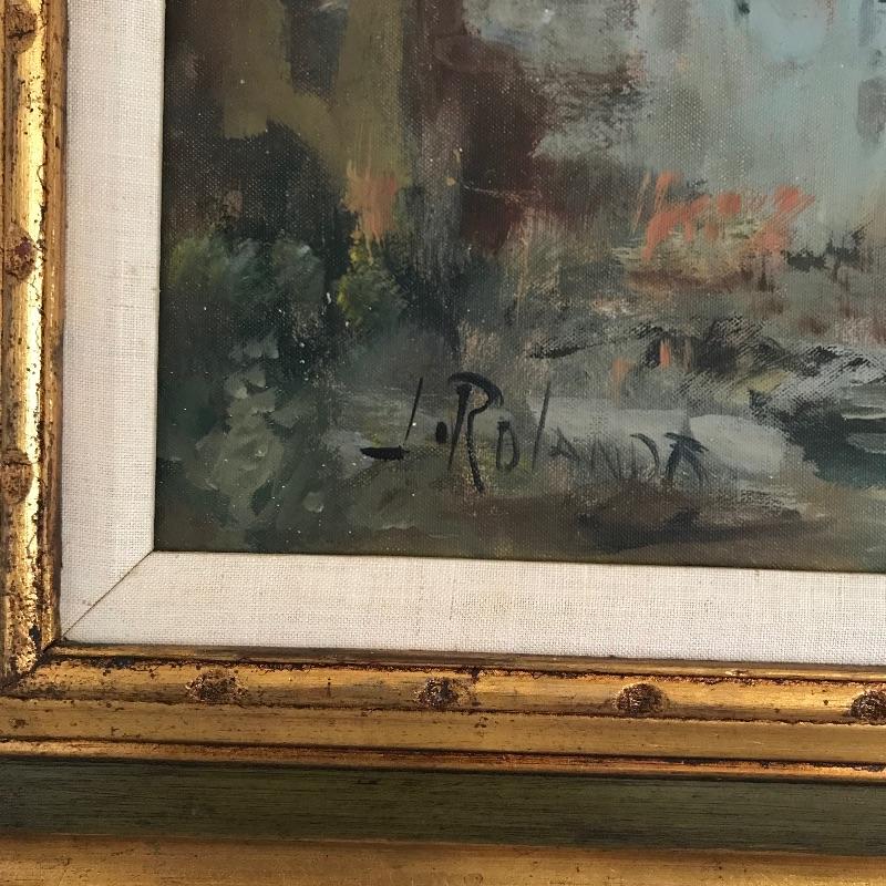 Large framed oil painting on canvas signed J Roland. Art features a nice balance neutral tones with pastel and bolder colors to go nicely with many decor styles. Frame is a brass/gold colored painted wood without glass and measures 46” x 34”. See photos. Shipping available. Shipping art is costly, call UPS with dimensions at 828-252-6930 for a shipping quote prior to bidding.