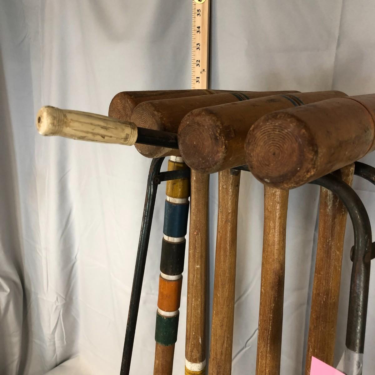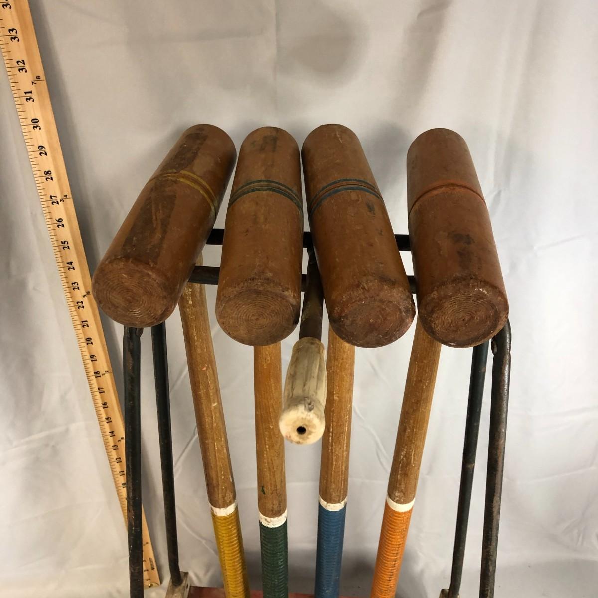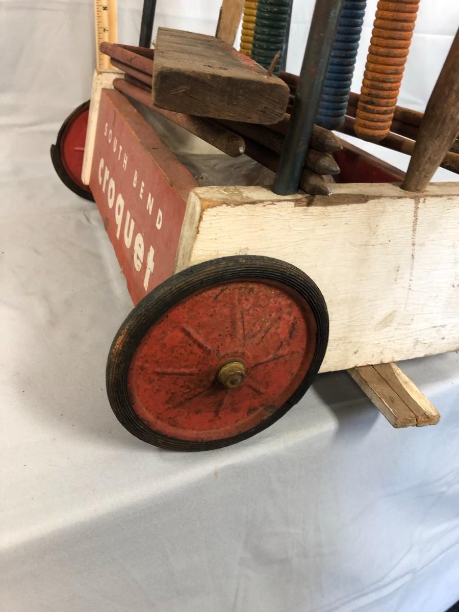 This is a classic set! The South Bend Toy Company started in 1874 by a grocery clerk and a woodworker and they made croquet sets as one of the few outdoor activities that "respectable" women could participate in. They continued to produce until 1985 when they closed for good. The mallets and balls are made of wood and the cart is metal and wood. The loose piece of wood needs a nail or two to be re-attached to the bottom, it is missing two mallets, and one of the stakes has a significant chip, but this is still a very usable set. Summer is coming and it's time to make sure that there are plenty of activities for the kids and adults! The cart stands about 31" and is about 15.5" wide.