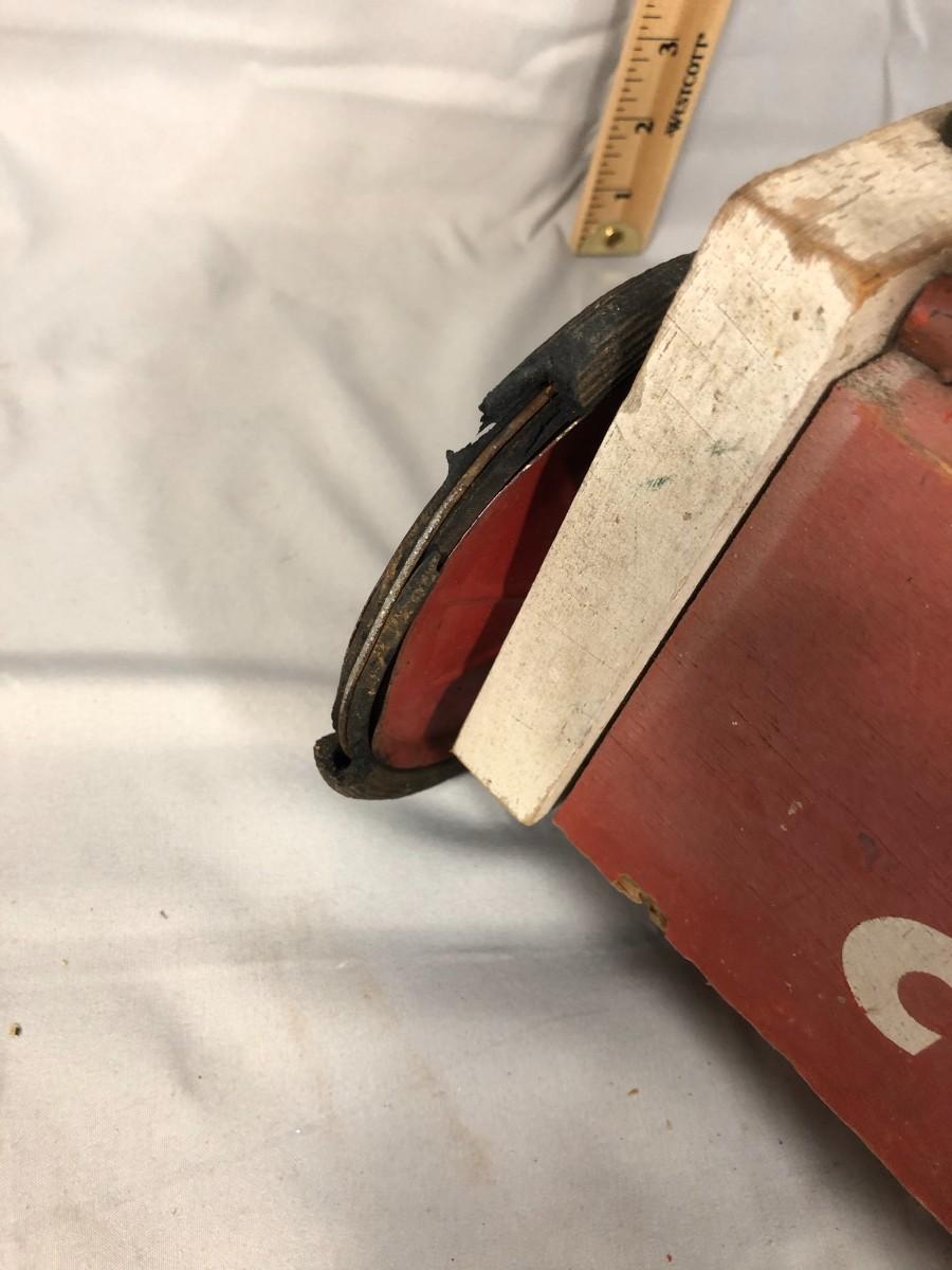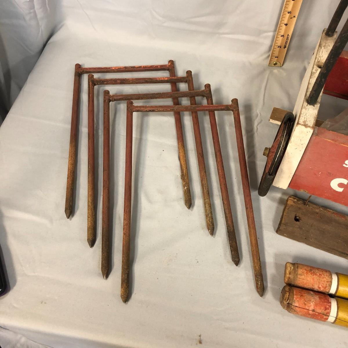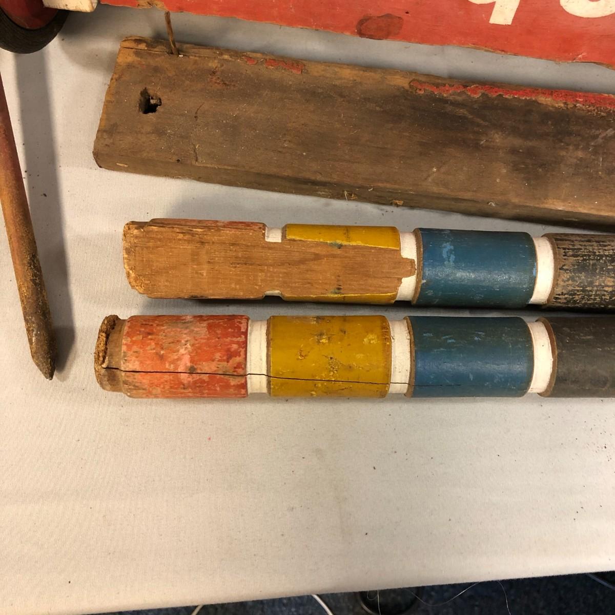 This is a classic set! The South Bend Toy Company started in 1874 by a grocery clerk and a woodworker and they made croquet sets as one of the few outdoor activities that "respectable" women could participate in. They continued to produce until 1985 when they closed for good. The mallets and balls are made of wood and the cart is metal and wood. The loose piece of wood needs a nail or two to be re-attached to the bottom, it is missing two mallets, and one of the stakes has a significant chip, but this is still a very usable set. Summer is coming and it's time to make sure that there are plenty of activities for the kids and adults! The cart stands about 31" and is about 15.5" wide.
