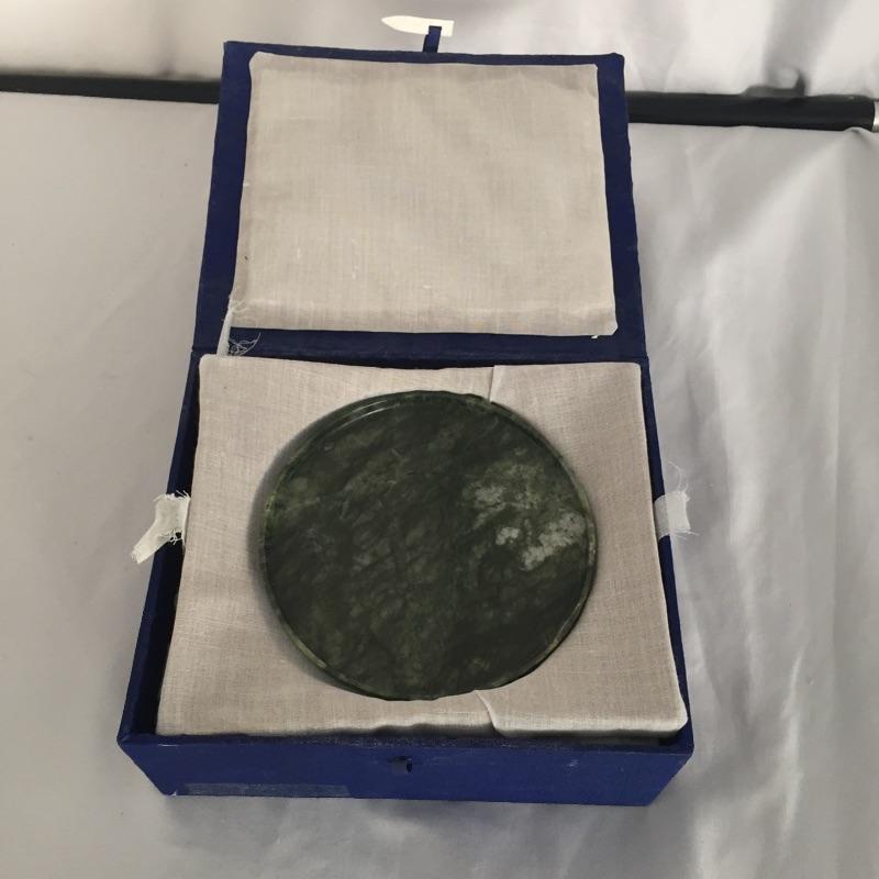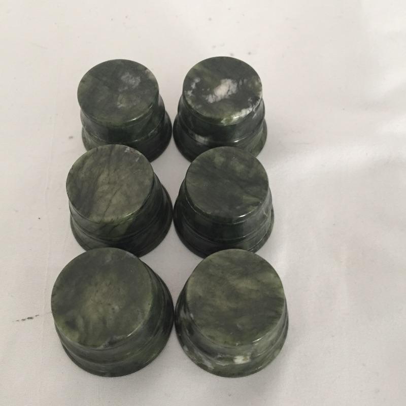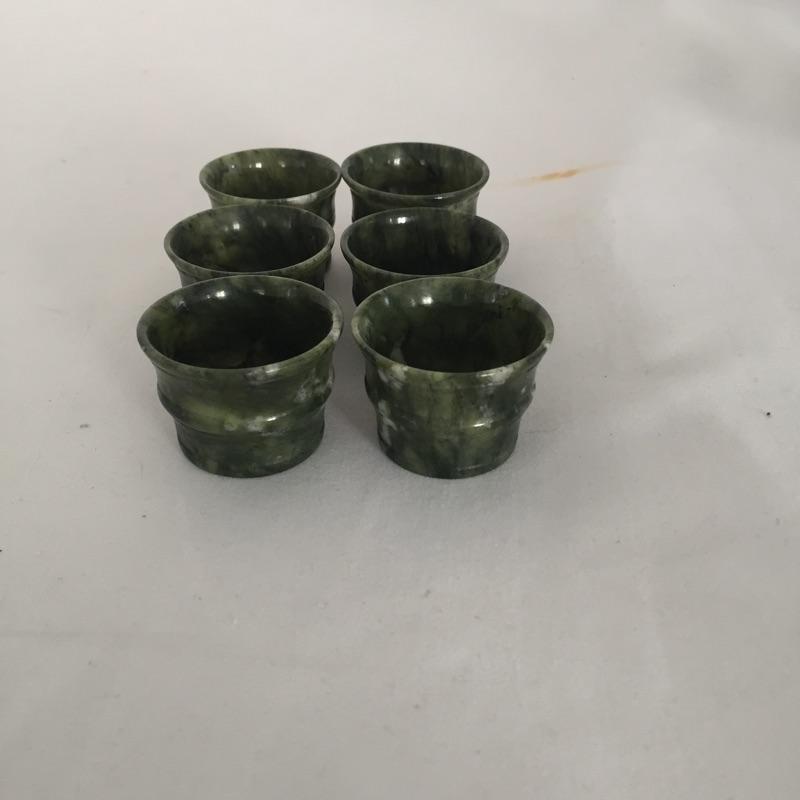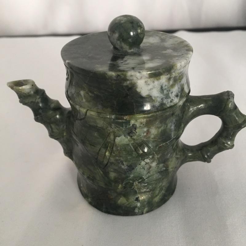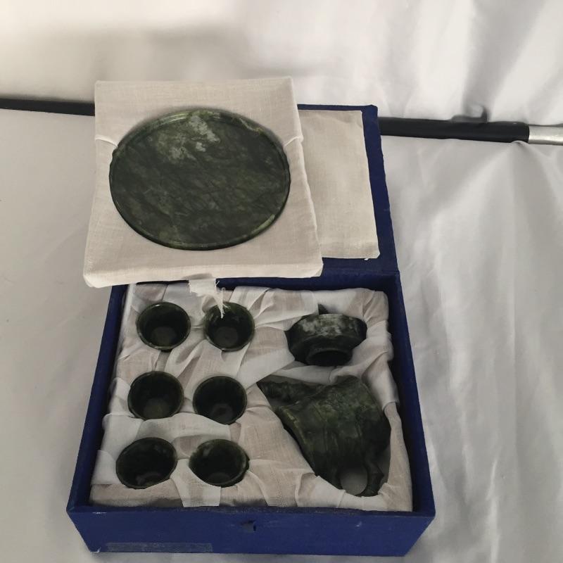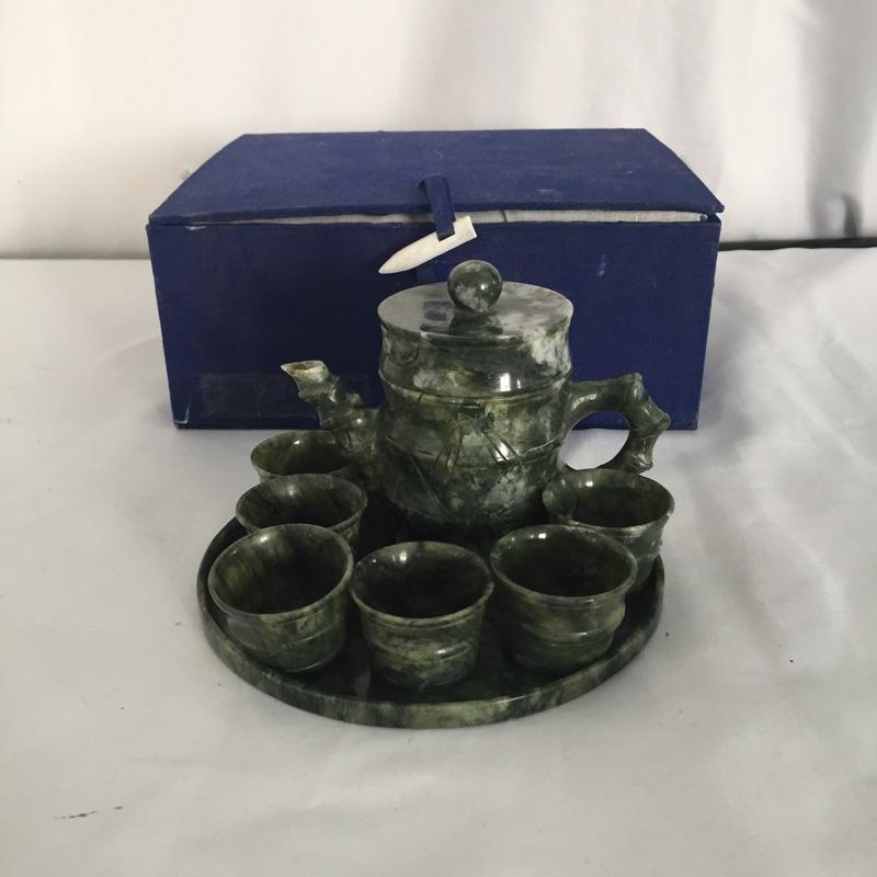 Unique nine piece tea or espresso set includes six small cups , pitcher with top and tray. Set seems to be made of stone and comes with storage box. Use it for sake, or cordials or other ideas. Pitcher measures 3” tall.