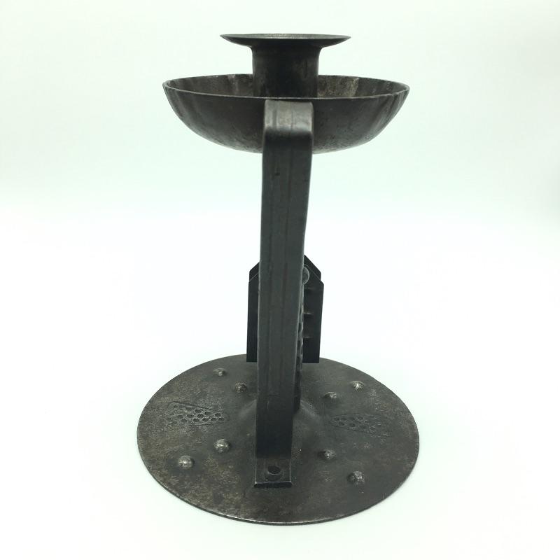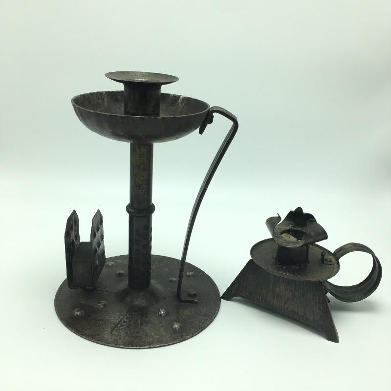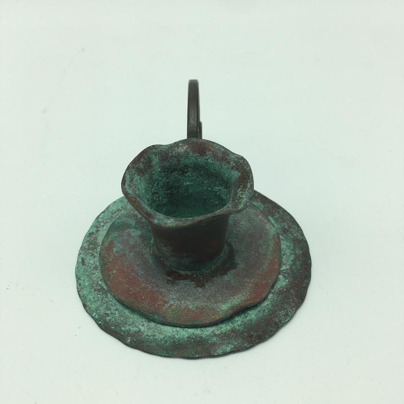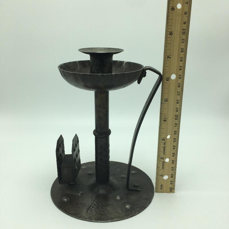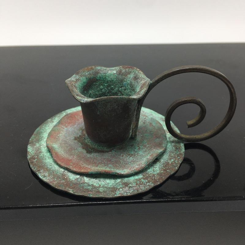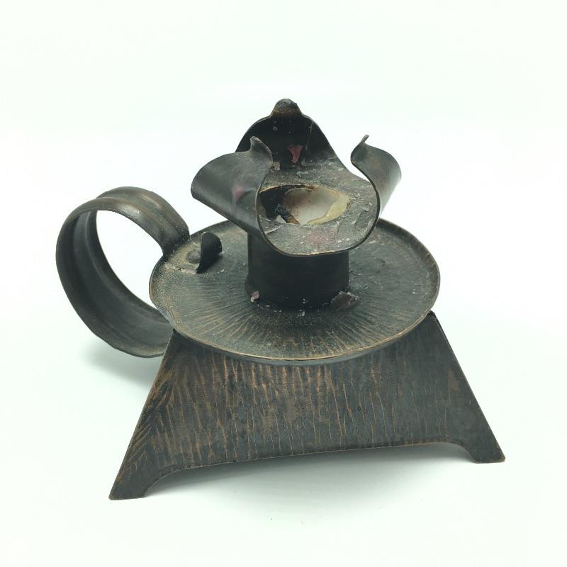 Trio of metal candle holders. This lot includes a large metal candleholder with an attached match holder and two smaller candleholders made of copper. No markings found. Smallest one has a patina.
