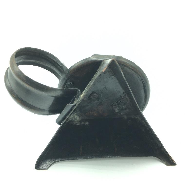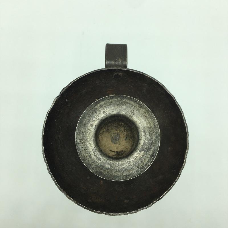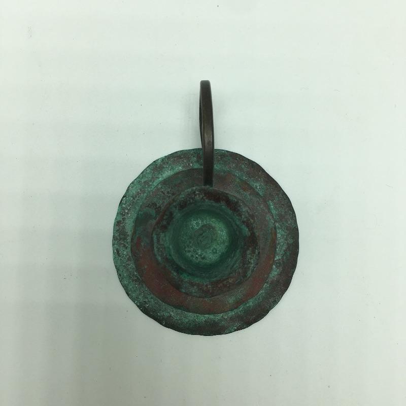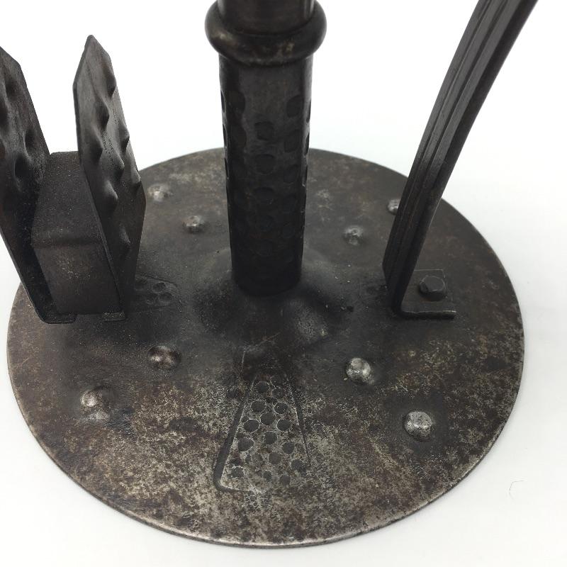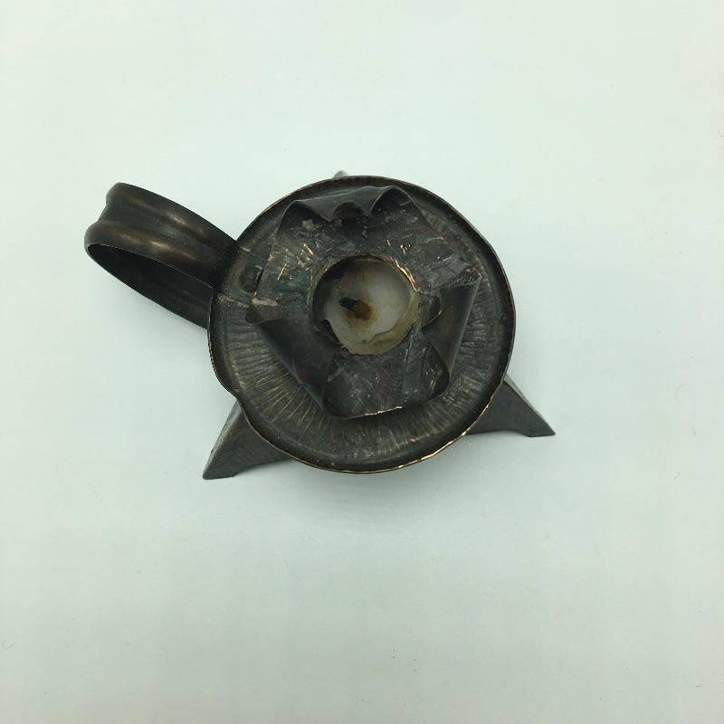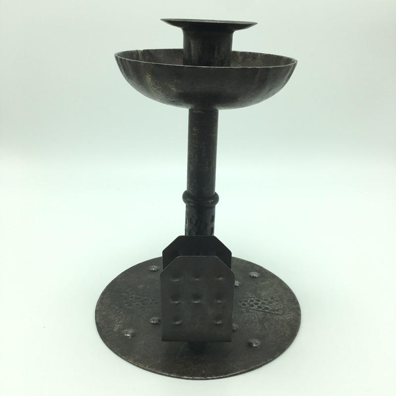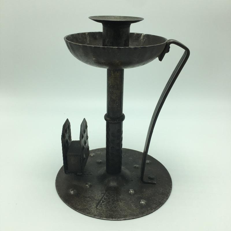 Trio of metal candle holders. This lot includes a large metal candleholder with an attached match holder and two smaller candleholders made of copper. No markings found. Smallest one has a patina.