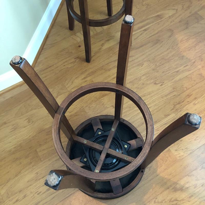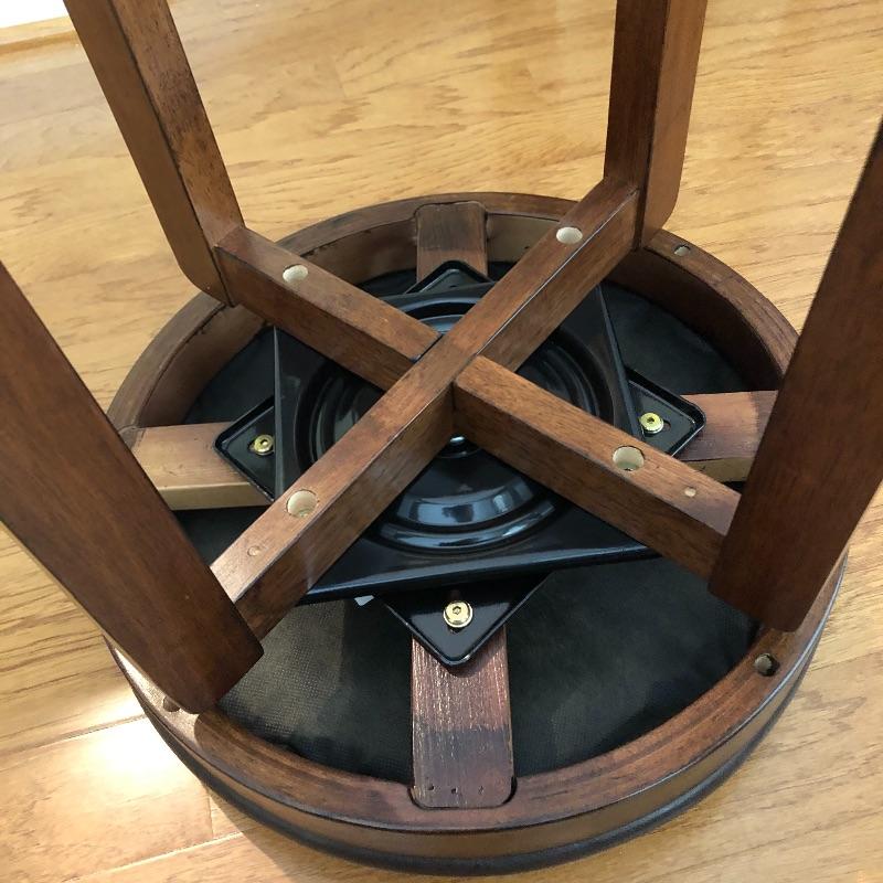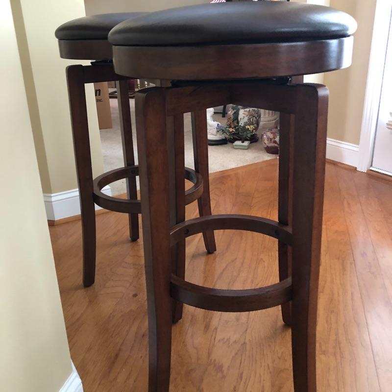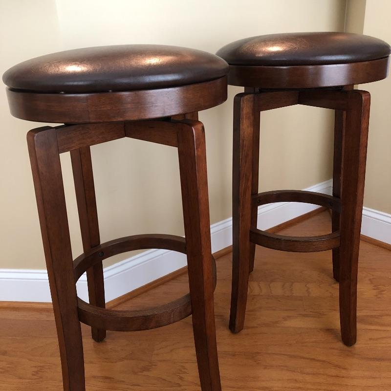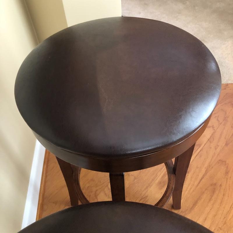 This lot includes two leather and wood swivel bar stools. Height of the stools are approximately 30”. The diameter of seats are 16.5”. Local pick up only.