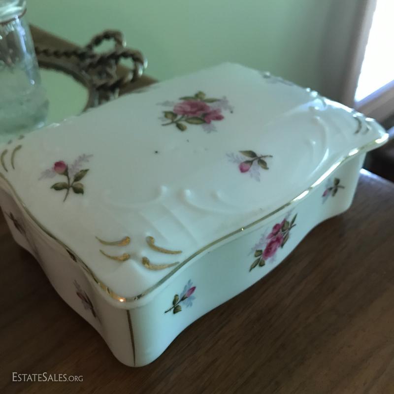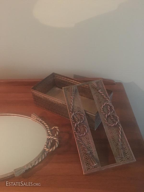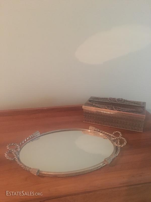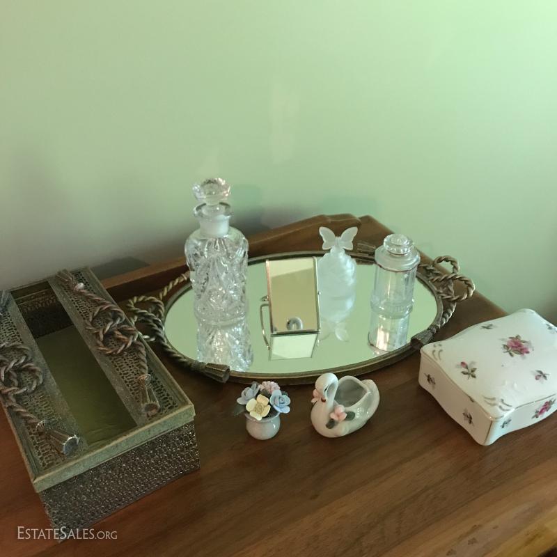 Vanity lot includes three vintage perfume bottles, metal and mirror vanity tray, tissue box holder and white porcelain box with painted flowers and matching swan and flower vase.