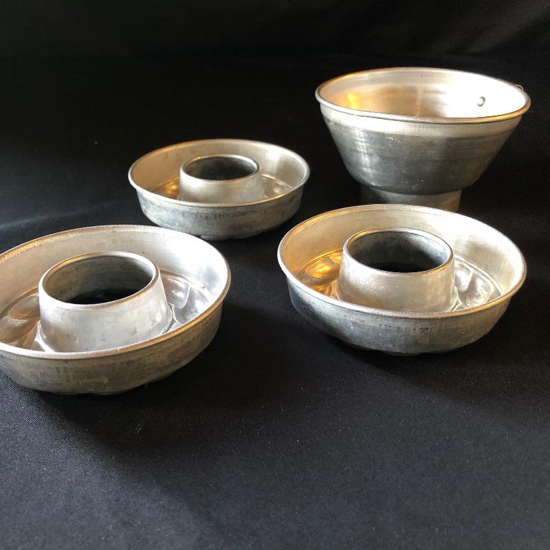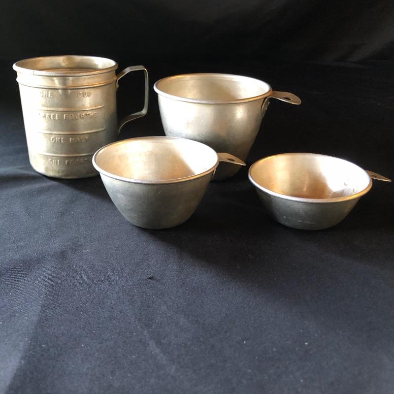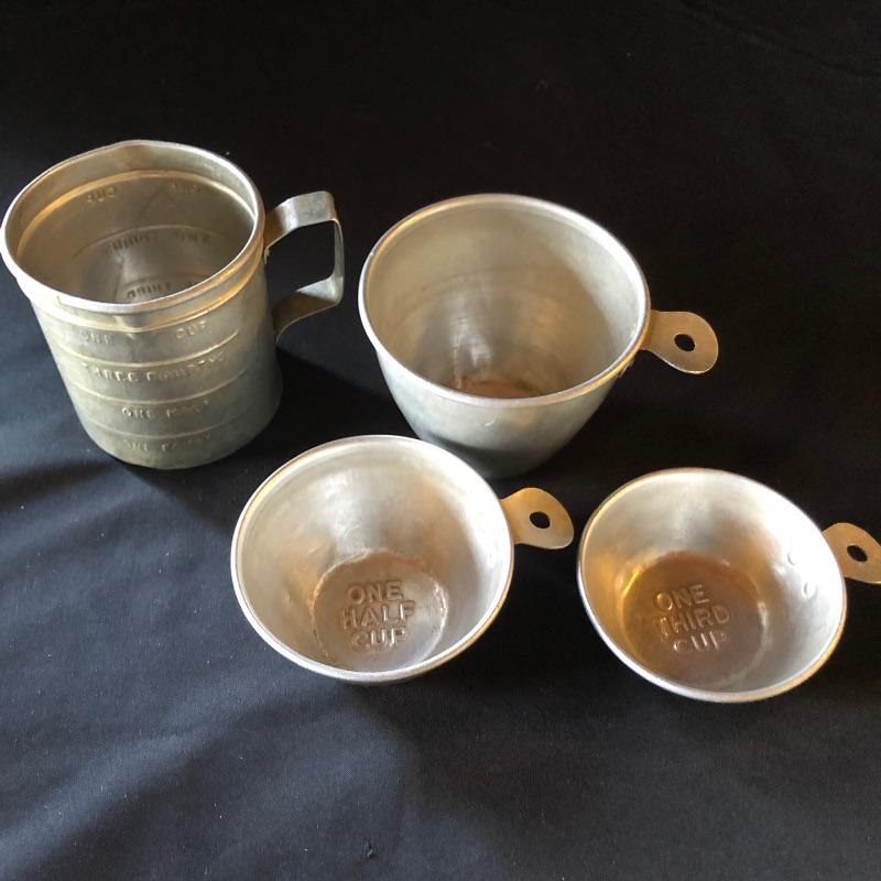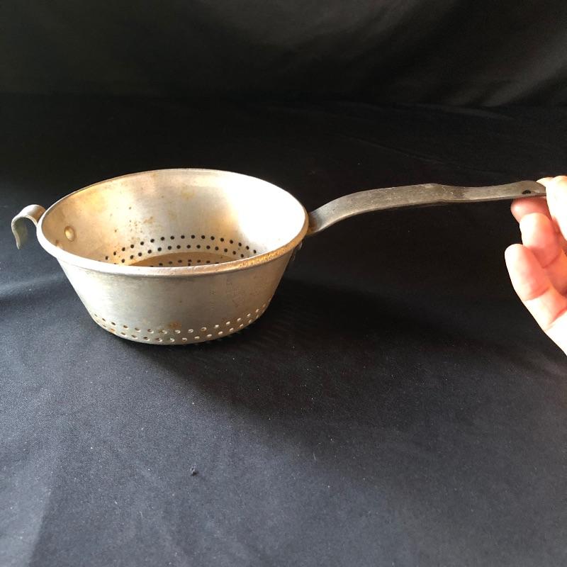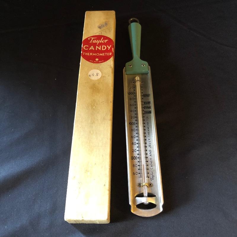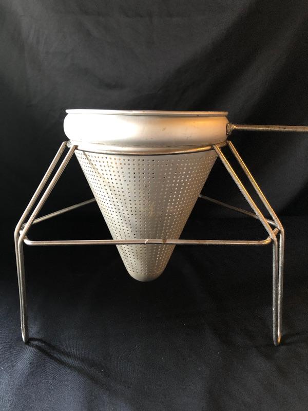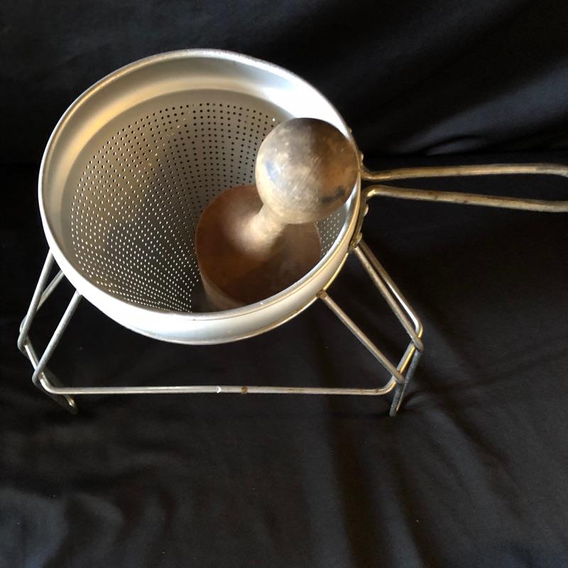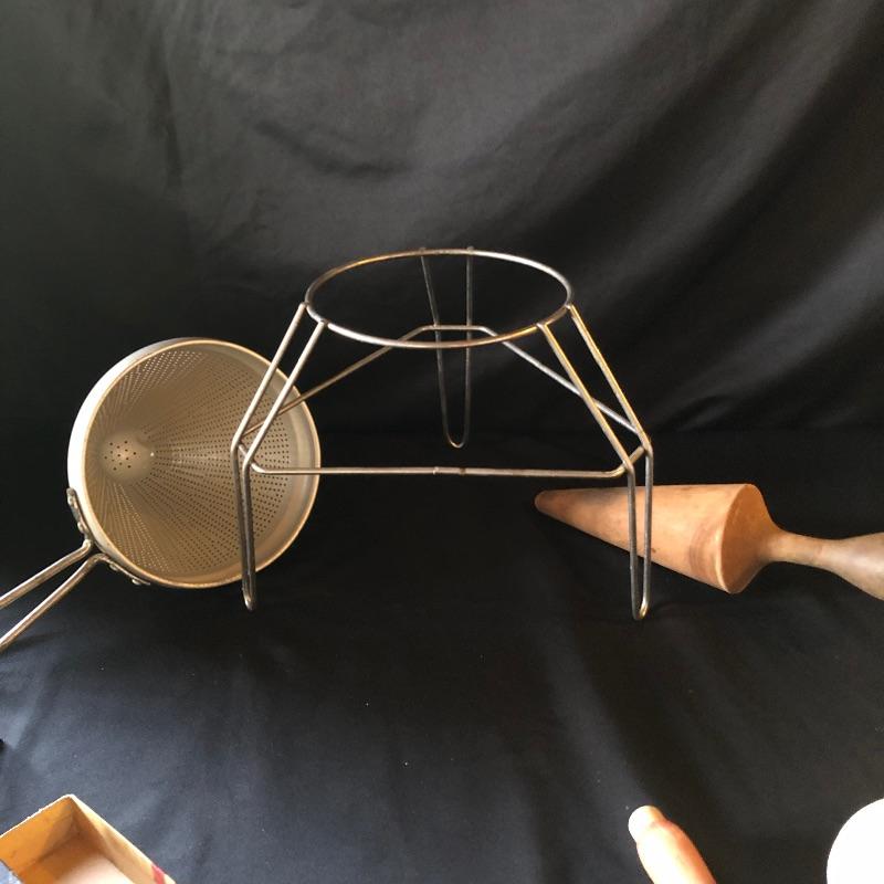 They don’t make them like they used to! This great collection of vintage kitchen items were built to last and will add old world charm to your home. The cone shaped sieve with stand comes complete with wooden pestle. Also included are a couple of wooden rolling pins, a vintage jam jar holder, an antique Taylor Candy thermometer and various aluminum jello molds and measuring cups and more, see images.