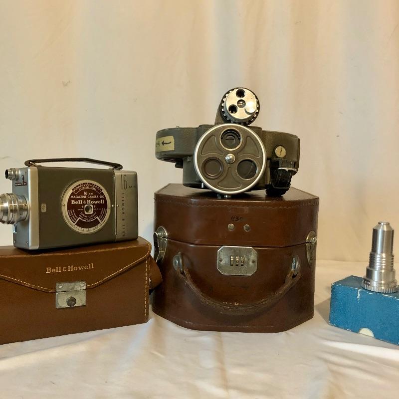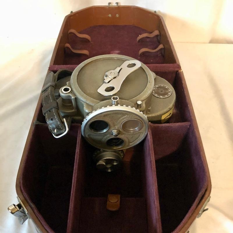 This pair of vintage Bell & Howell cameras are a rare find indeed! The 70 DR is a Filmo movie camera that comes with its splendid original case that is such good condition for its age. The box has a built in combination that is unknown and is missing one of its two clasps, see images. The smaller camera is a 16 mm magazine camera that also comes with its original case. Last but not least we have included a 16 mm Super Proval 2 inch lens. See images for more information.