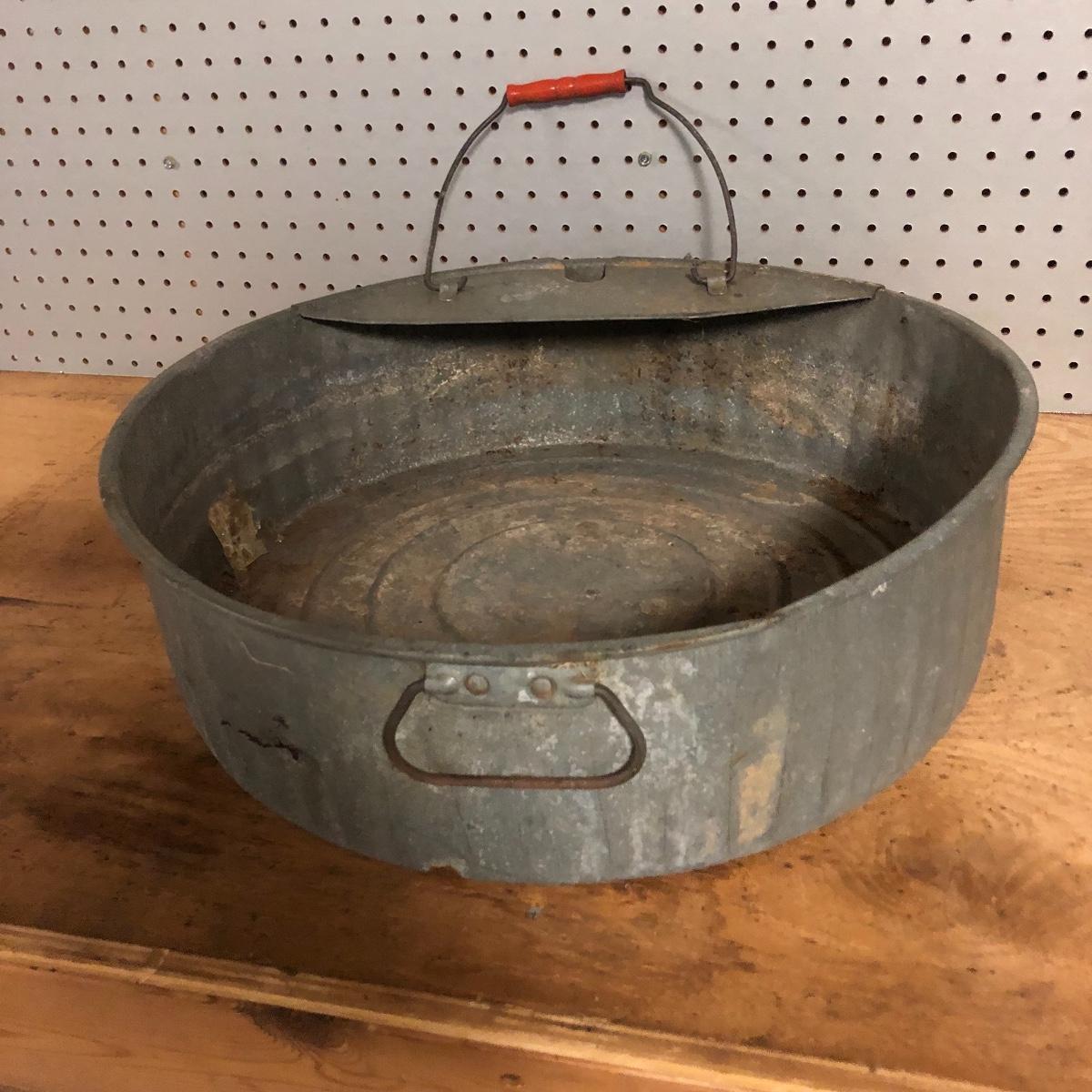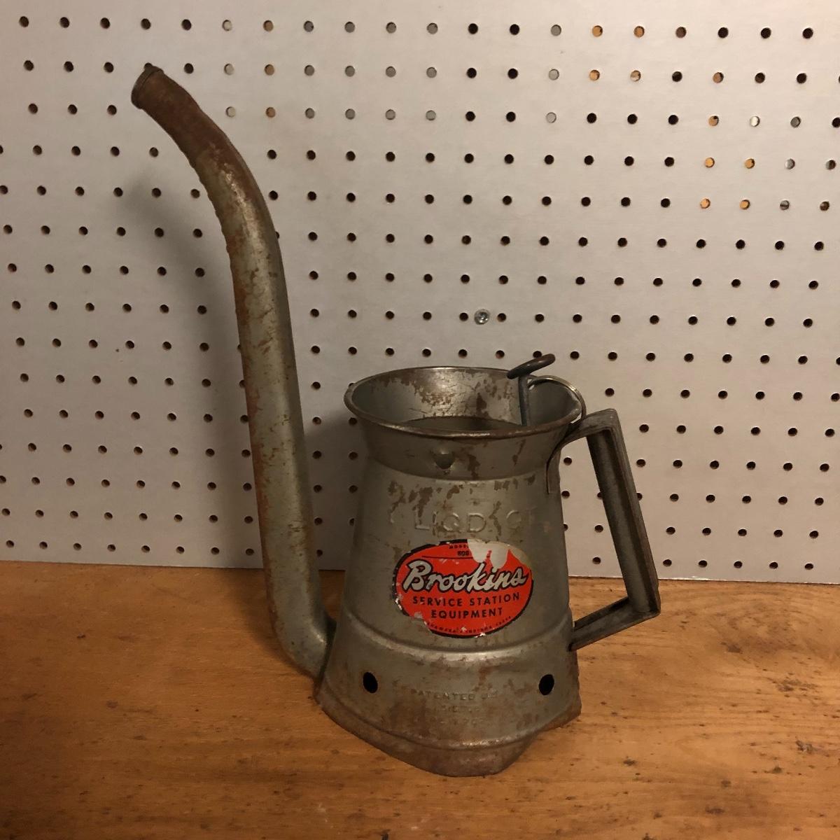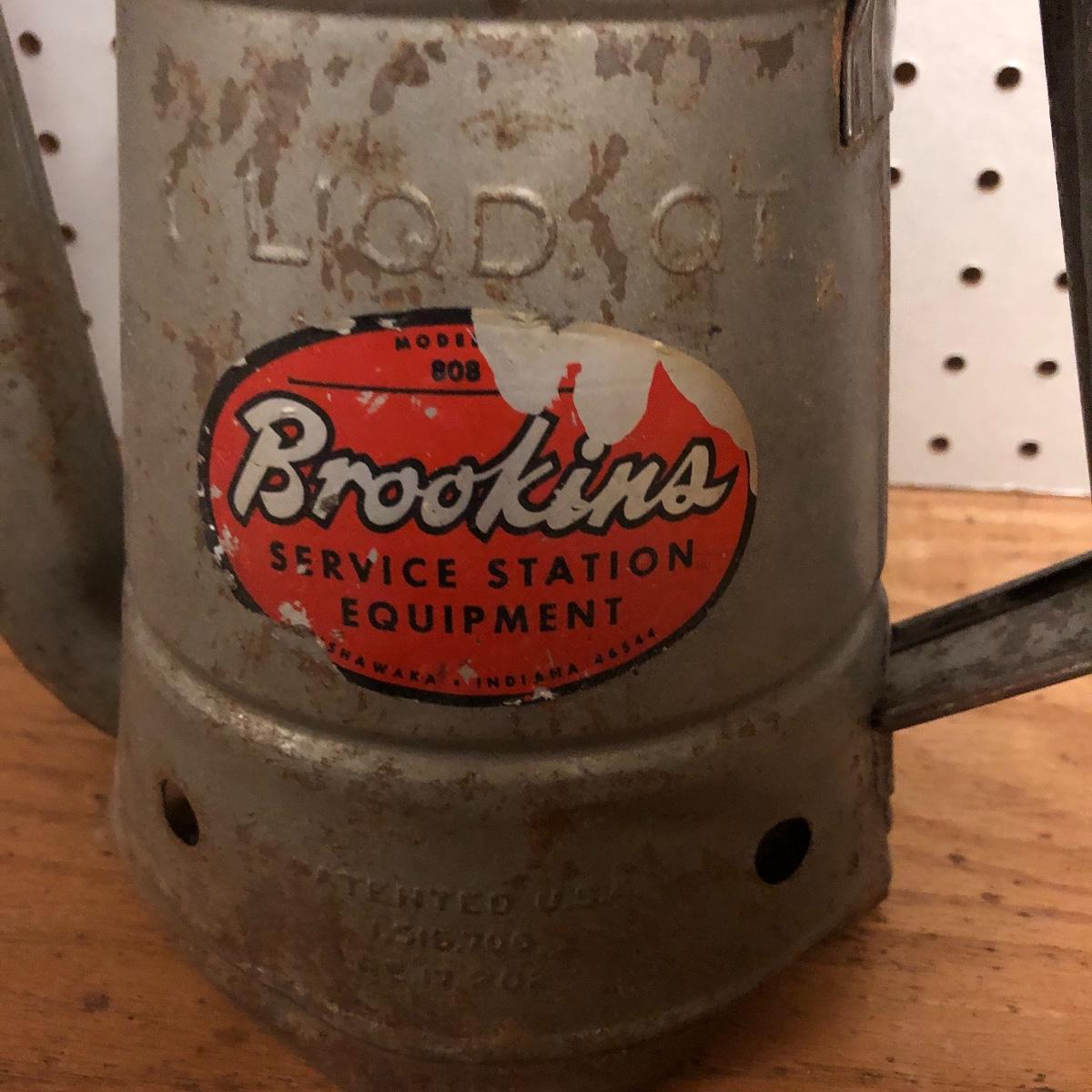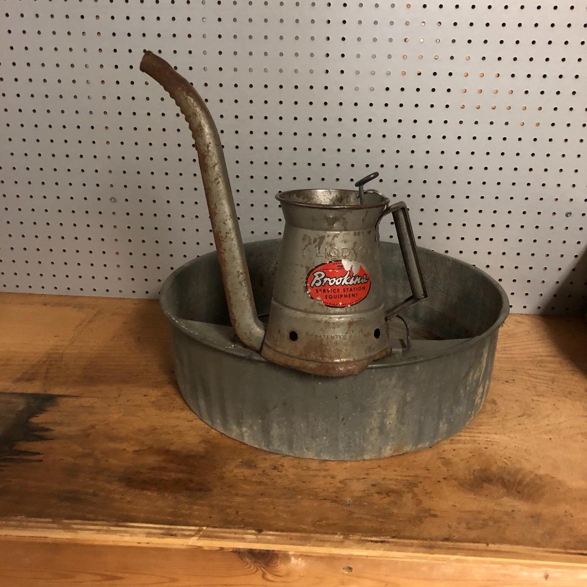 Go old school with this vintage pair. The lot includes one Brookins one quart oil can and a Brookins drain pan. Both items have some scratches and dents, but overall look good. Drain pan measures 19”D x 6”.