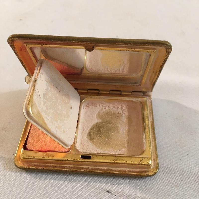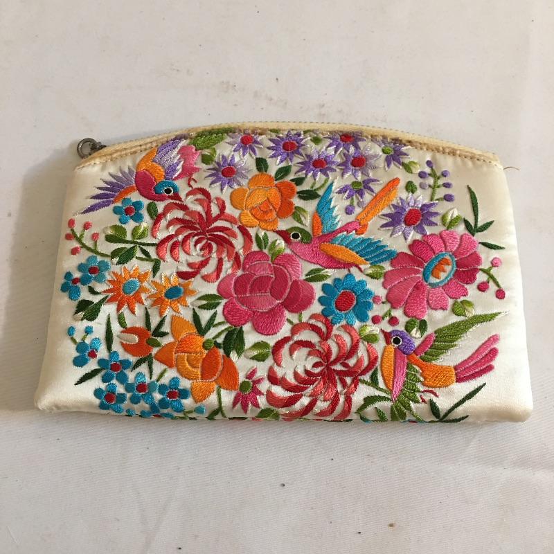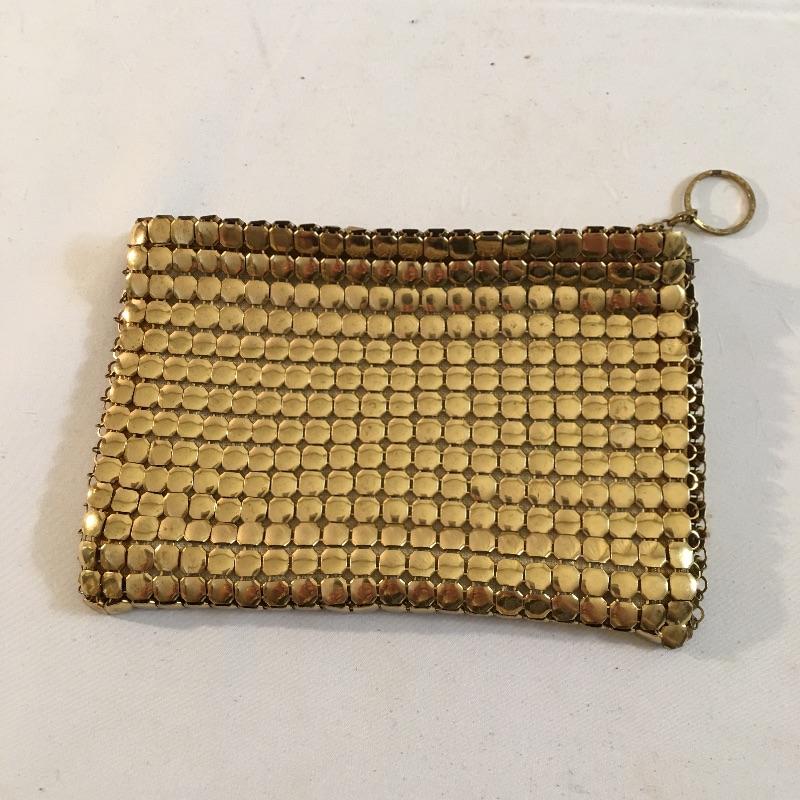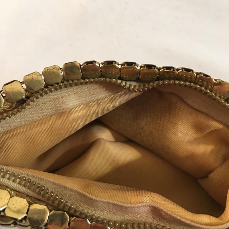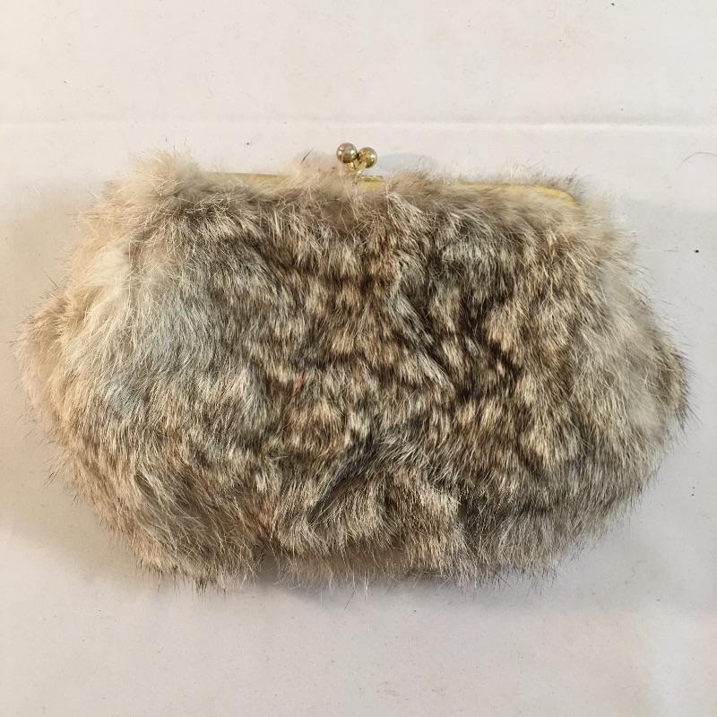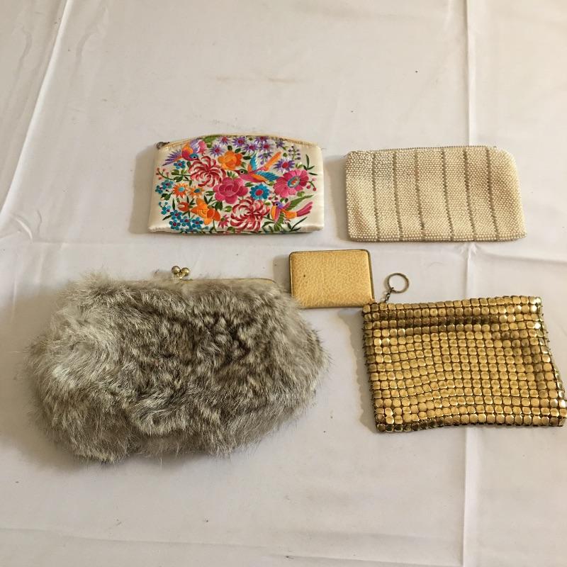 Delightful collection of vintage clutches includes one beaded clutch, hummingbird design clutch, gold colored metal squares clutch and what appears to be a fur covered clutch. Also includes small compact makeup case with mirror. Largest clutch measures 6” x 8”.