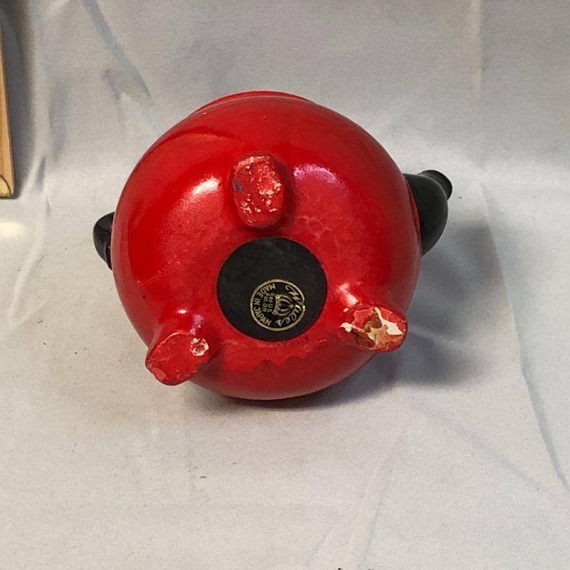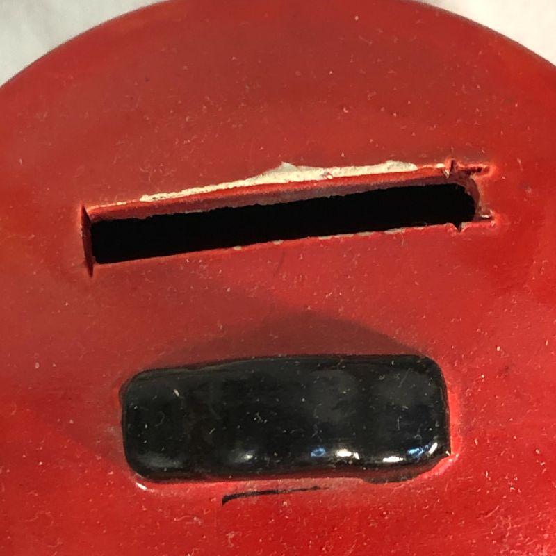 This bank is in excellent condition. There is a tiny bit of paint chipping around the coin slot, and the rubber stopper is dry and hard (but intact and whole). It is about 4.5" tall.