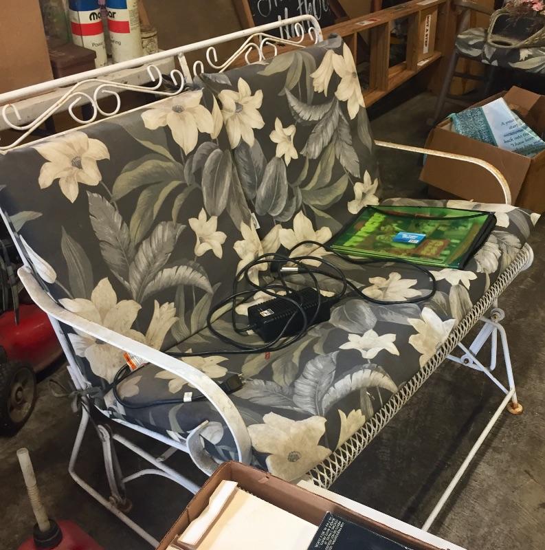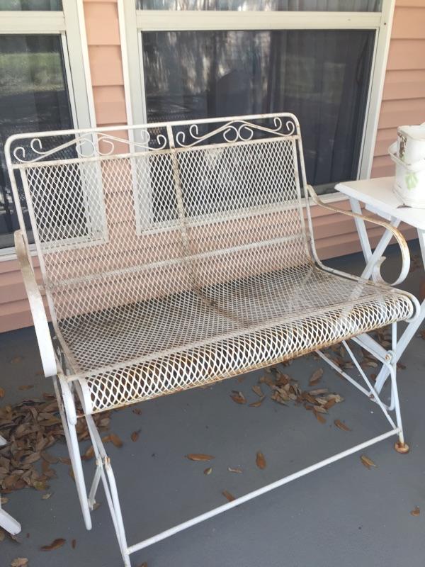LOT #65. Vintage white wrought iron glider with cushions. A Two-seater, works great! Some rust; new cushions. 41” W