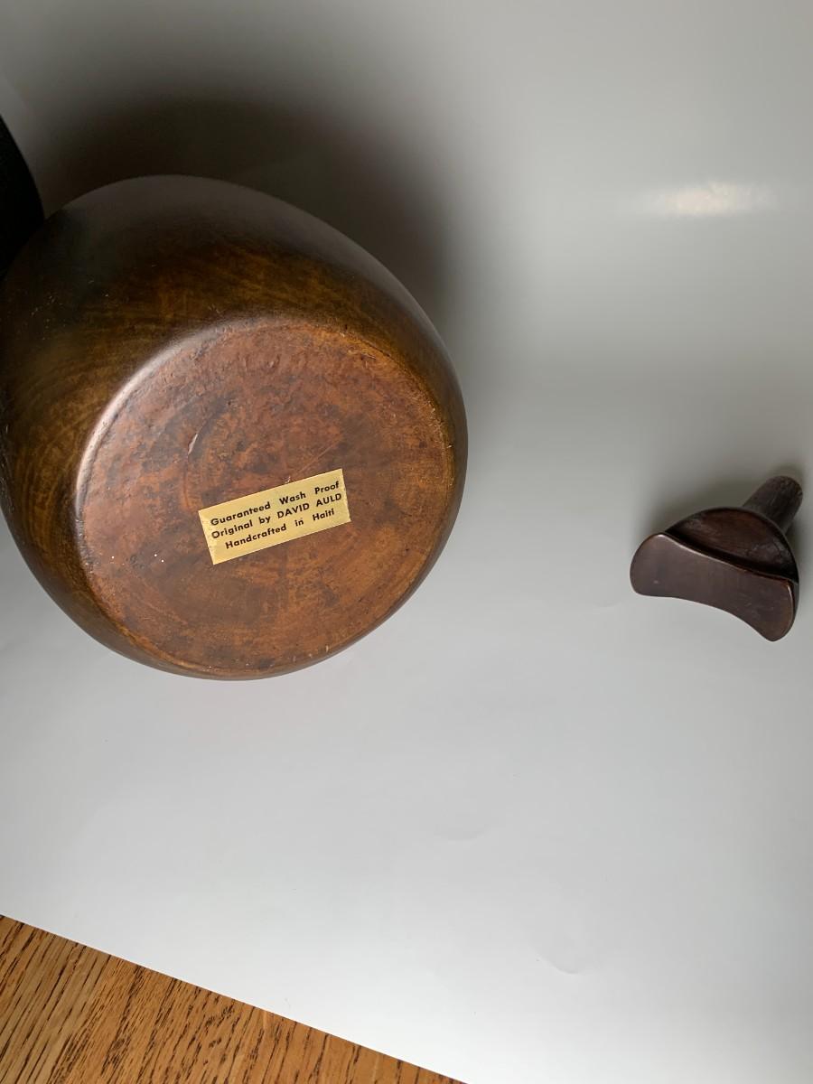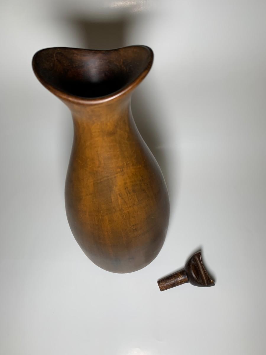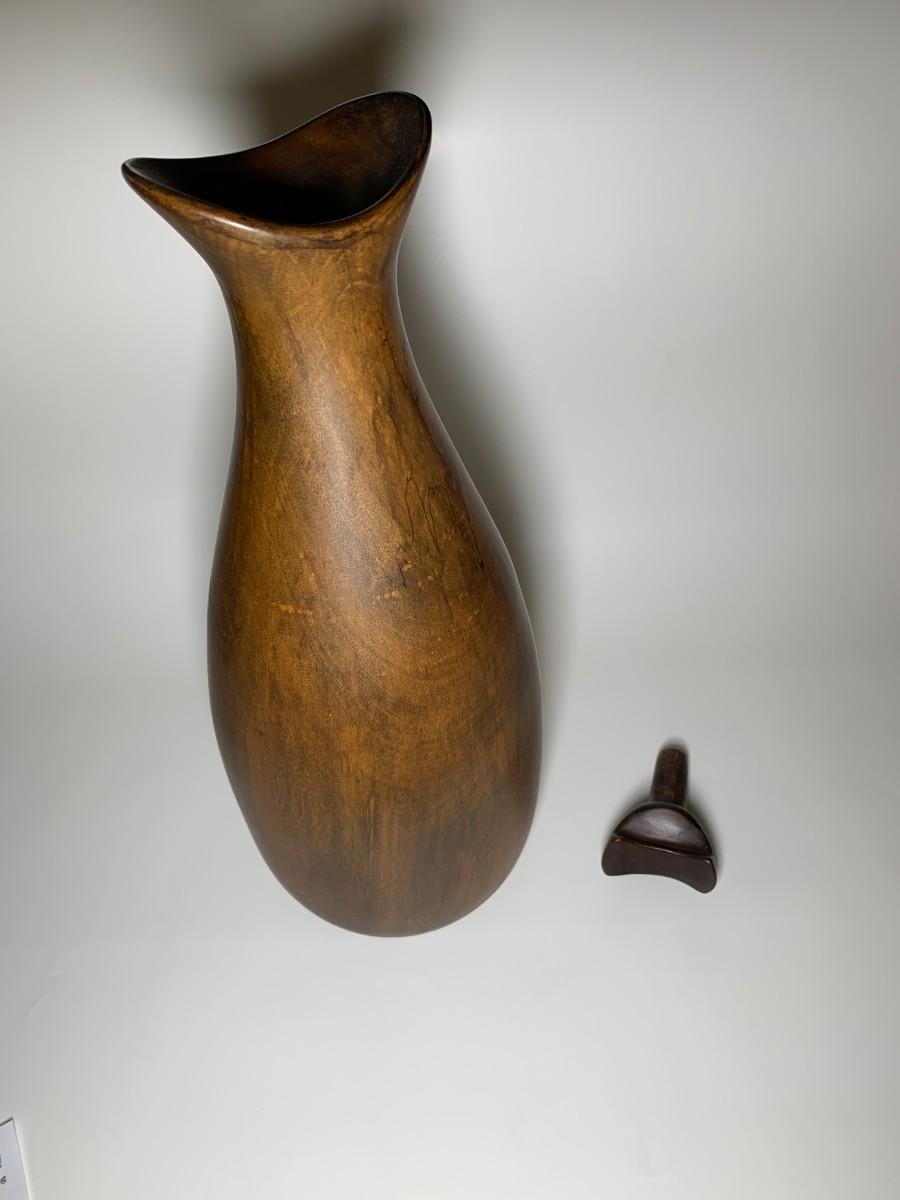 Wood decanter and lid, beautifully crafted from Haiti. Approximately 15"h.