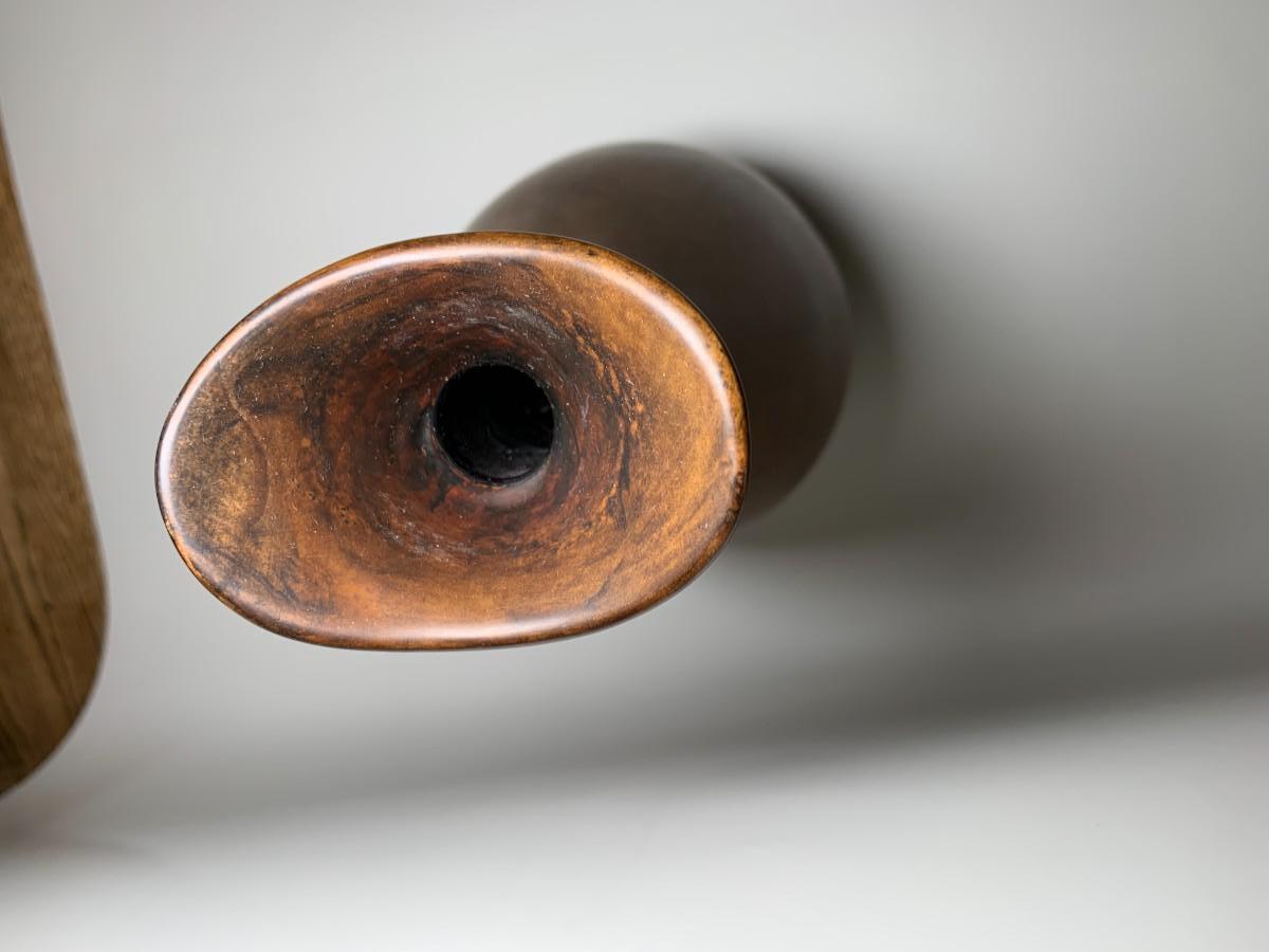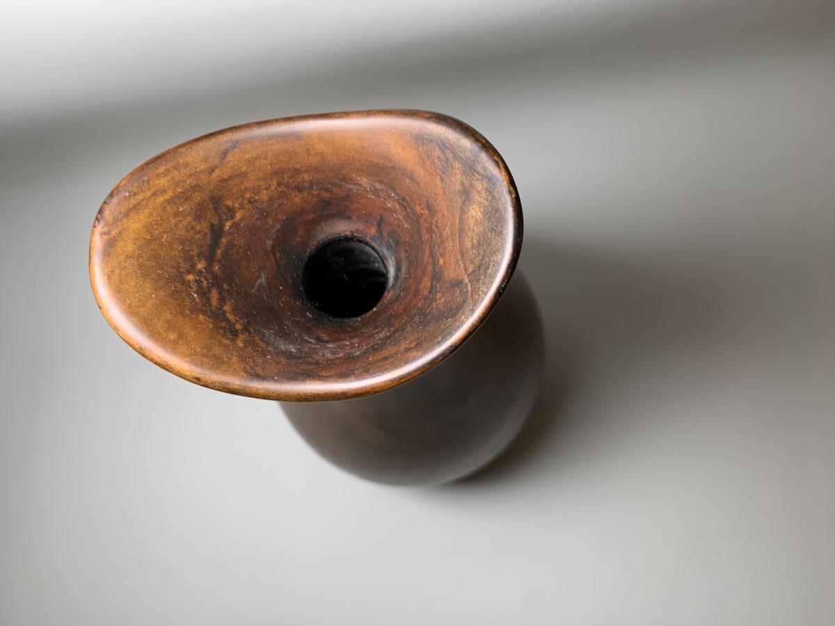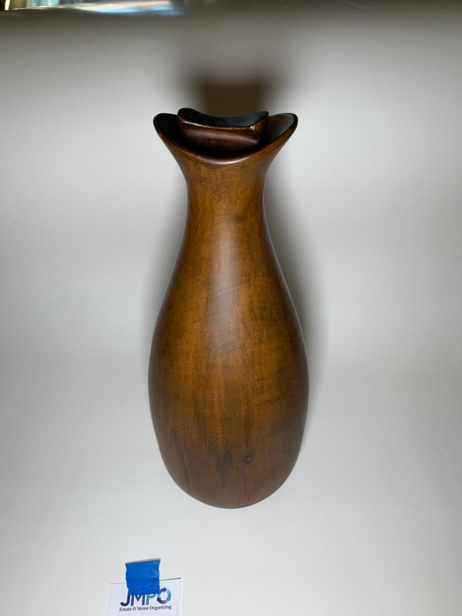 Wood decanter and lid, beautifully crafted from Haiti. Approximately 15"h.