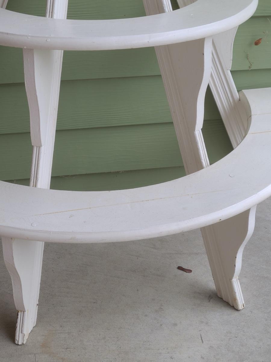 This was handmade and stands about 40 to 48 inches tall. We were unable to get measurements so that is a best guess. Solid and perfect for antique collectibles or plants.