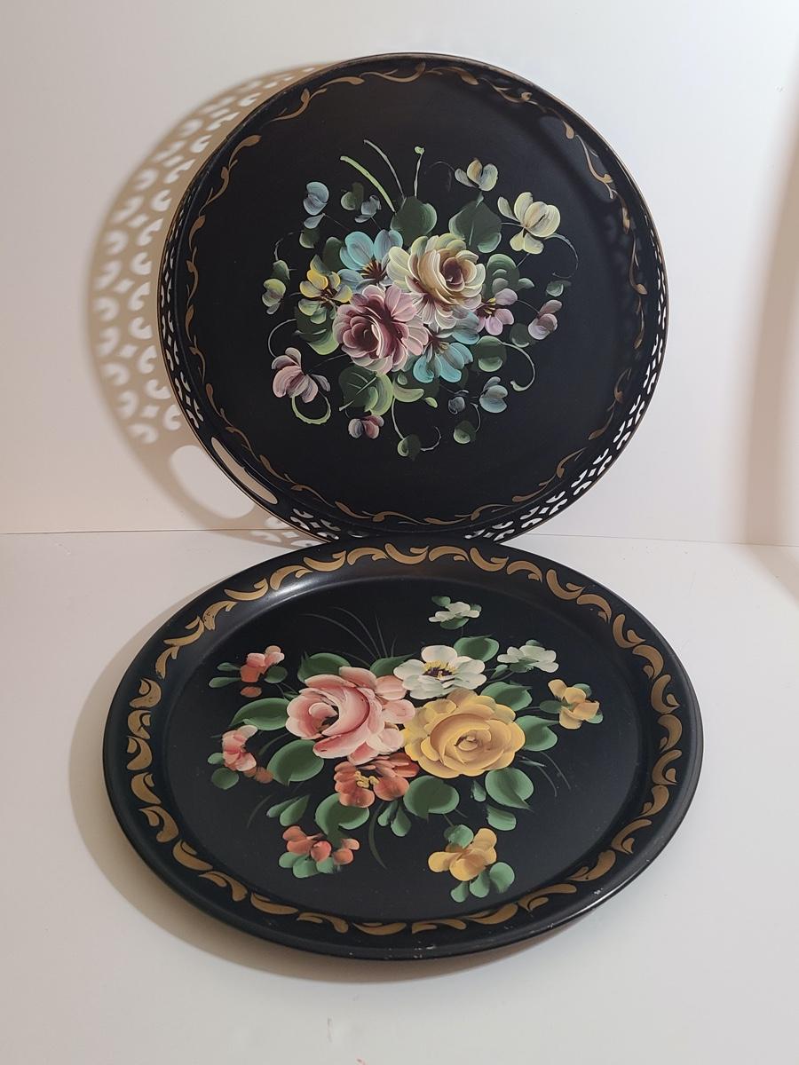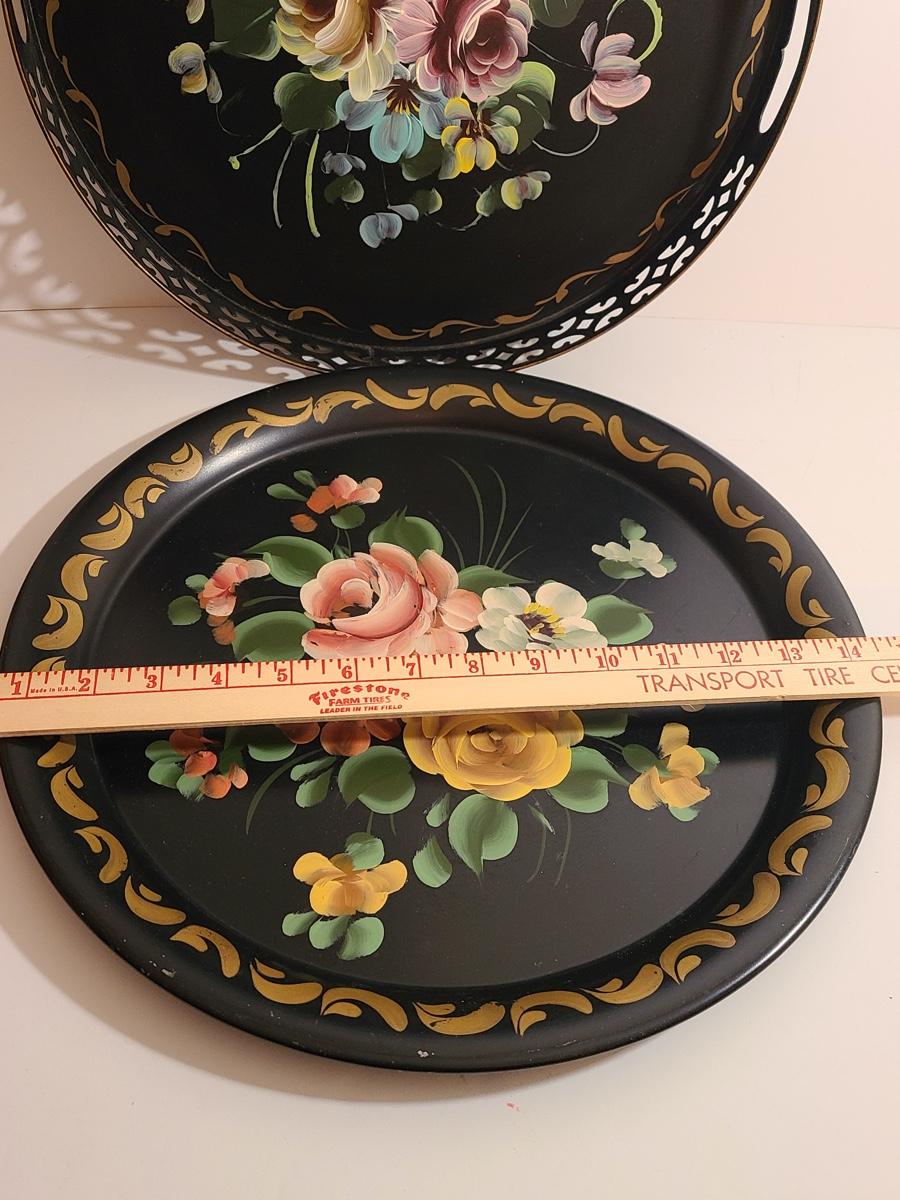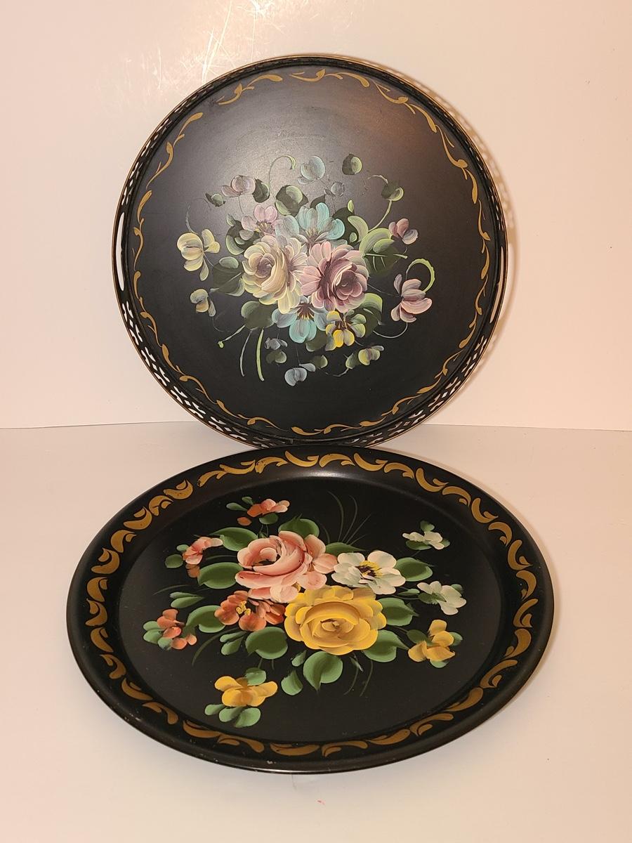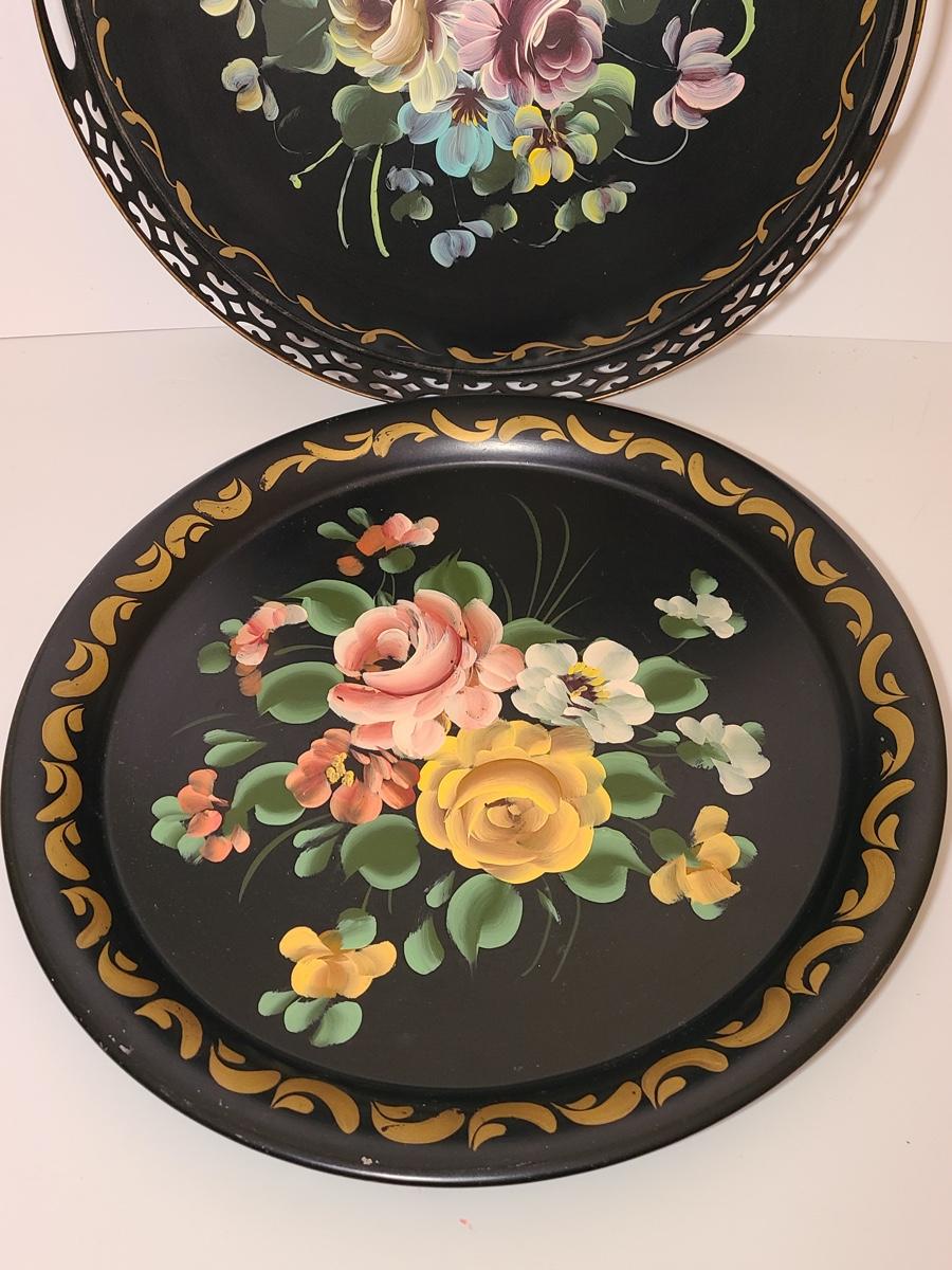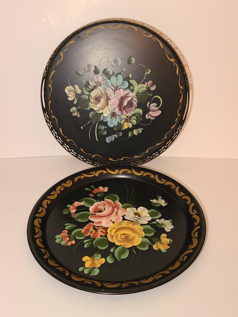 Two lovely hand painted metal trays. One is flatter, and the other has sides. These are perfect for tea-service, to use as a coffee table tray, or beverage tray. All Holiday items in this auction are as-seen. The client collected a lot of holiday pieces and some are new in box, some were displayed once and come with original box, and some have been displayed and come with no box. They are all pre-owned in some fashion and have been stored in an attic or on shelf in library. Please see all pictures. The pictures show condition, measurements if taken, and what is included in the lot. Due to the large amount that we photograph and the time frame, we are not always able to take measurements. All items unless noted, are pre-owned and have been used. Thank you