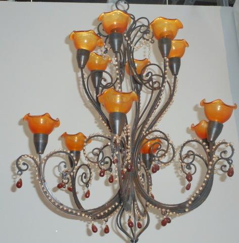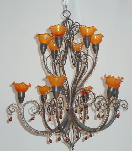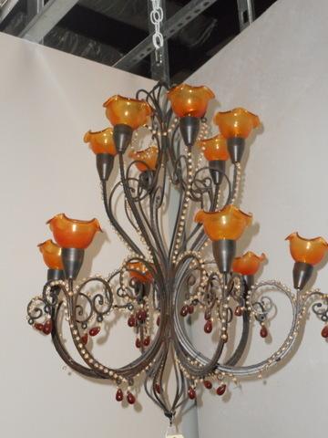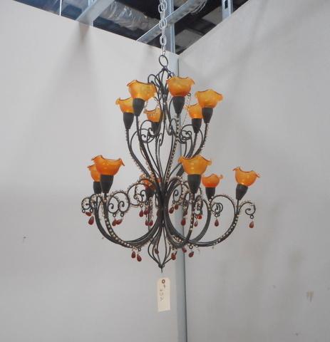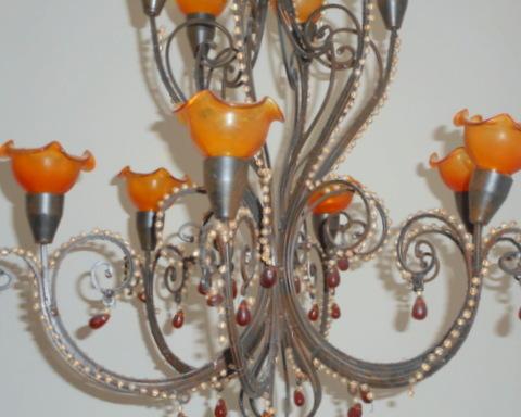 Lot 652 - Multi Armed Amber Glass + Bead Hanging Chandelier