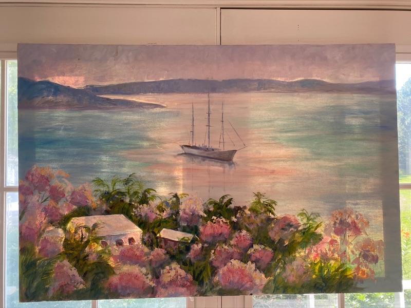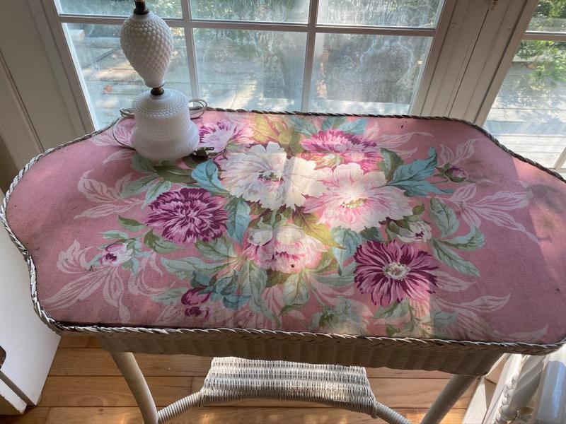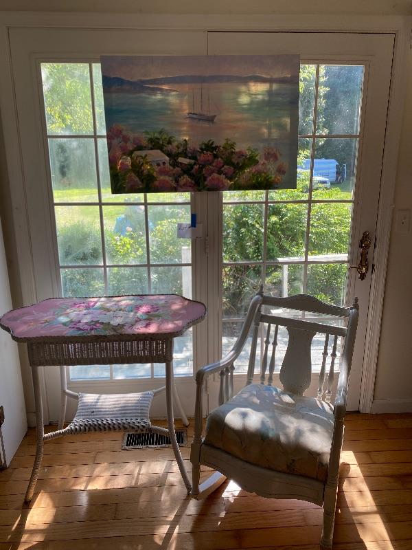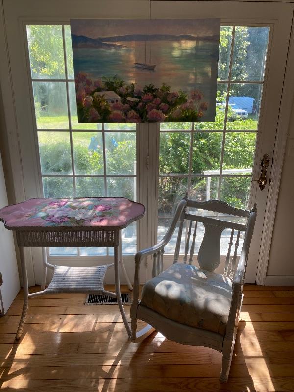 Antique wicker table, rocker and Oil on canvas painting by M. McNamara with white milk glass lamp