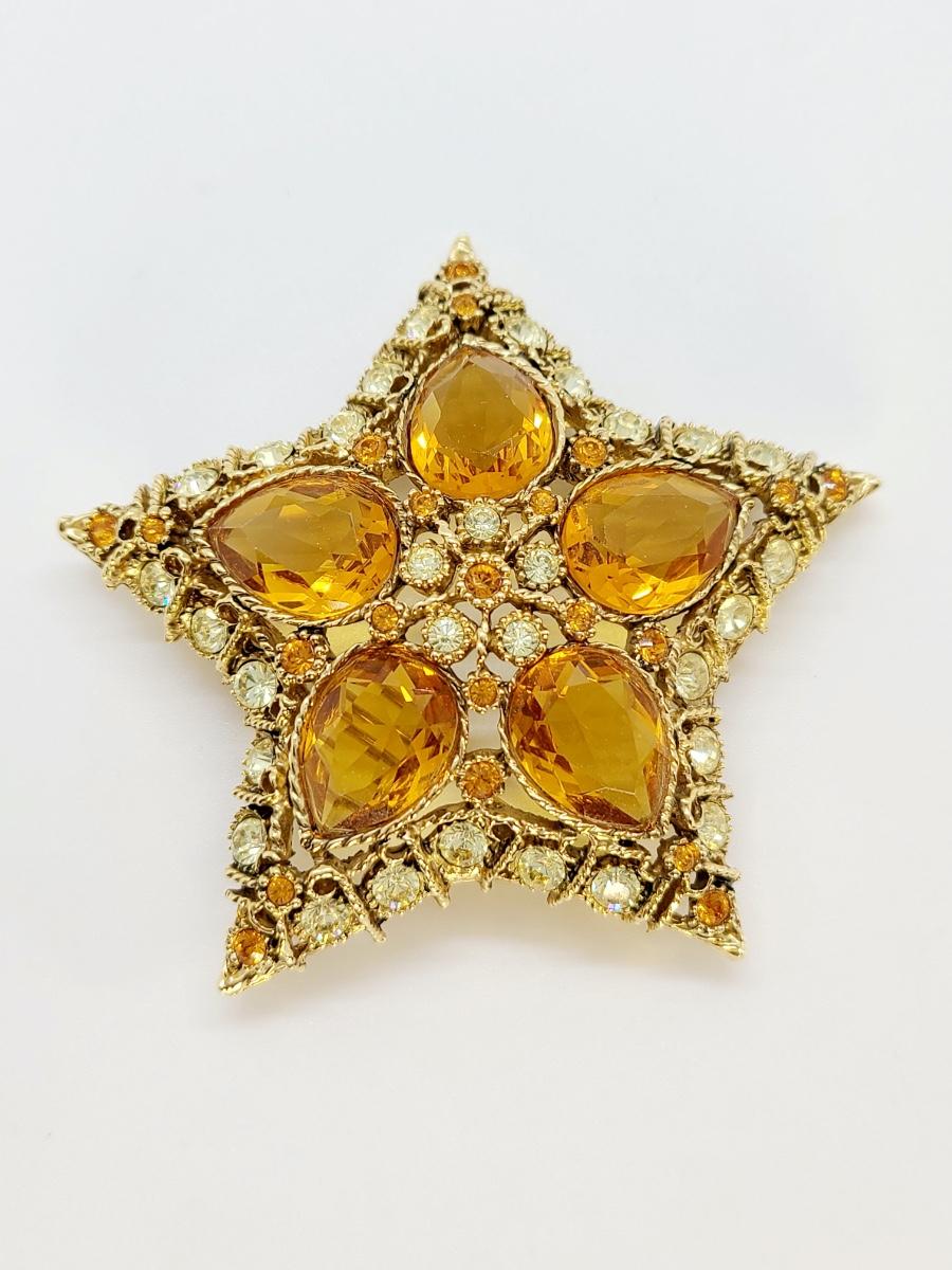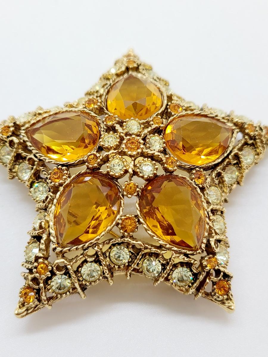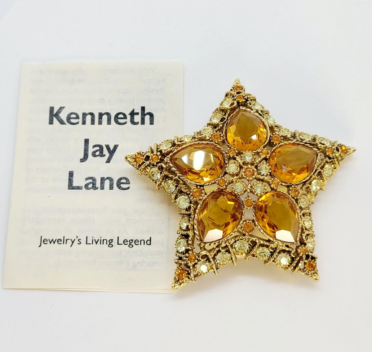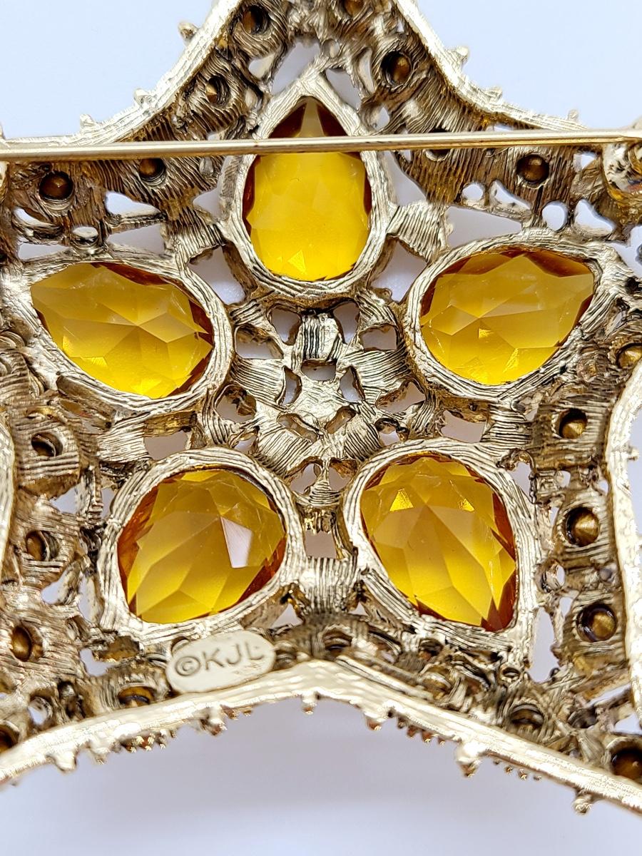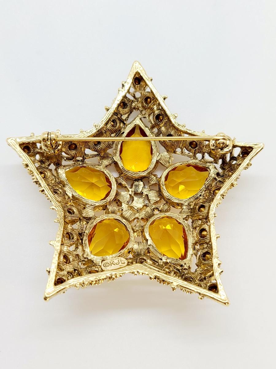 Signed KJL Topaz Rhinestone Gold Star Pin/Brooch. The pictures show condition, measurements if taken, and what is included in the lot. Due to the large amount that we photograph and the time frame, we are not always able to take measurements. All items unless noted, are pre-owned and have been used, and are untested. Thank you