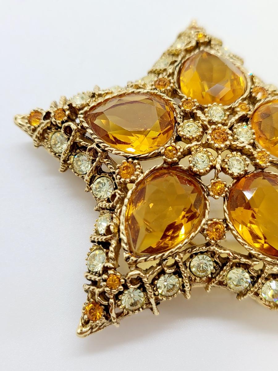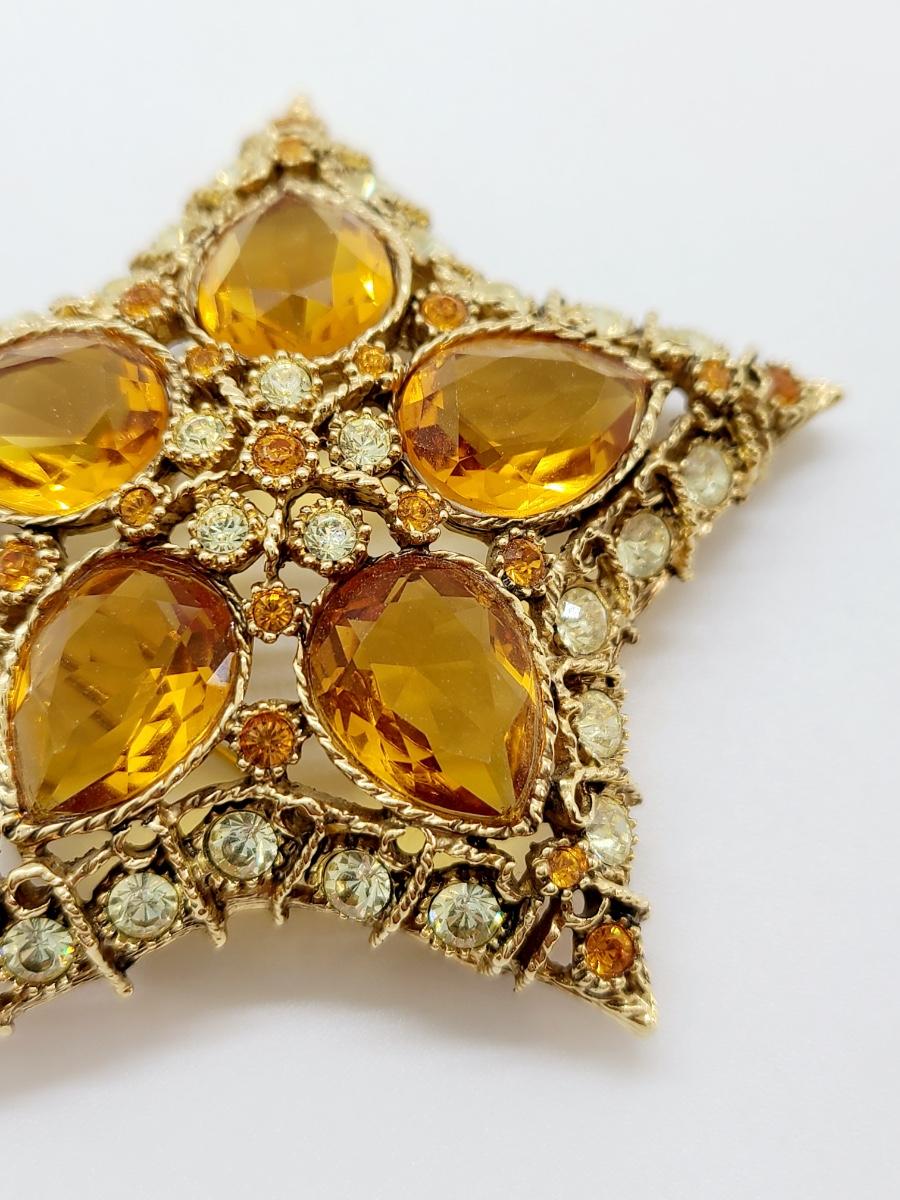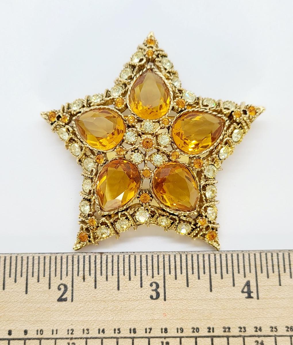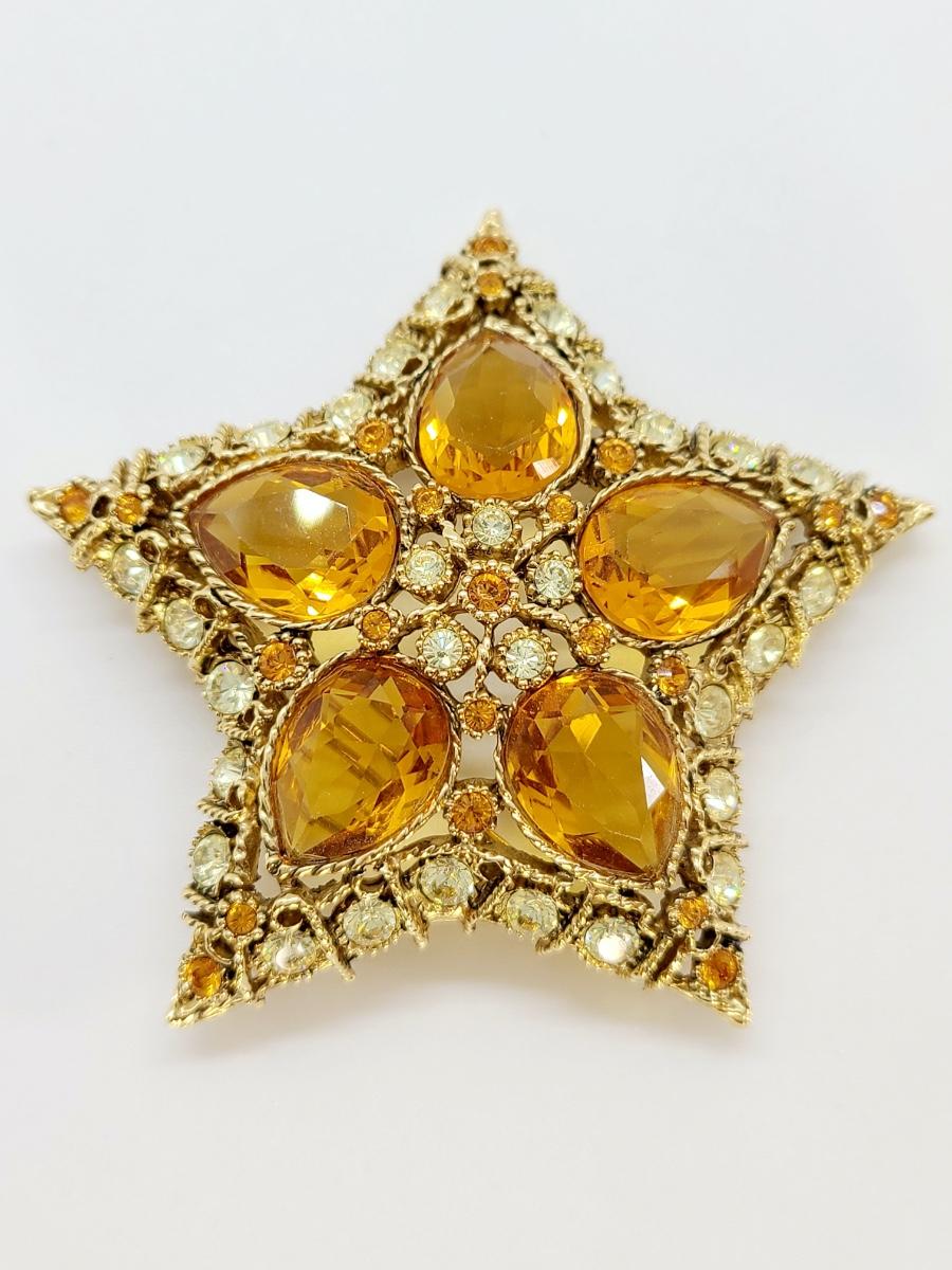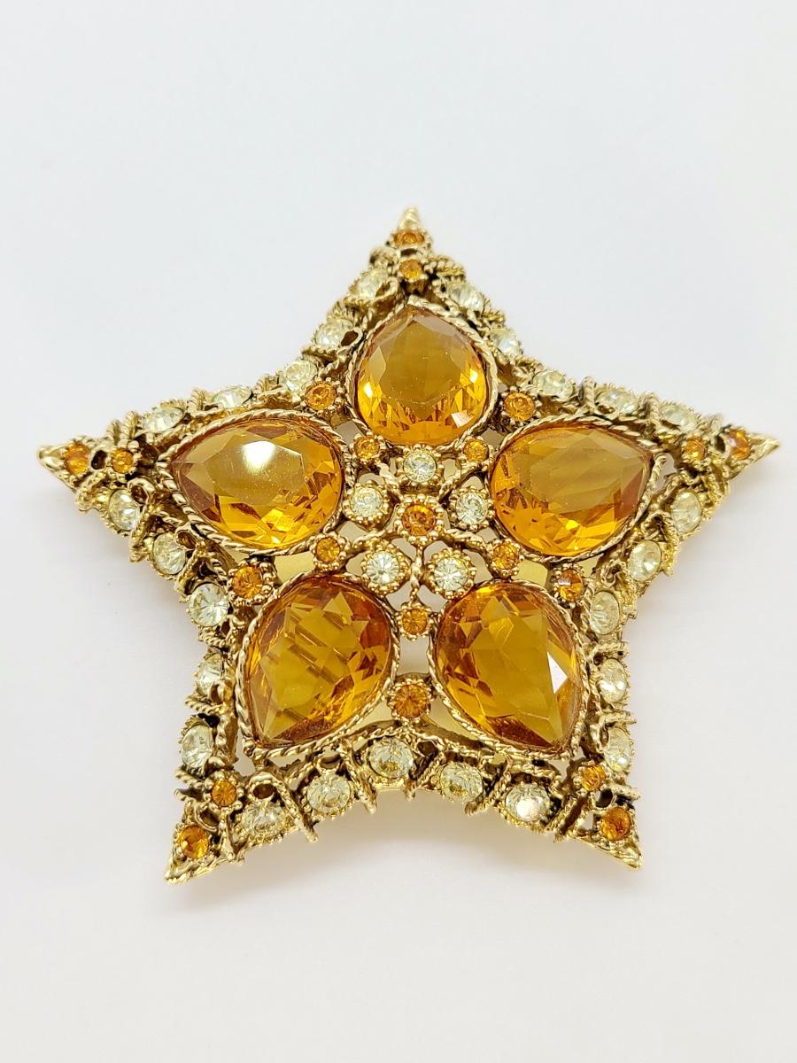 Signed KJL Topaz Rhinestone Gold Star Pin/Brooch. The pictures show condition, measurements if taken, and what is included in the lot. Due to the large amount that we photograph and the time frame, we are not always able to take measurements. All items unless noted, are pre-owned and have been used, and are untested. Thank you