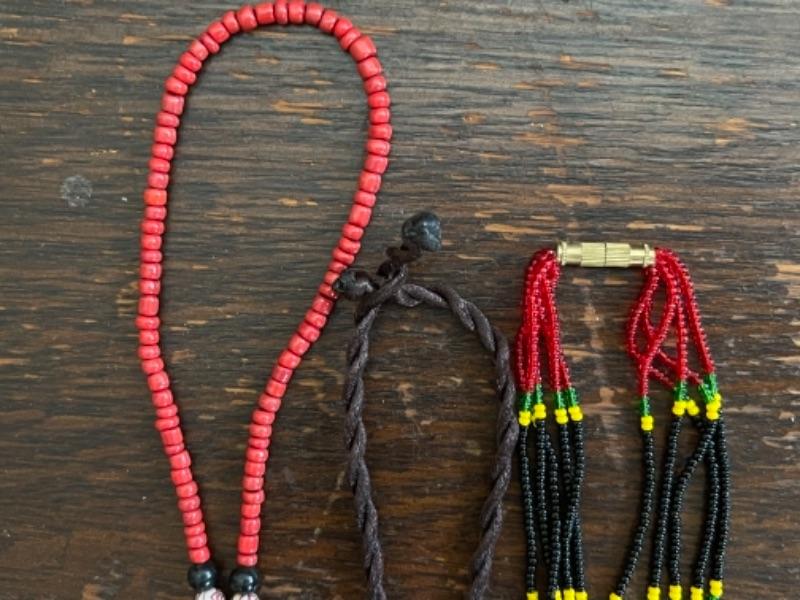 Lot 65LD. Assorted red beaded costume jewelry and red/orange jade bracelet“” $24