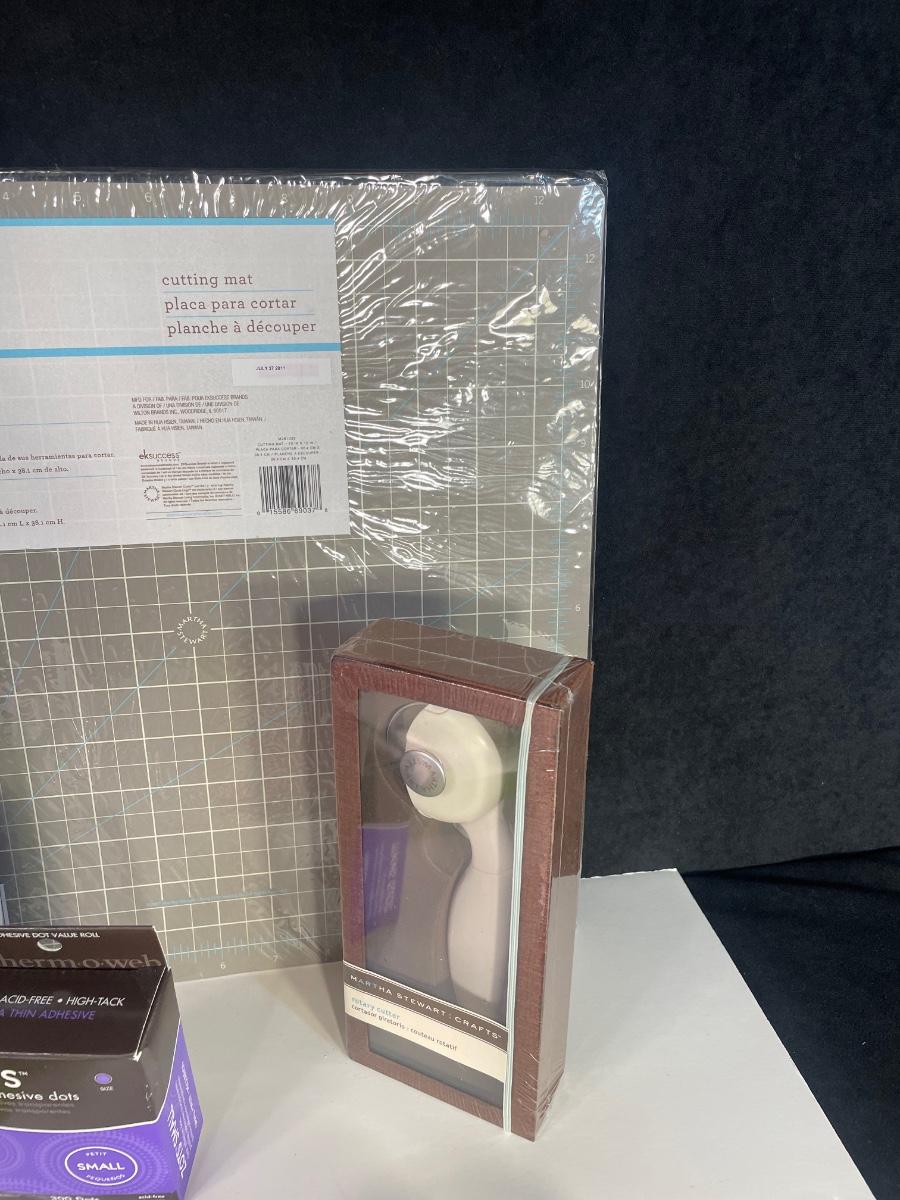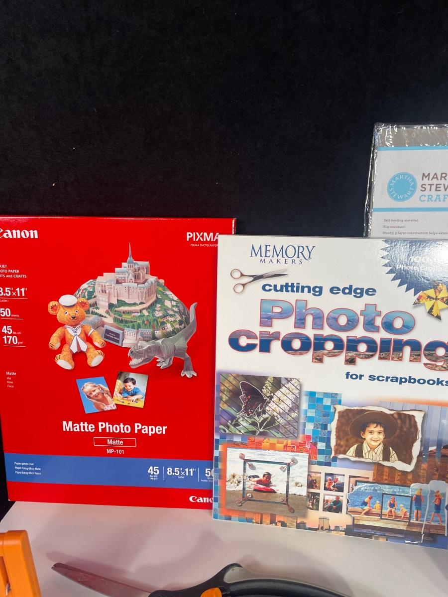 Martha Stewart cutting mat and cutter (new), lots, scrapbooking tape, foam tape, scissors, photo cropping instruction book, scissor sharpener and photo printer paper